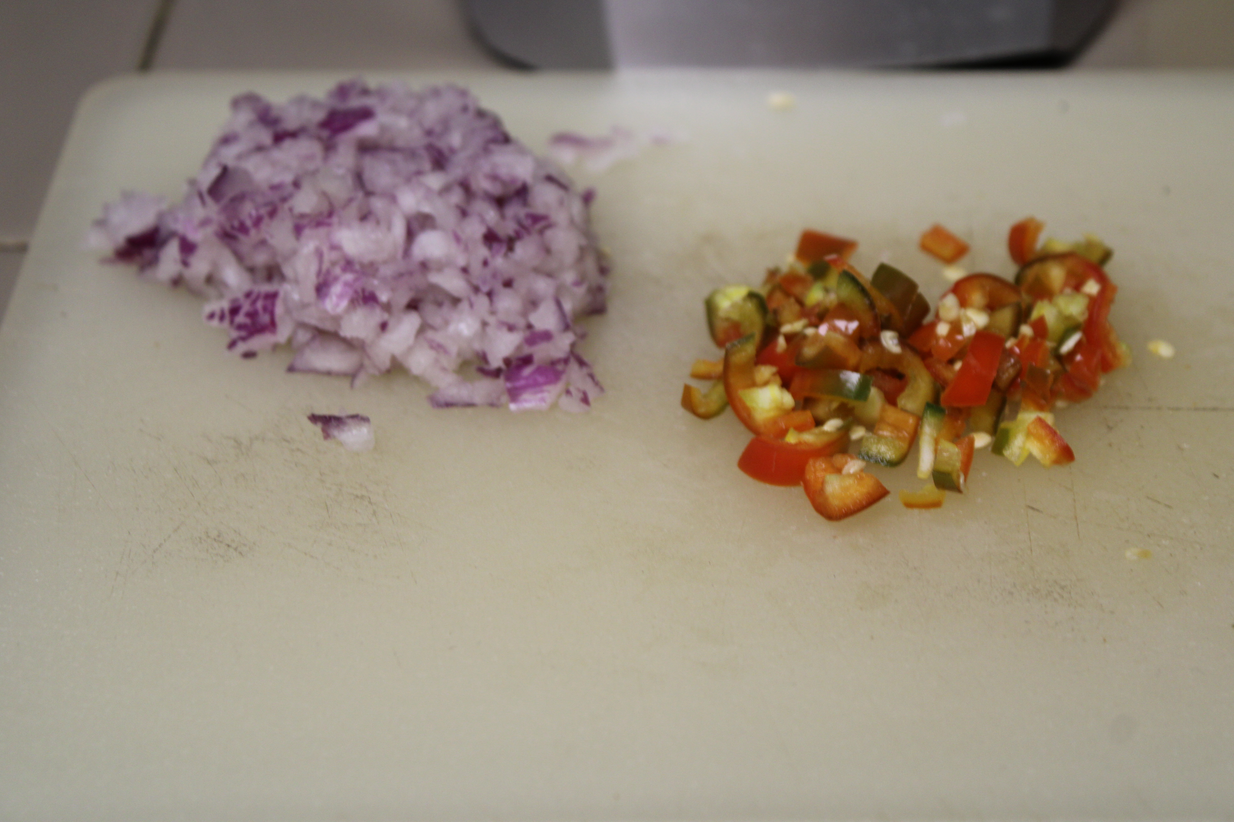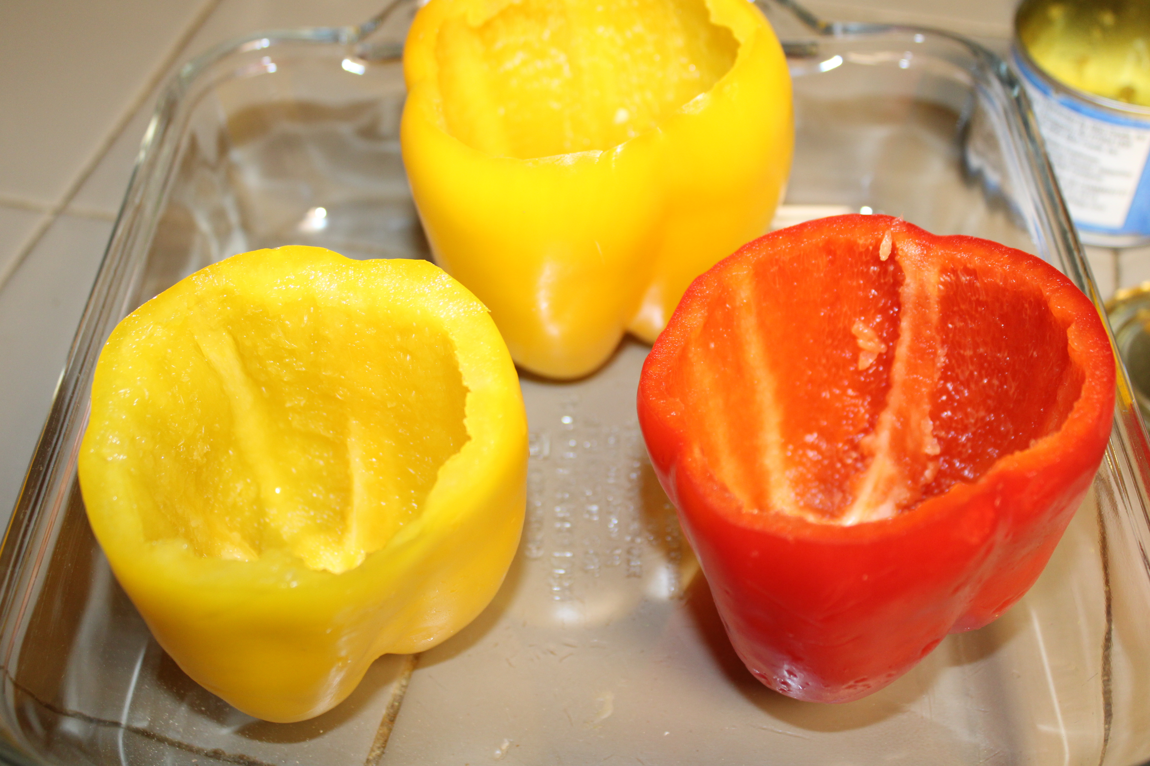 Cut onion in half from root to tip, then in half again. Reserve all but a quarter of the onion for another purpose, dice remaining. Stem Serrano pepper, finely dice retaining seeds for extra heat if desired. Place bell peppers on the counter to check stability. Carefully trim as need for an even bottom. Stem bell peppers; hallow out peppers for stuffing. Set aside.