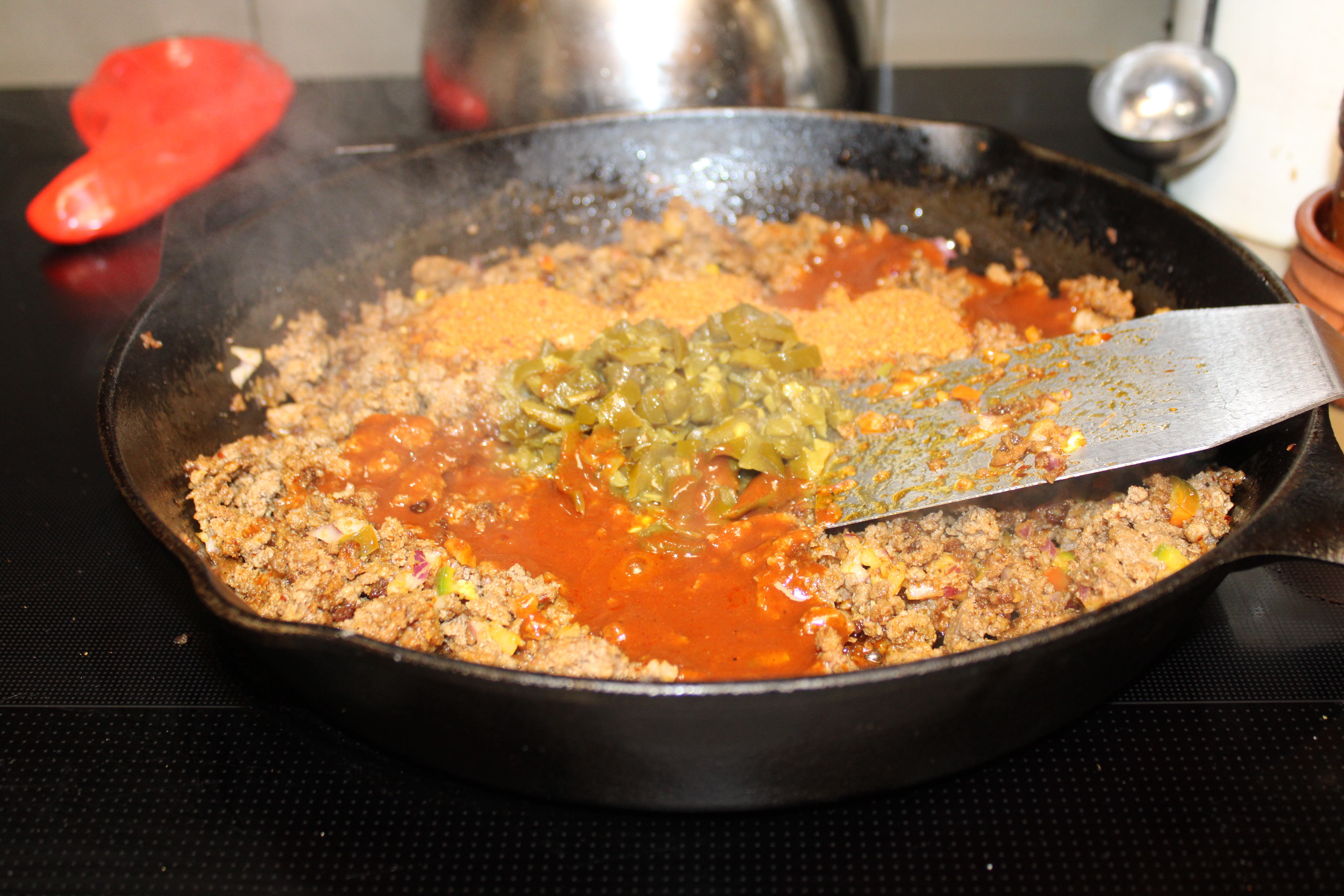 In a cast iron skillet, brown ground beef with chorizo over medium-high heat, breaking meat apart as it browns. Add onions and diced Serrano peppers, continue to cook until vegetables have softened. Drain well to remove as much grease as possible.