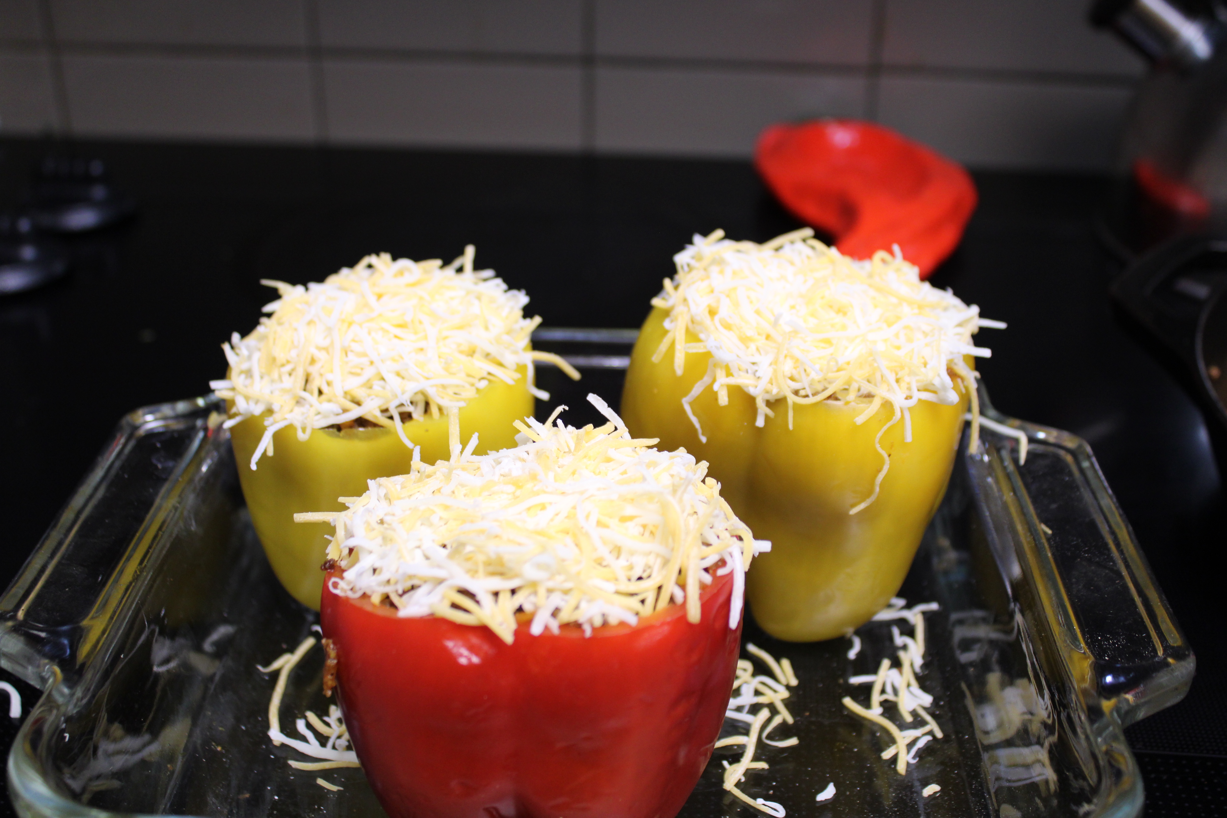 To stuff the bell peppers; start with several spoonfuls of the meat mixture. Top meat with half of the cheese, then remaining meat; leaving room for the remaining cheese. Cover peppers in foil. Bake peppers in the heated oven for about 35 minutes or until bell peppers are softened and the cheese is fully melted over the tops.