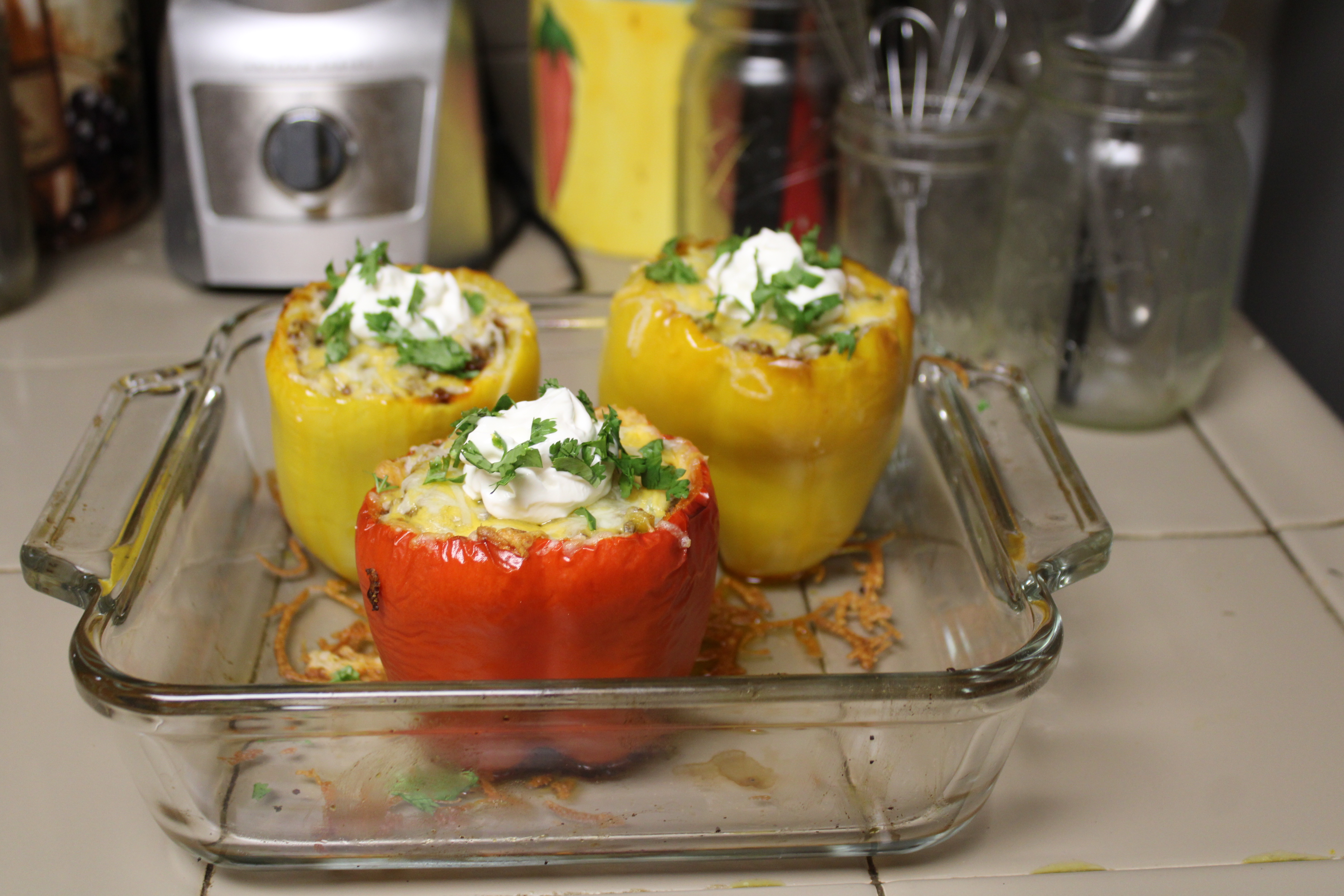 To serve dollop each pepper with sour cream and a scattering of cilantro. Serve stuffed peppers alongside favorites such as refried beans and Mexican Rice.