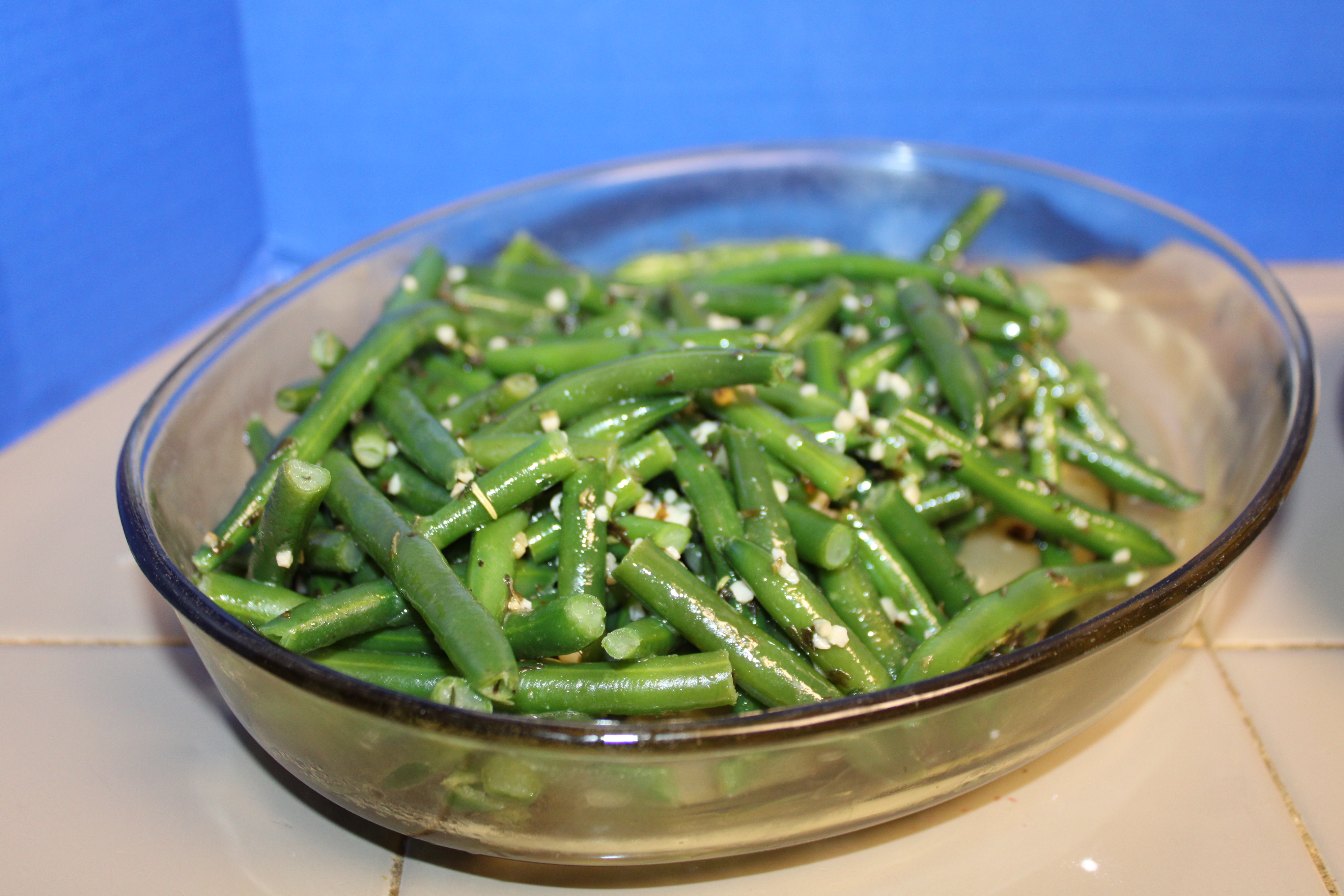 While the green beans are steaming, peel and finely mince garlic. Prepare a bowl of ice water for the beans, set aside.