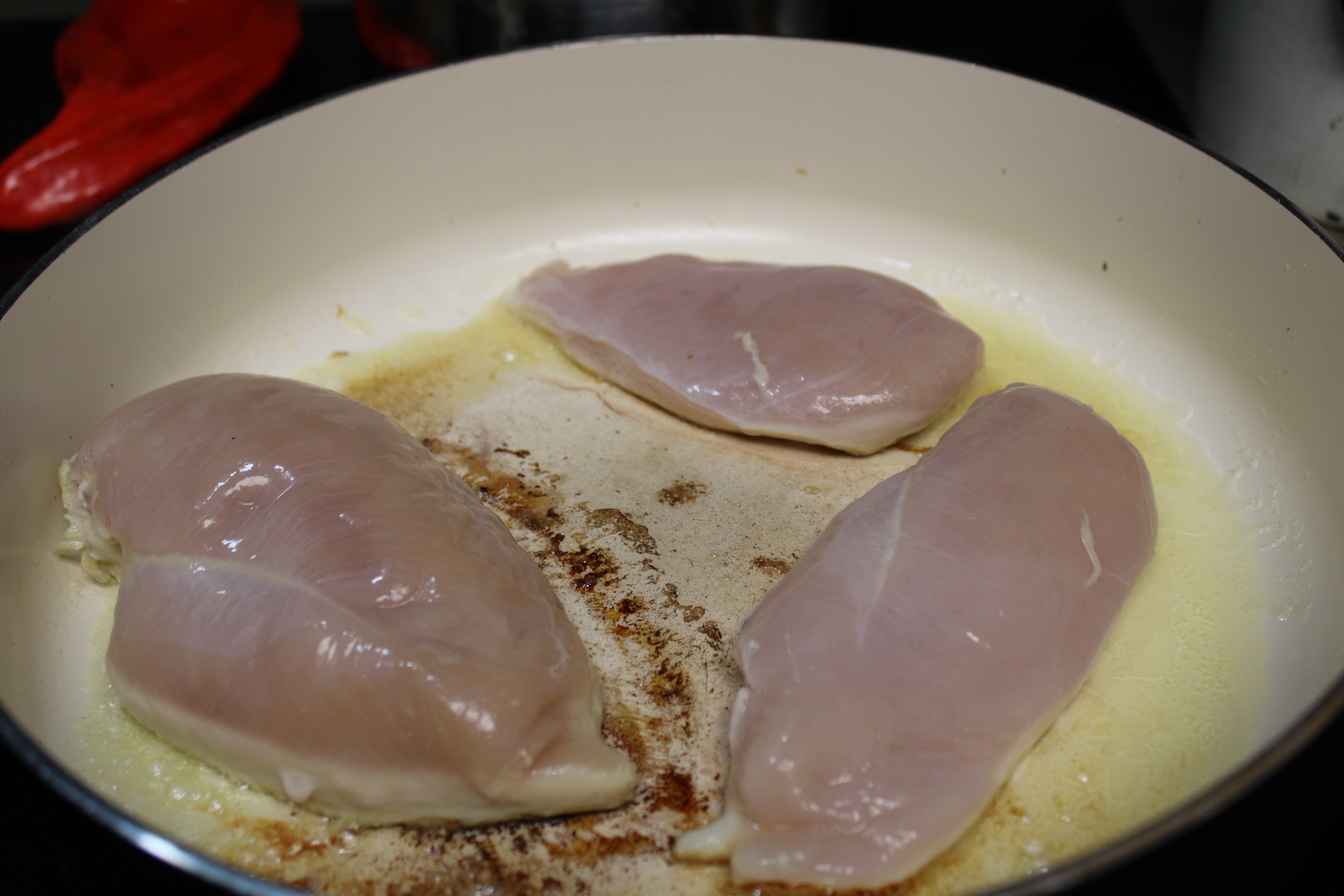 In a skillet over medium-high heat, melt the butter. Cook chicken breasts for 20 minutes, turning half way to brown both sides nicely. Remove from skillet, keep warm.