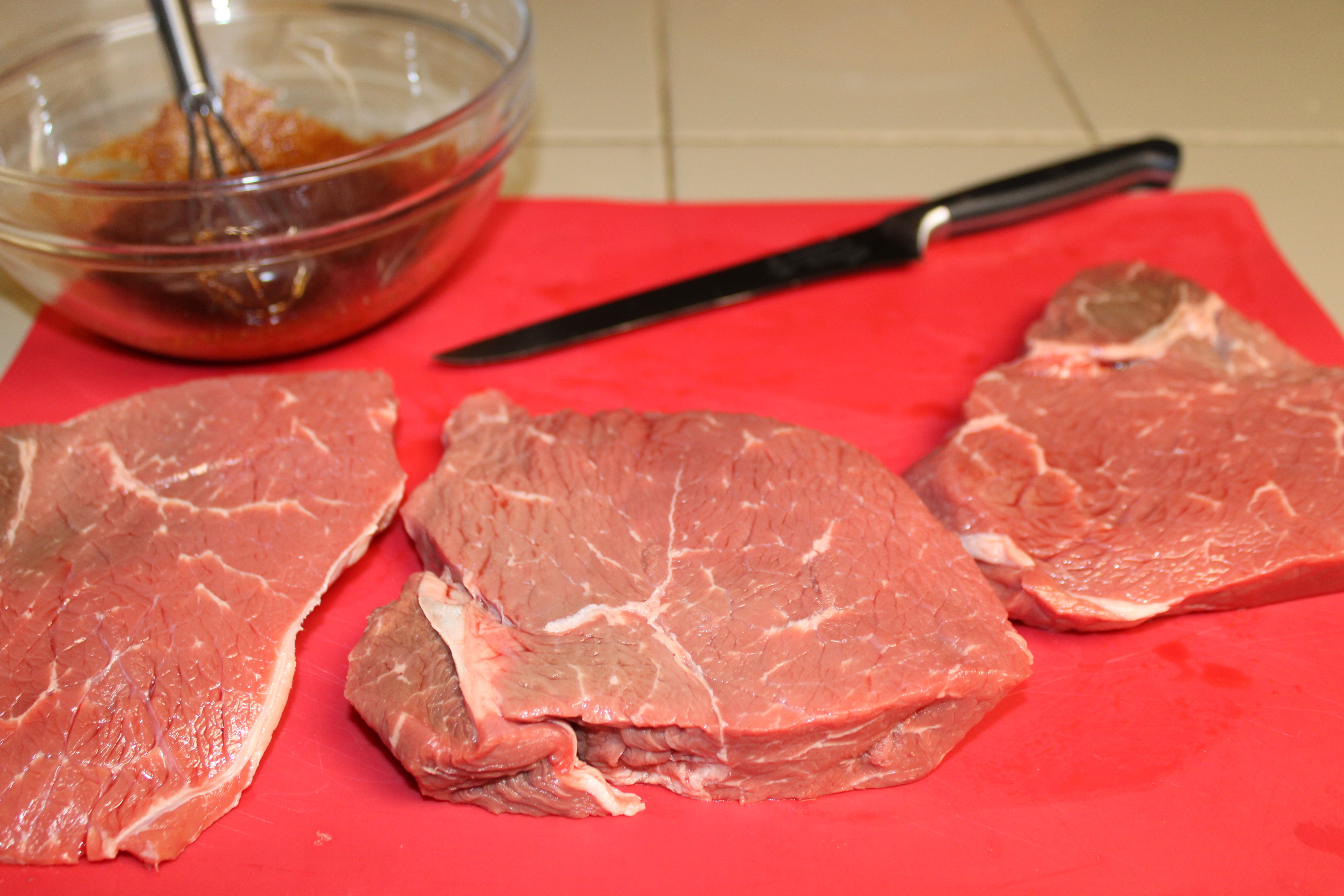 Cut the Top Sirloin steak into thick chunks. Place in a large bowl.