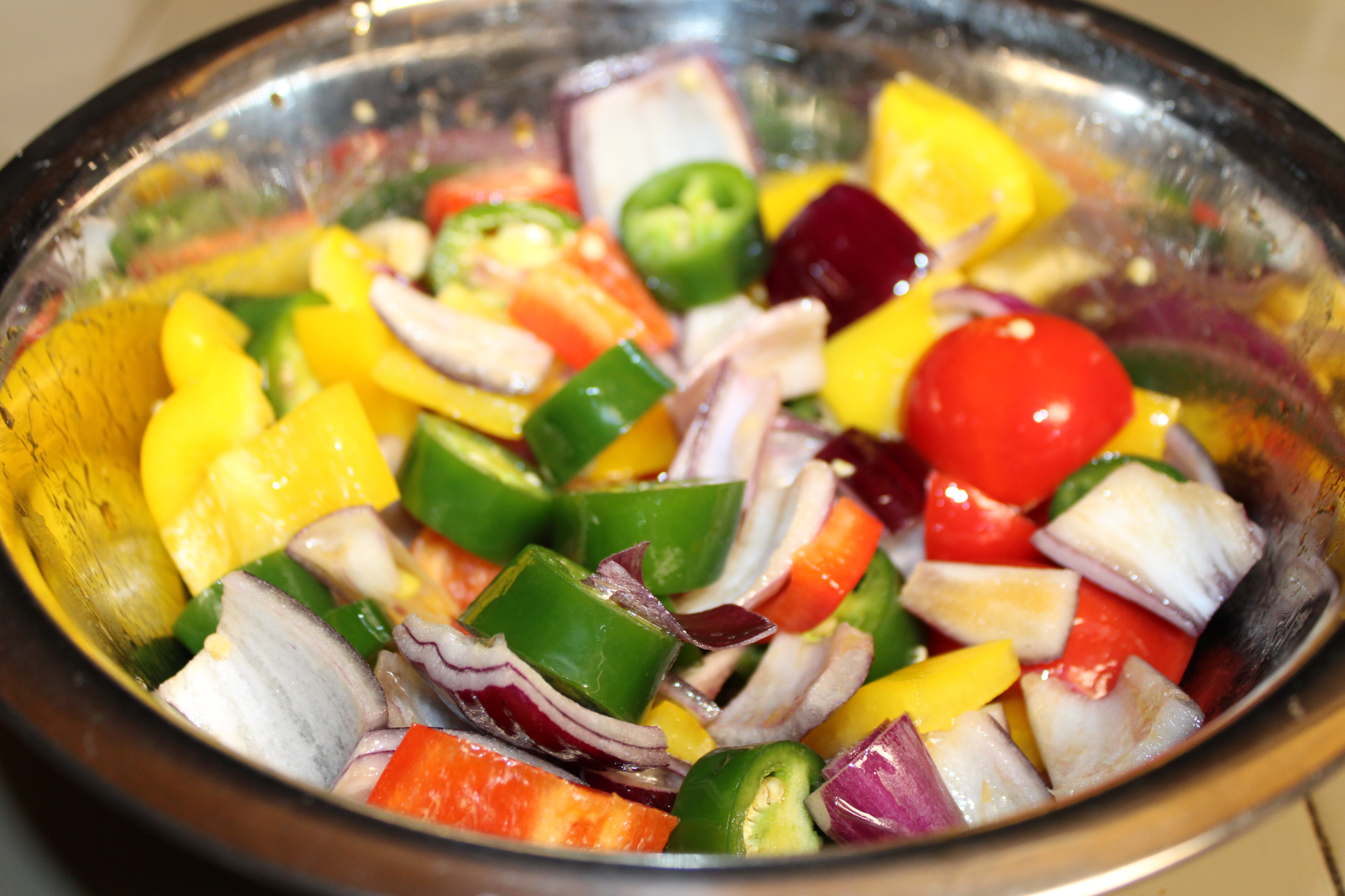 Stem and cut bell peppers into large chunks. Steam and seed jalapeno peppers, cut into similar size chunks. Peel red onion, cut into chunks. Place vegetables into a large bowl. Drizzle with remaining spicy olive oil. Toss and set aside.