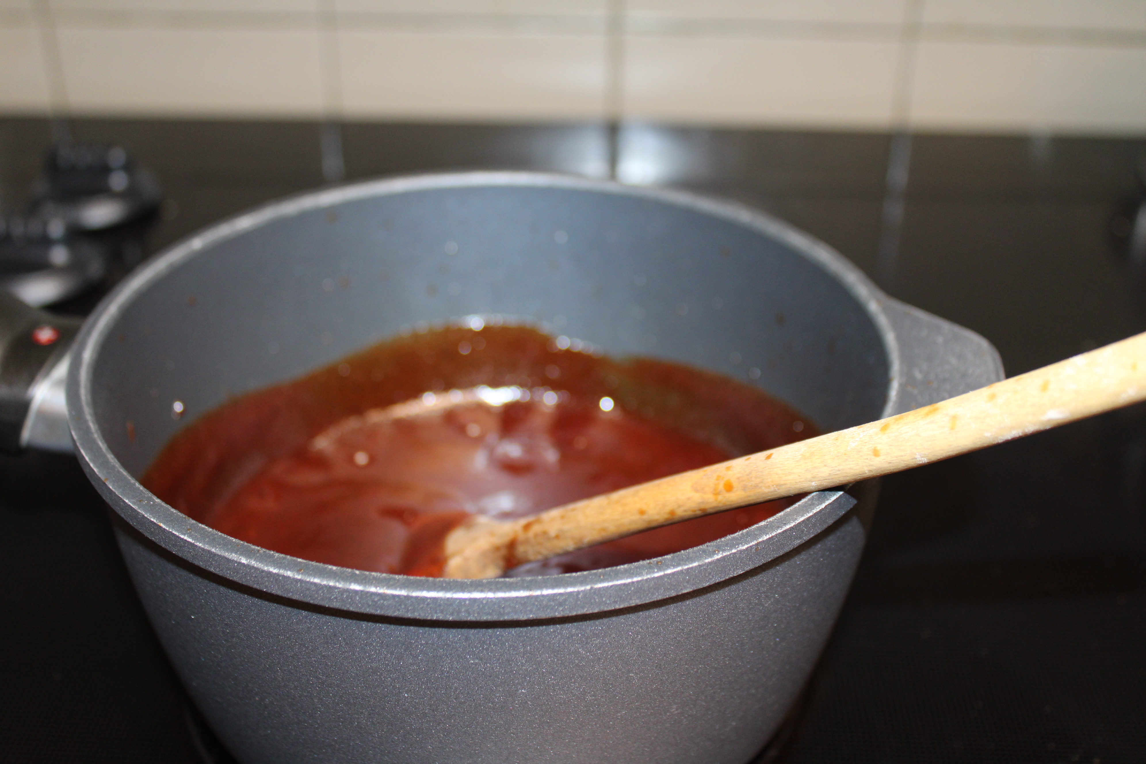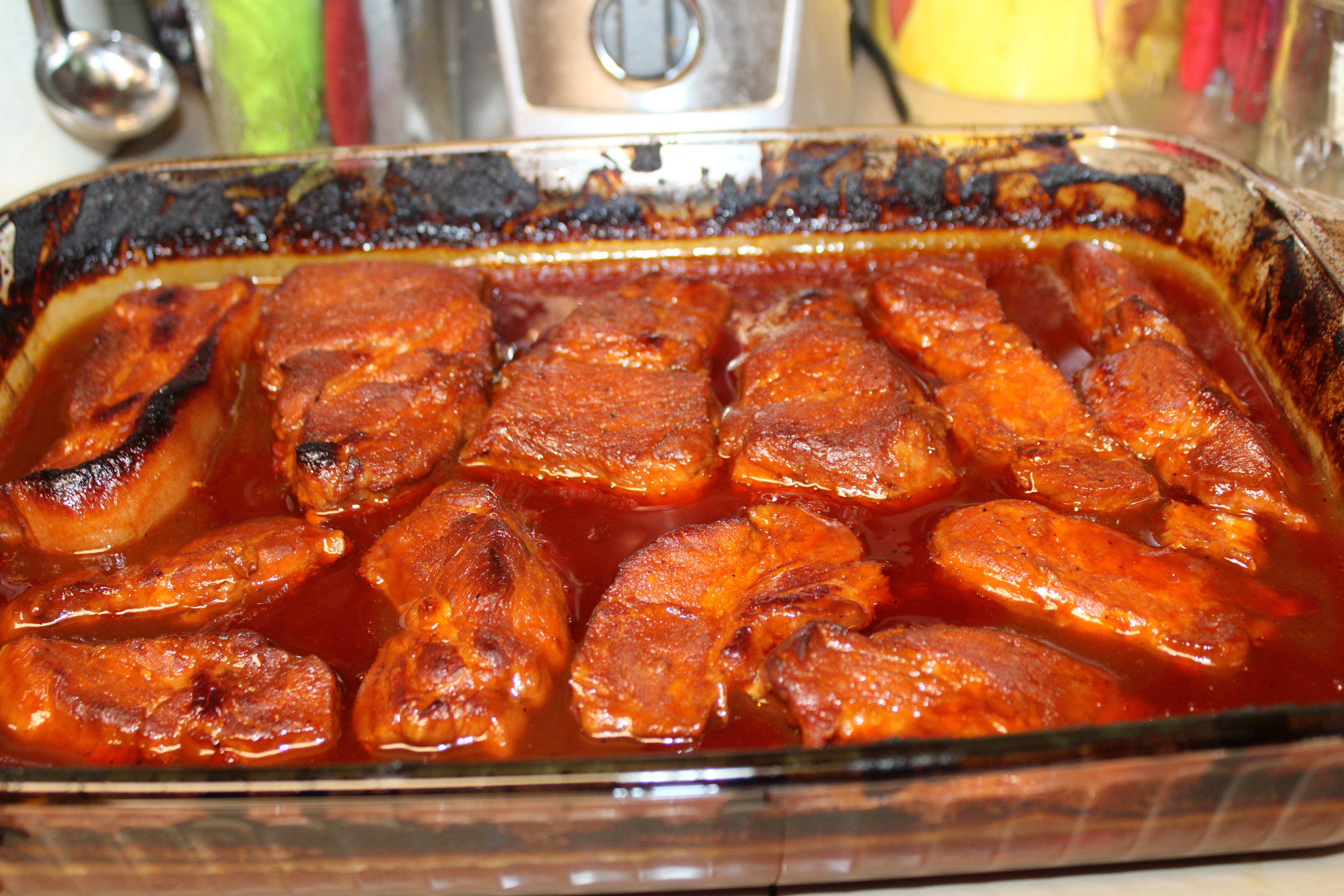 Arrange ribs in a single layer in the bottom of a roasting pan or large casserole dish. Pour sauce over the ribs. Turn several times to coat ribs well in the sauce.