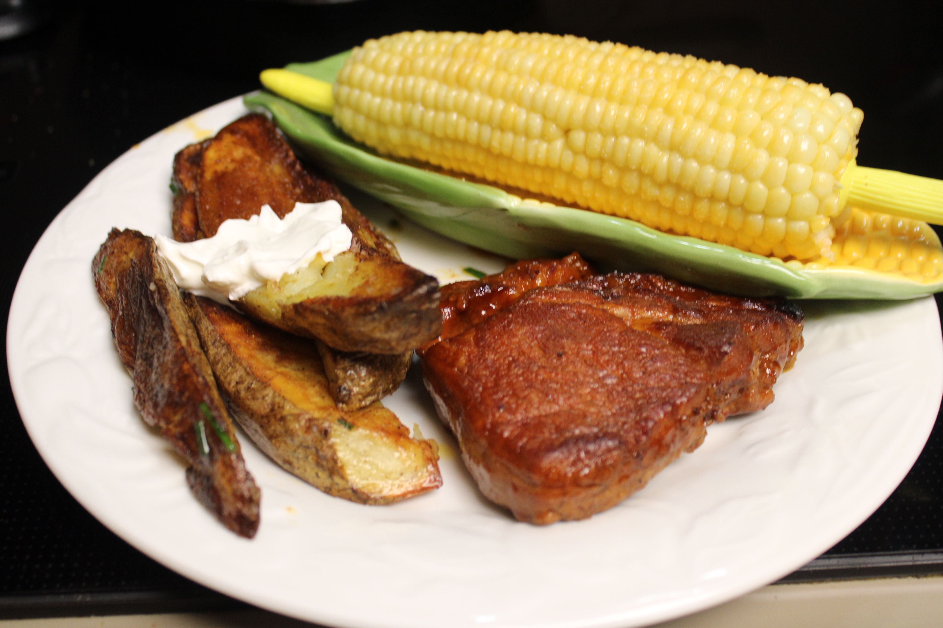 Once the wedged potatoes are done, melt the butter in a small pan over medium heat until foamy. Add parsley flakes and smoked paprika. Swirl the pan around to blend. Pour butter over the wedges, toss to coat. Snip chives, scatter over the potato wedges. Serve with sour cream as desired.