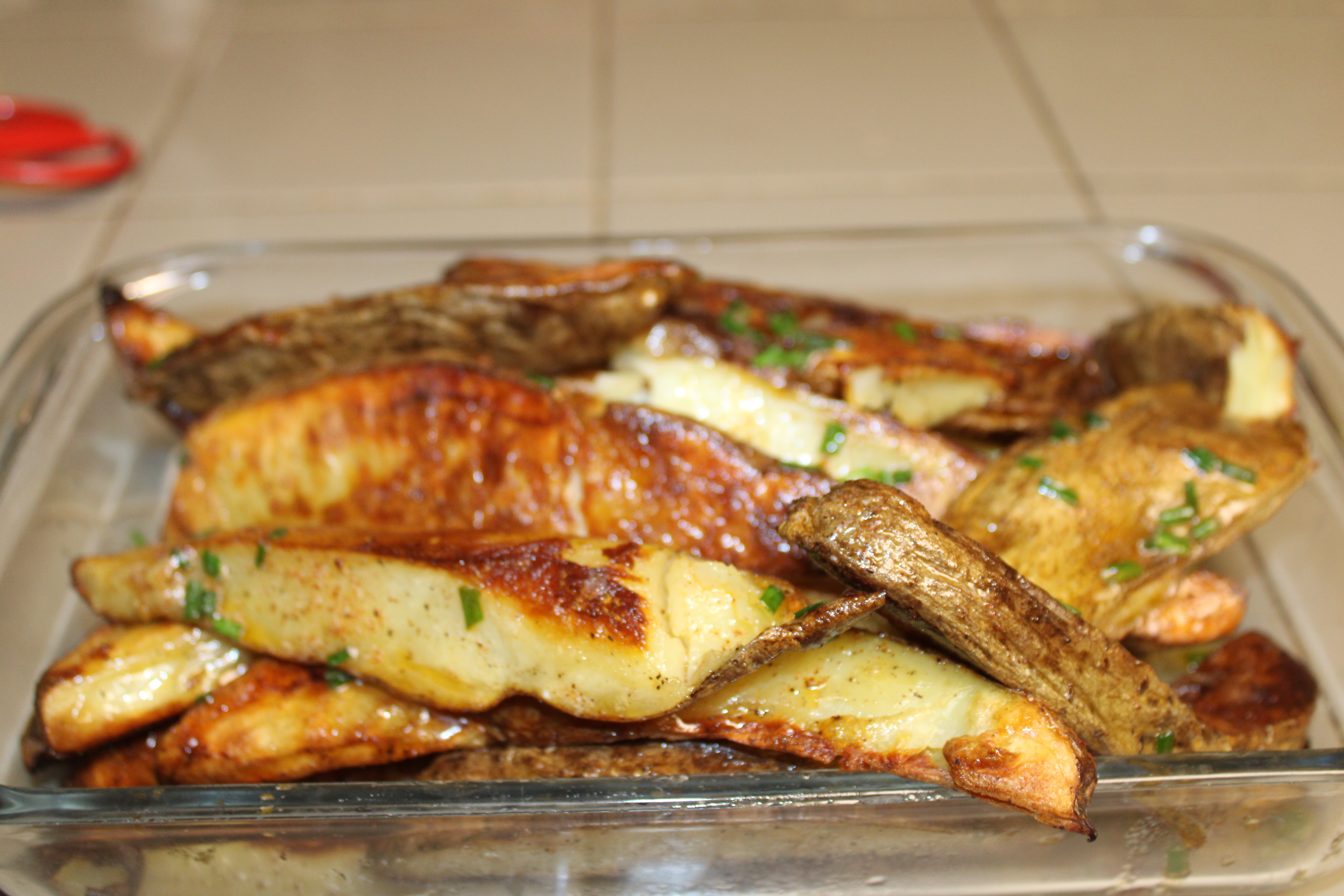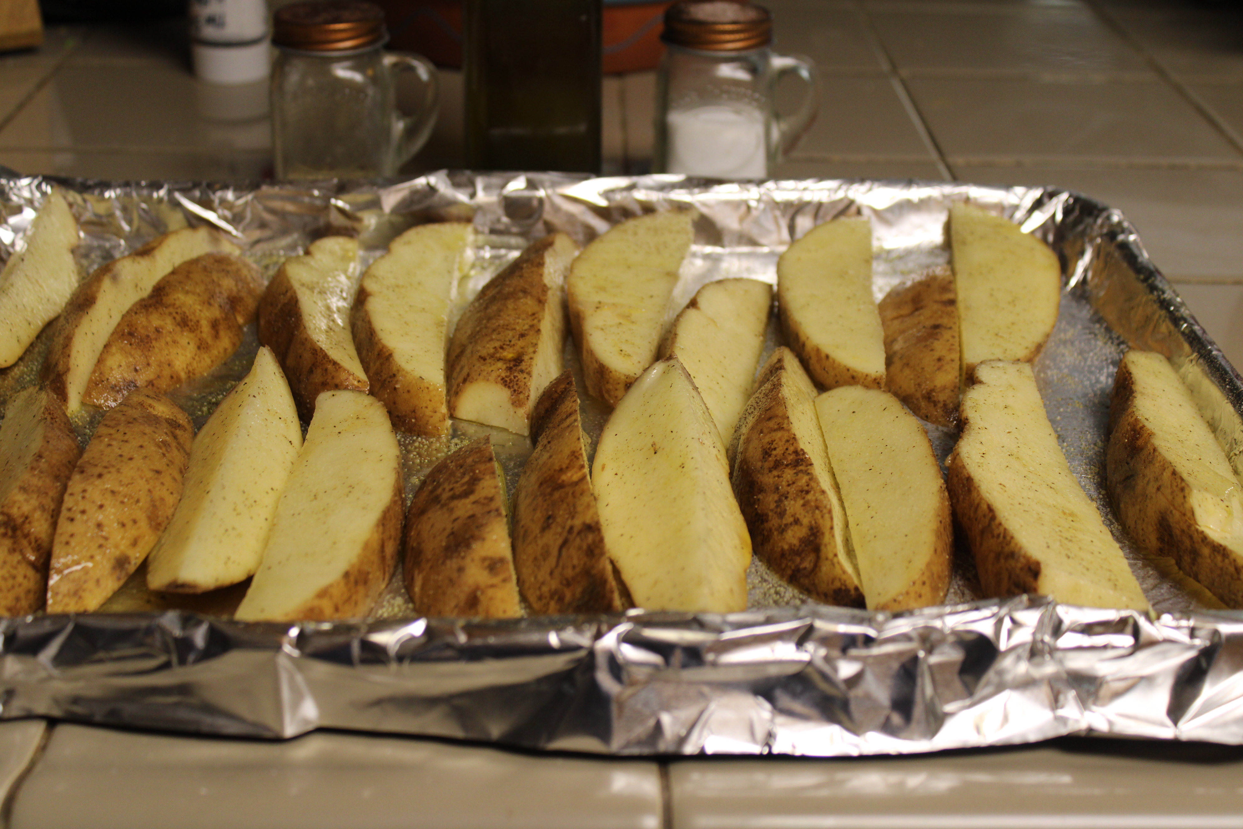 Heat oven to 425-degrees. Scrub, dry and cut potatoes into wedge style potatoes (about 6 to 8 wedges, depending upon size).