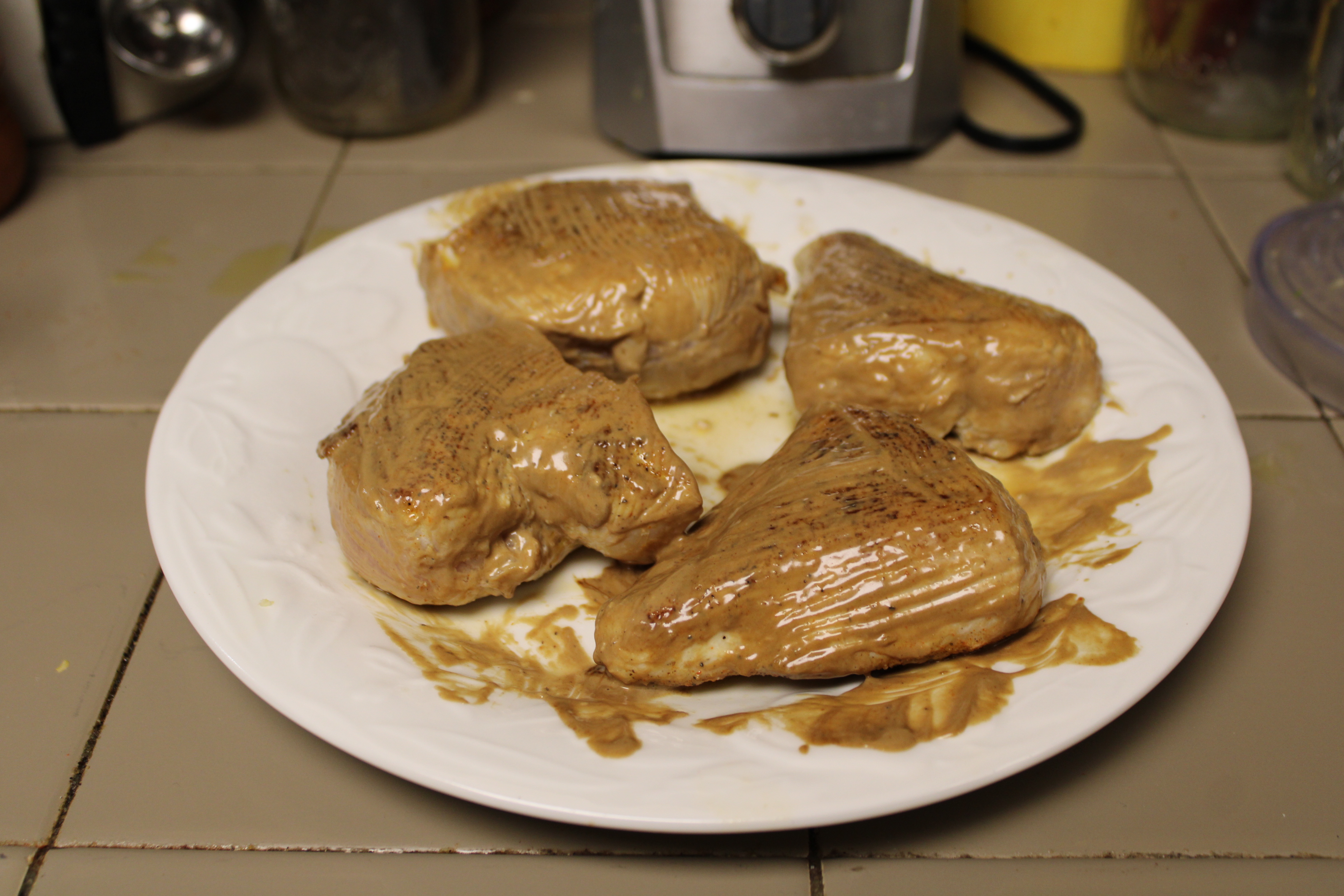 Heat oven to 450-degrees. Cut the chicken breasts in half to make 4 short, fat breasts. Season chicken breasts on both sides with salt, pepper and cayenne. Set breasts aside.