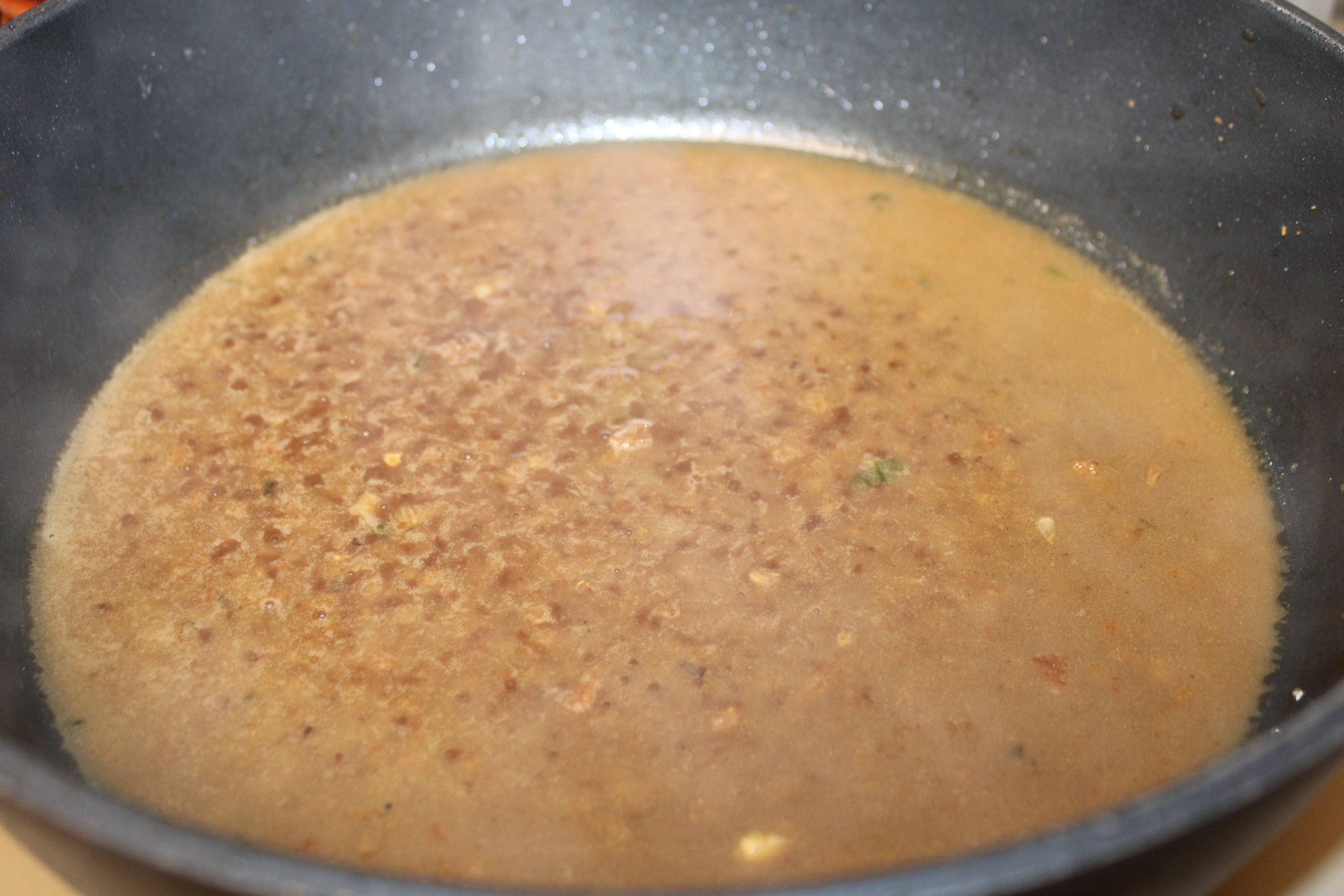 Use a spatula to transfer the breasts back into the skillet. Pour chicken stock around the breasts without disturbing the coating.