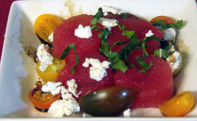 The last big hurrah of a birthday was – wow – maybe eight years ago. That is not to say we don’t acknowledge one another’s birthdays. It’s just simple and private, without a lot of hupla. Anyway, Hubby knew I missed the caliber of restaurants in Las Vegas – 5 Star Excellence and beyond. French restaurants have always been my favorite, followed closely by Italian. Somehow he found a little bungalow French restaurant in Elk Grove that could rival those of Paris. One of the dishes was a compressed watermelon salad. The combination of goat cheese, fruity balsamic and chiffonade basil over compressed watermelon was incredible. You know me, I had to recreate this dish at home. It’s been a while since I’ve shared the recipe. I say with summer upon us, it’s time to elevate our watermelon consumption and do it with style!
