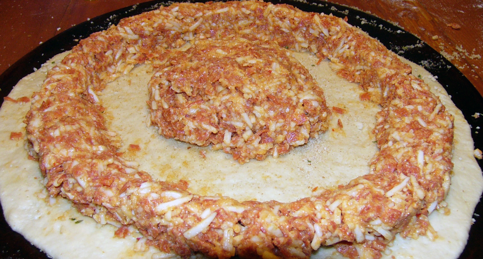 Make two circles with the filling – and outer circle and an inner “mound” of filling. Leave room between the circles and along the edge to seal the dough. Sprinkle the filling with the remaining grated Parmesan cheese.