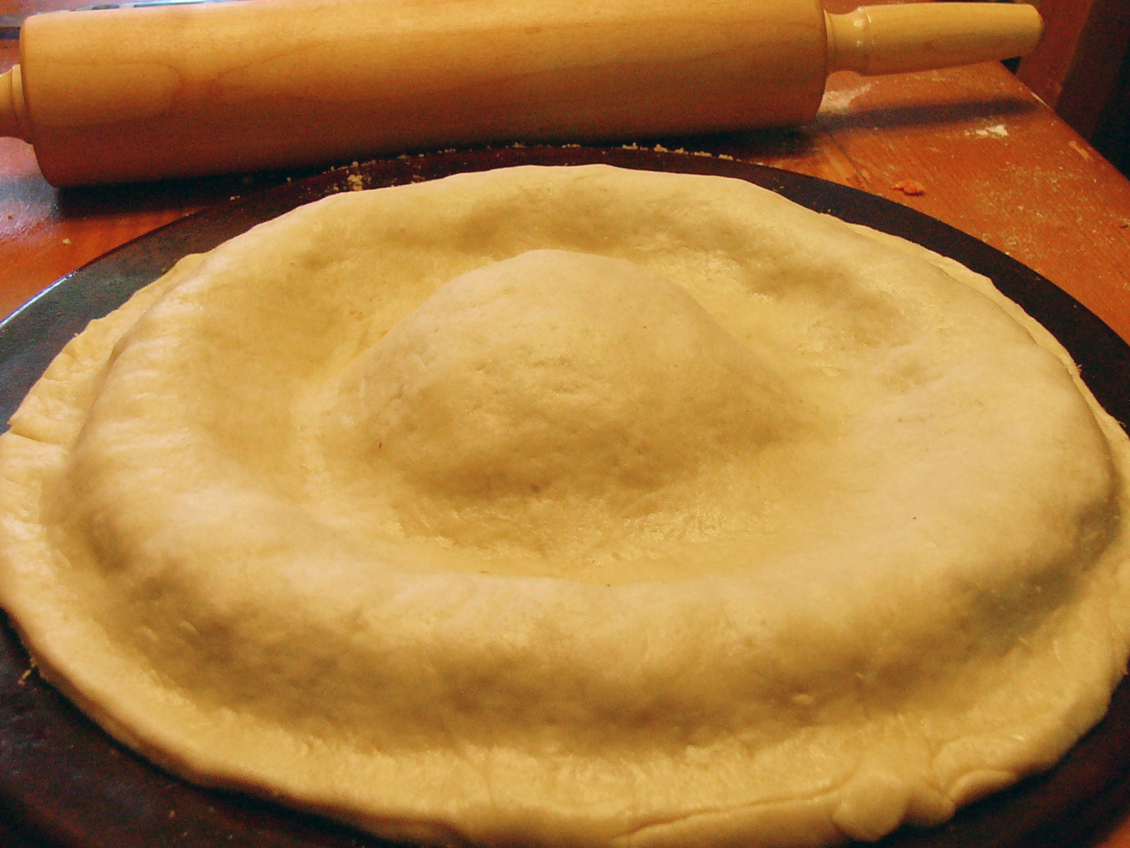 Cover the baking stone with a second piece of parchment paper. Dust the rolling pin and remaining dough with flour. Roll the second disk out to about the same size as the first. DO NOT sprinkle this disk with breadcrumbs. The second disk needs to be somewhat sticky. Lift from the stone with parchment paper.