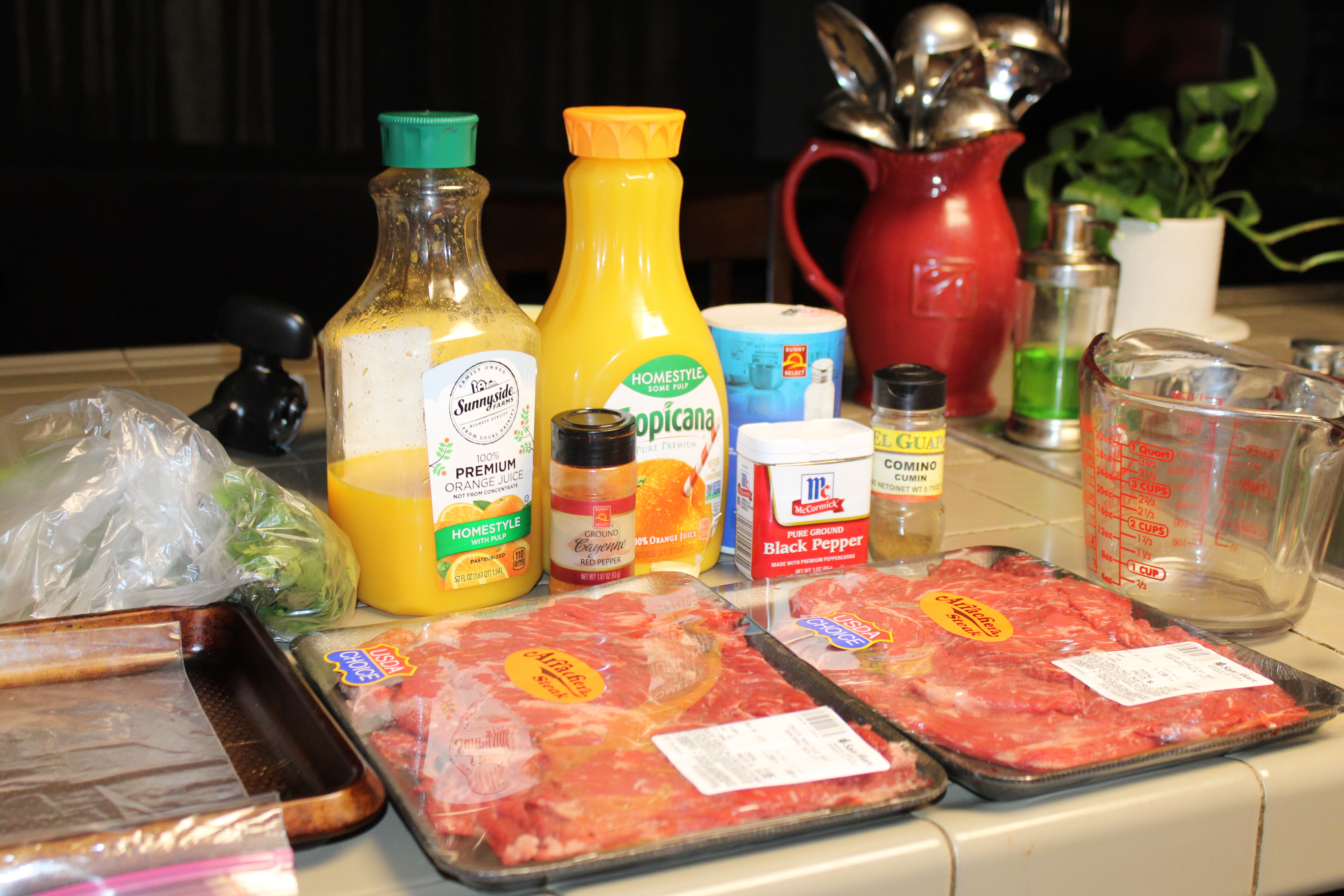 In a four-cup measuring glass, measure orange juice and set aside. Finely snip the leaves of fresh cilantro, add to the orange juice. Cut lime in half, juice into the cup. Peel and mince garlic, add to the mixture. Season with salt, pepper, cumin and a pinch of cayenne pepper. Whisk and pour into a large freezer bag.