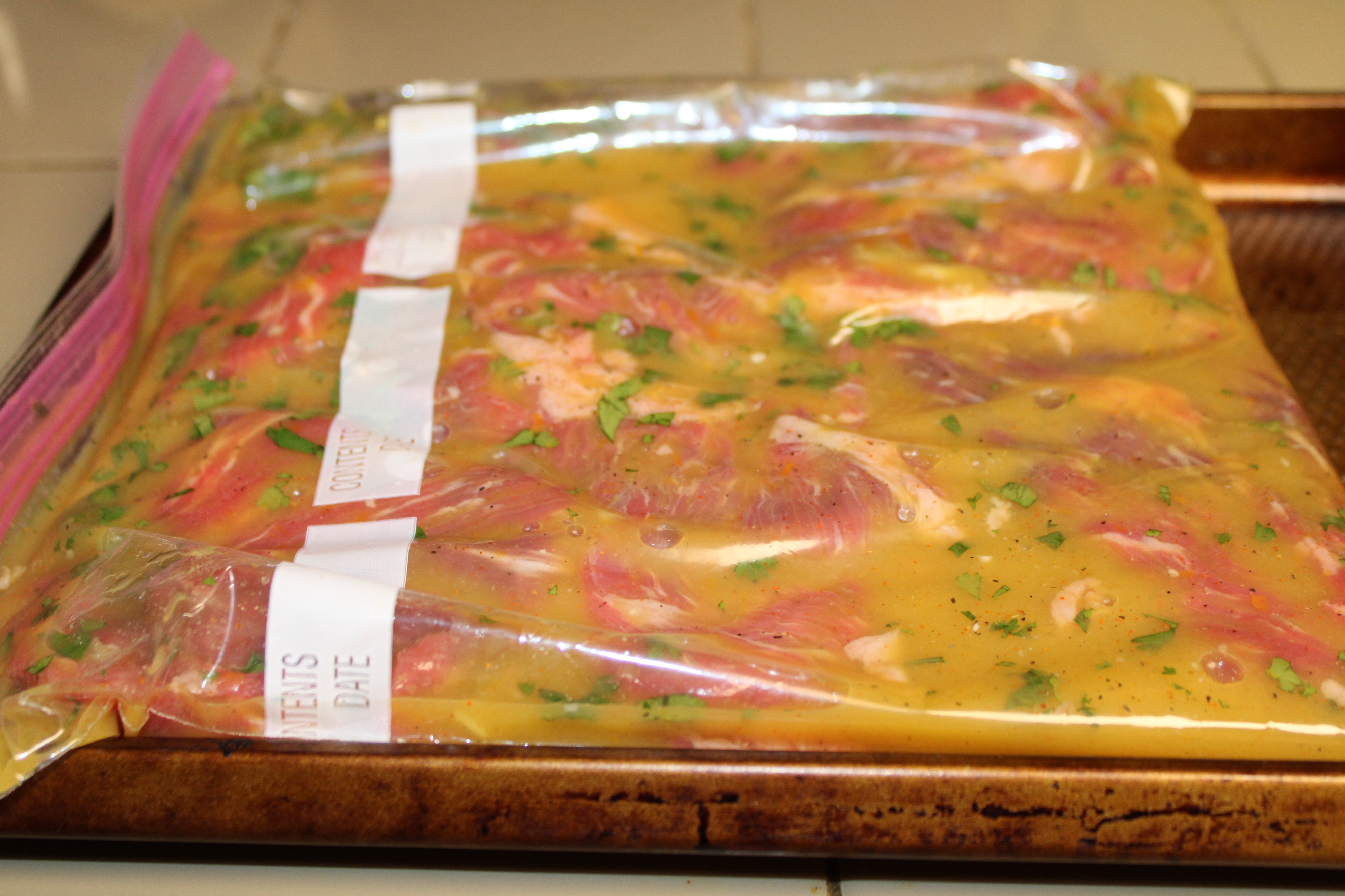 Submerge skirt steak into the marinade mixture. Seal the bag, squeezing out as much air as possible. Place in a casserole dish, lay out flat and refrigerate for at lease 6 hours or overnight.