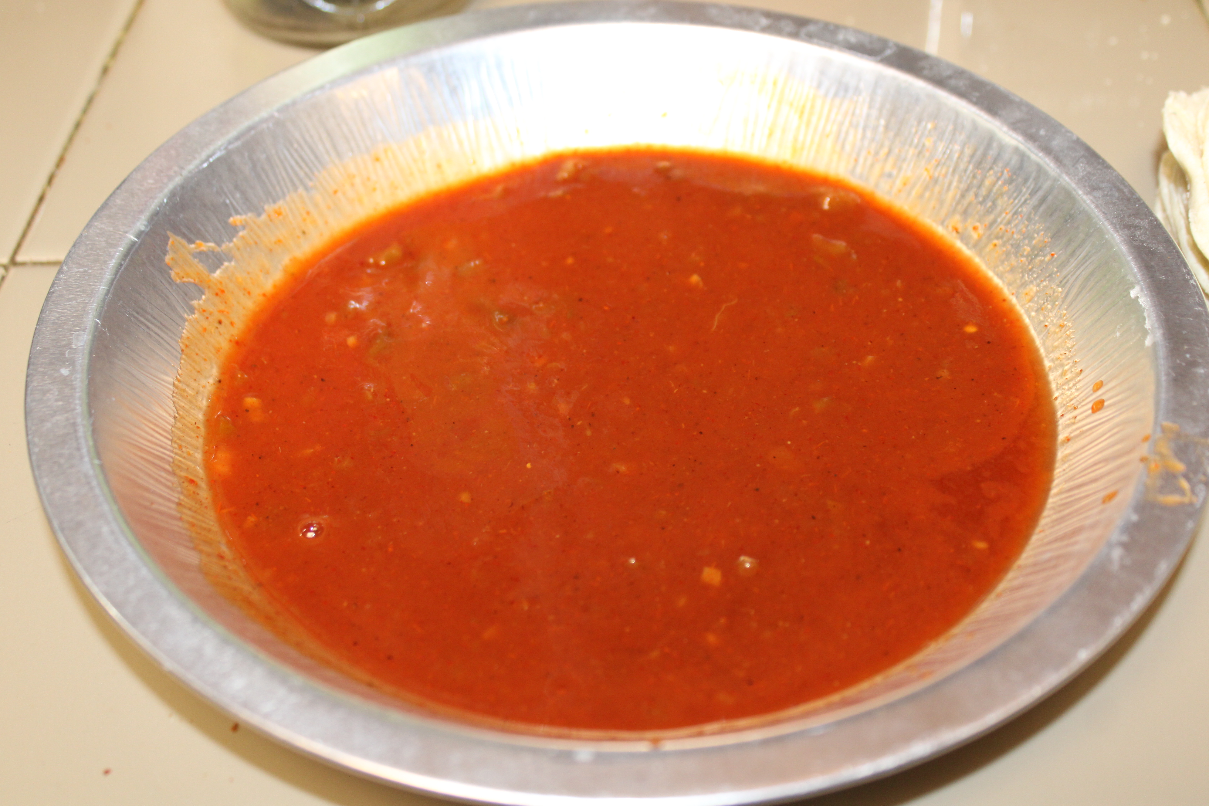 In a shallow pie pan or dish, whisk taco sauce with beef stock. Dip tortillas in the sauce mixture, allowing excess to drip back into the dish. On a griddle, quickly fry the tortillas to warm. Wrap in foil, keep warm until ready to fill.