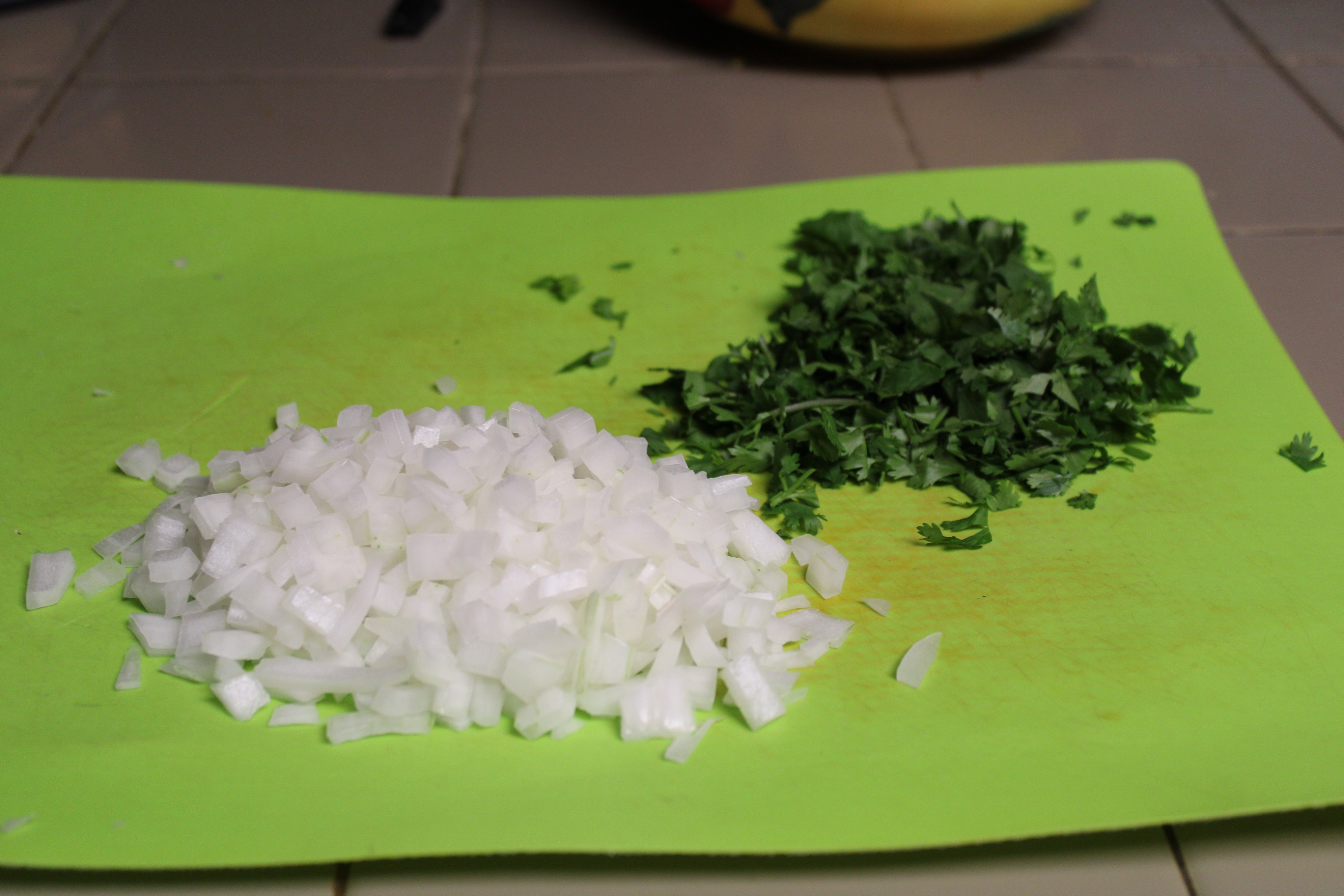 When ready, chop a whole white onion and roughly chop a bunch of cilantro for the tacos. Cover and set aside until ready to use.