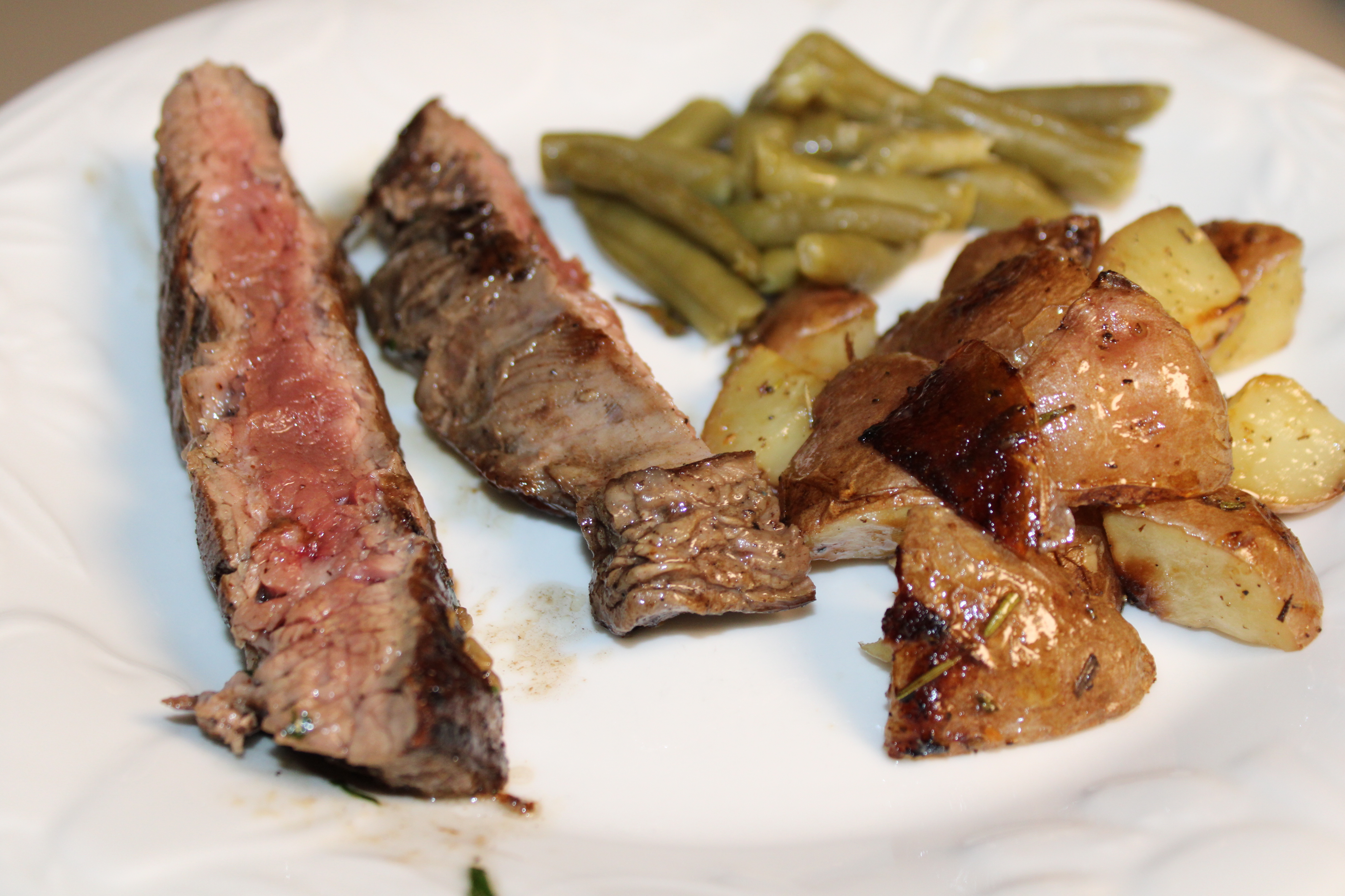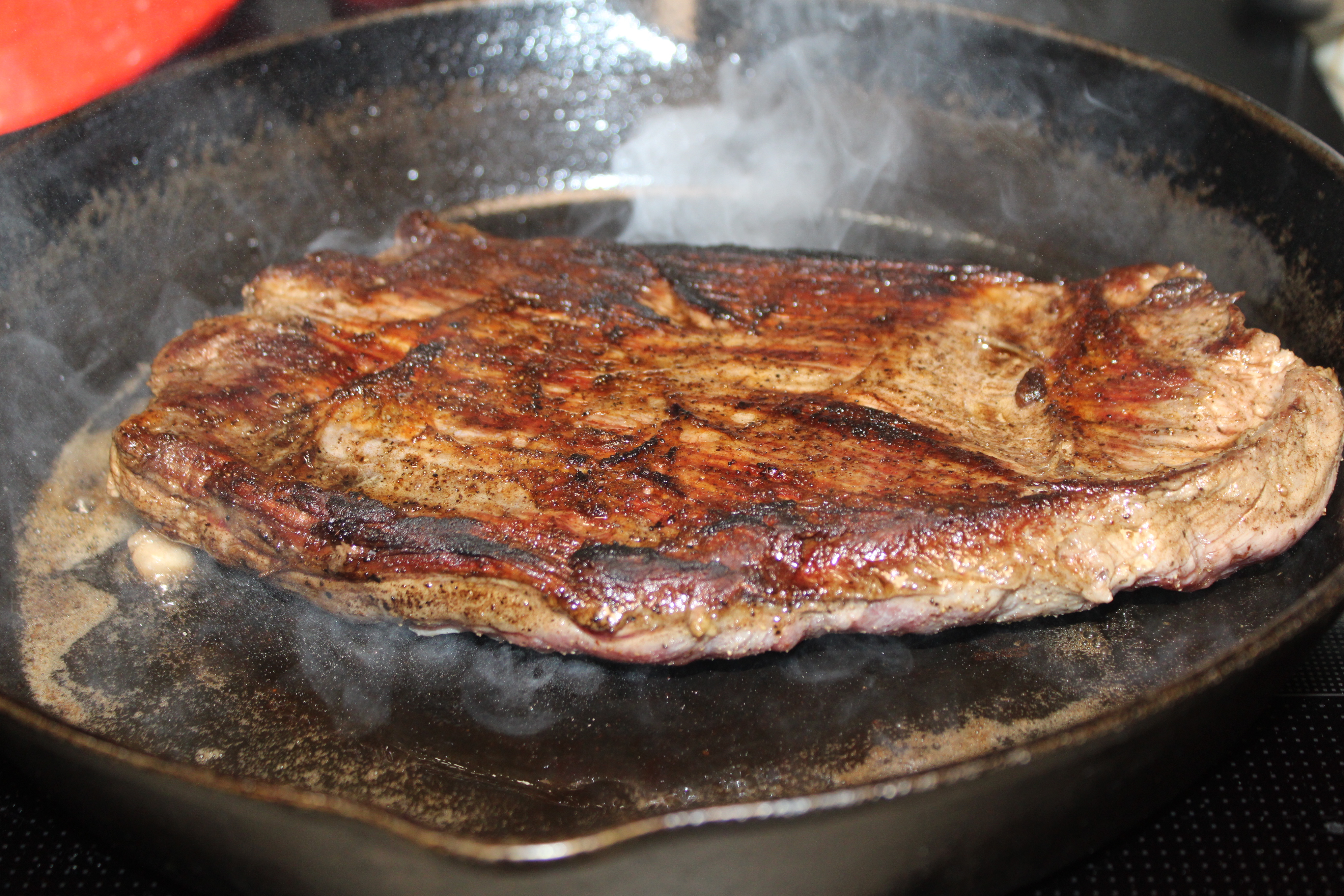 Remove steak from skillet. Plate, spread butter over the steak so the butter will seep into the meat. Tent for 10 minutes while basting in butter. Slice steak against the grain, fan out and serve. Delicious with Red Bliss Roasted Potatoes and green beans.