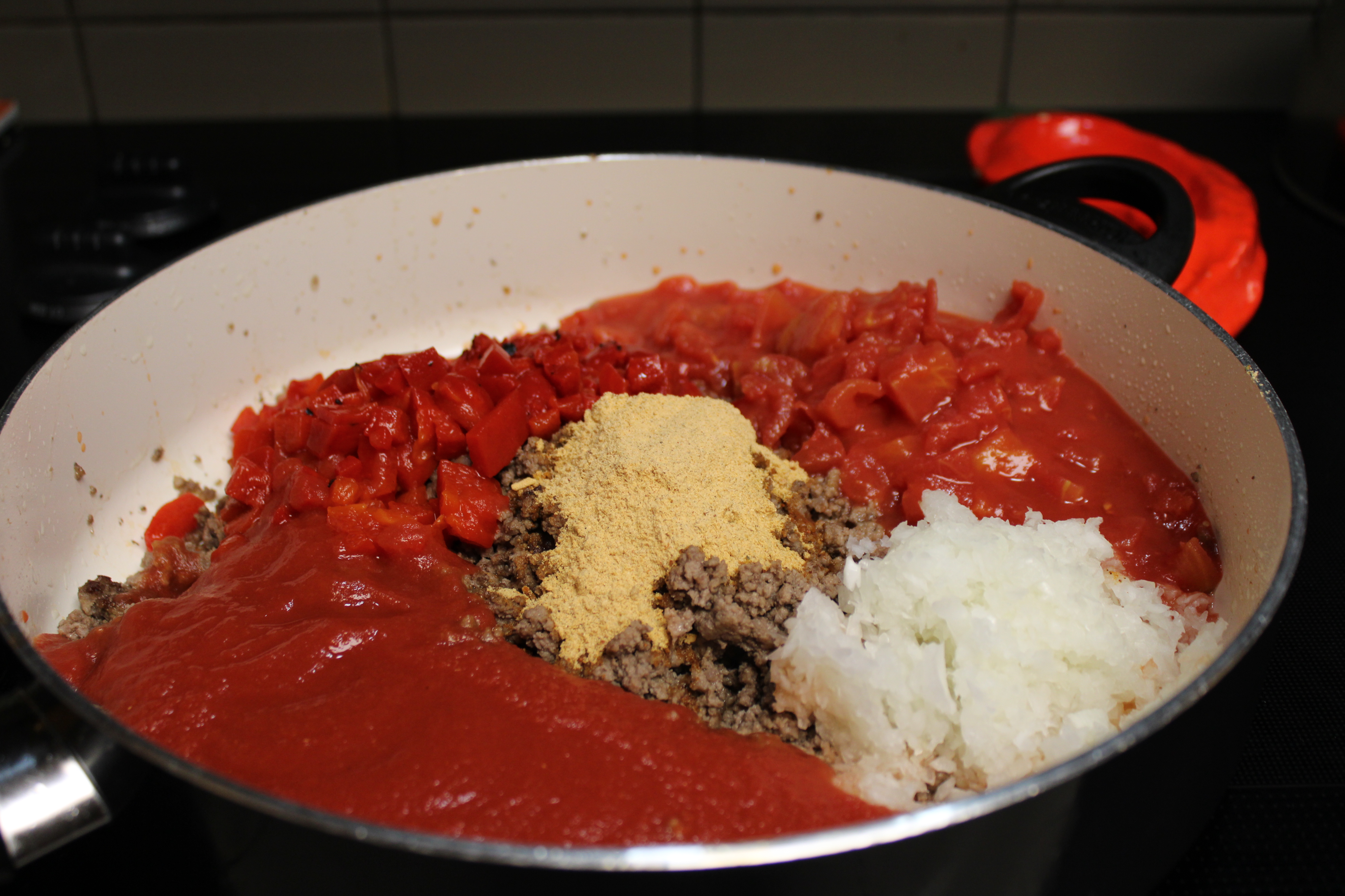 Add Sloppy Joe Seasoning Mix, tomato sauce, roasted tomatoes, onions and diced bell peppers along with their reserved juices. Stir to combine.