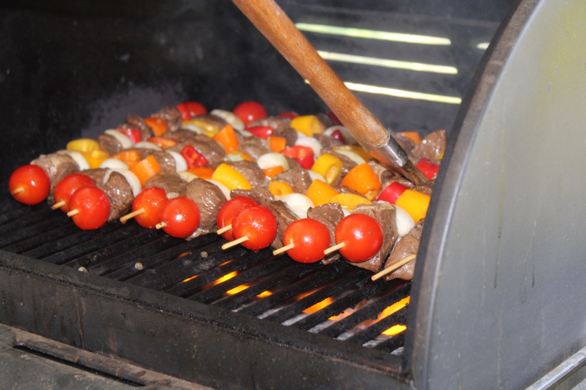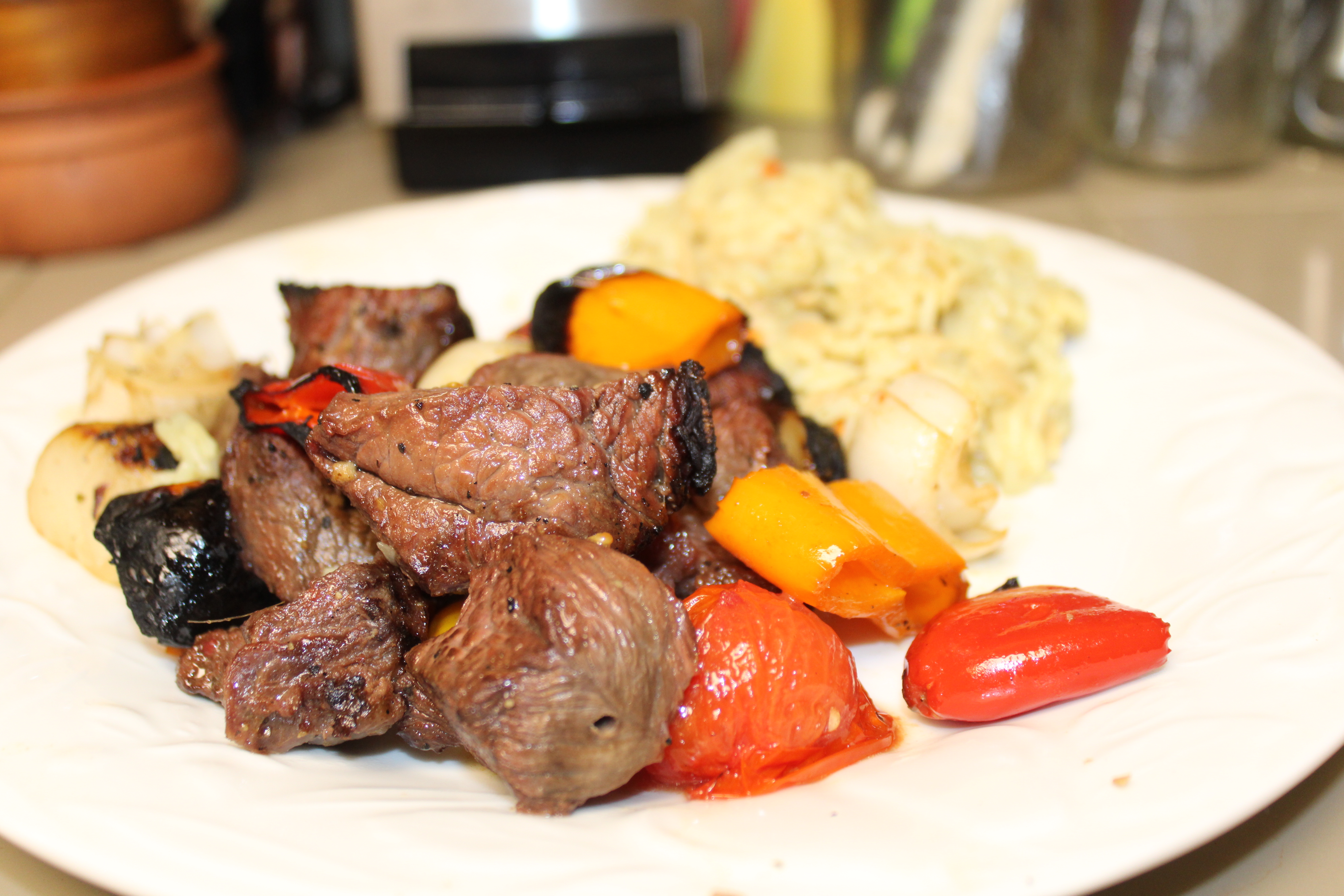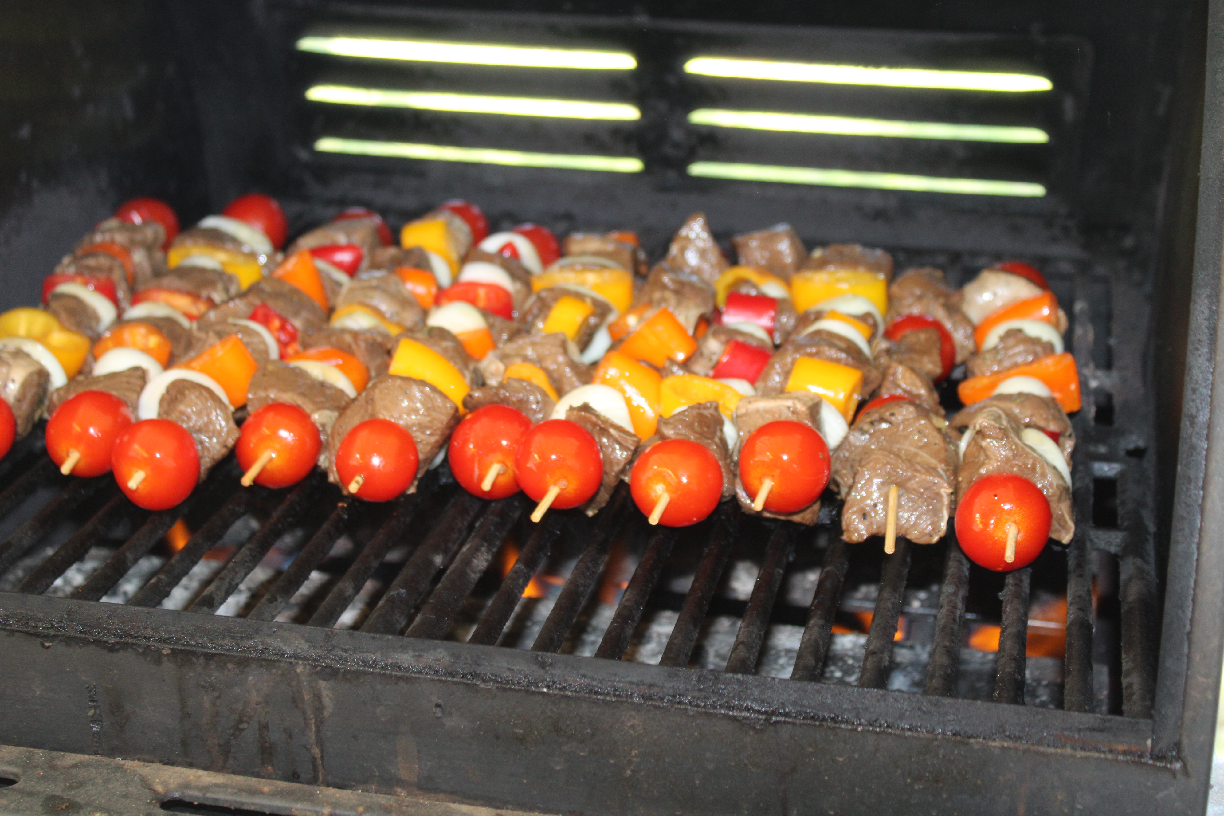 Thread onion, steak, bell pepper and tomatoes alternating as desired onto the skewer. Repeat until skewer is filled. DO NOT thread too tight or meat will not cook properly. Repeat same with remaining skewers until all the ingredients are used. (I usually end up with one skewer that is almost all meat, which is fine by Hubby).