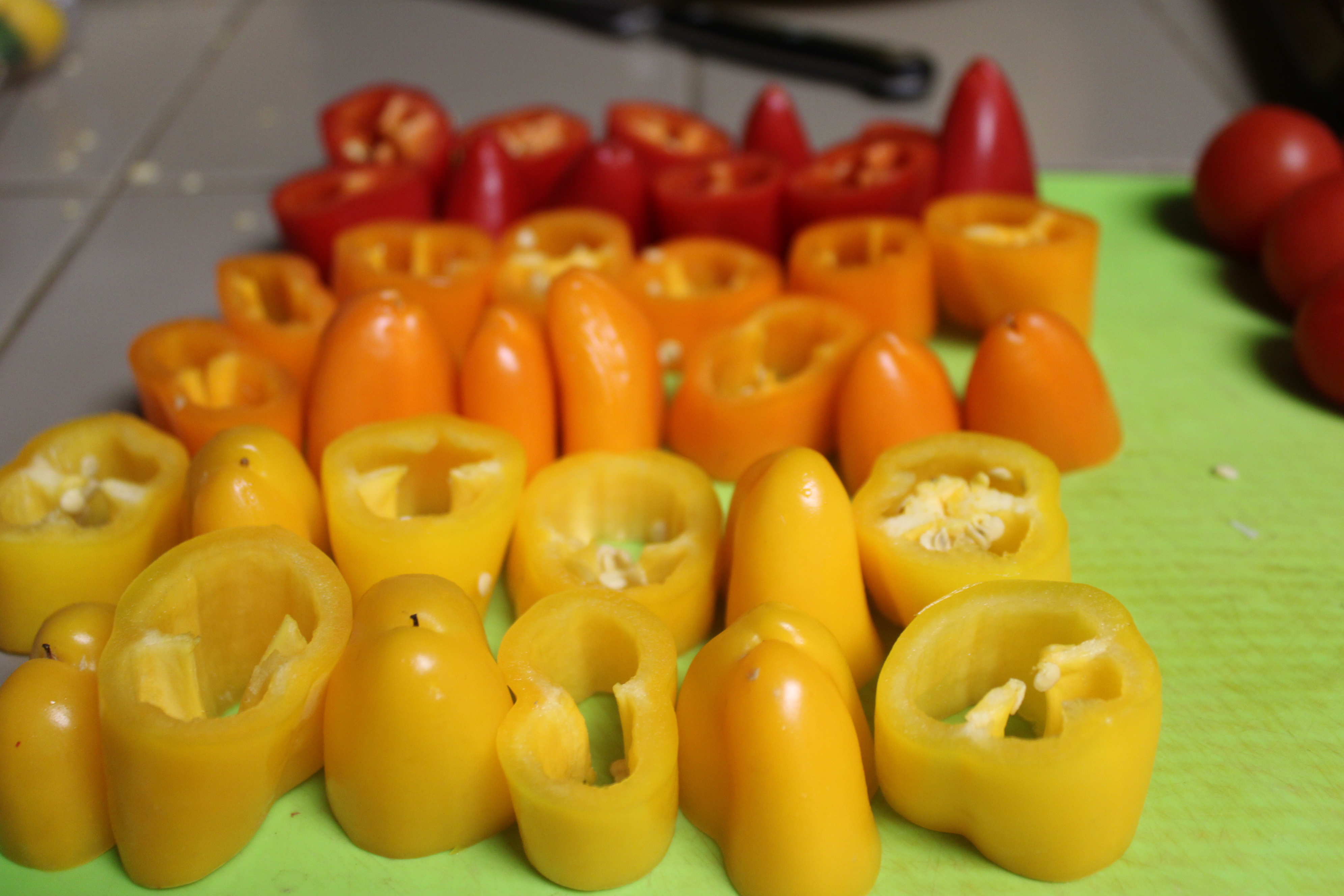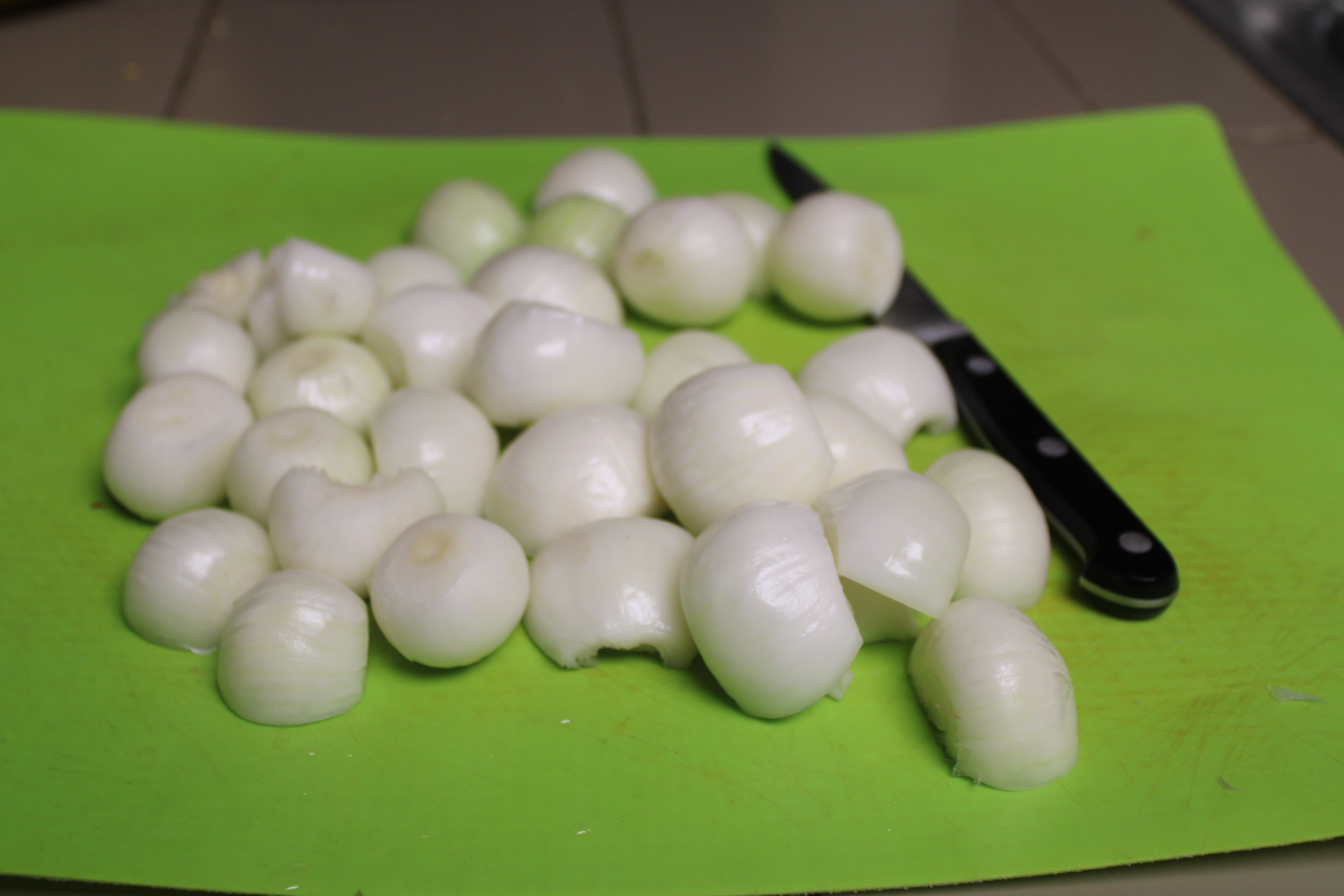 Blanch and peel outer layer from pearl onions. Rinse tomatoes. Stem, core and cut bell peppers into chunks.