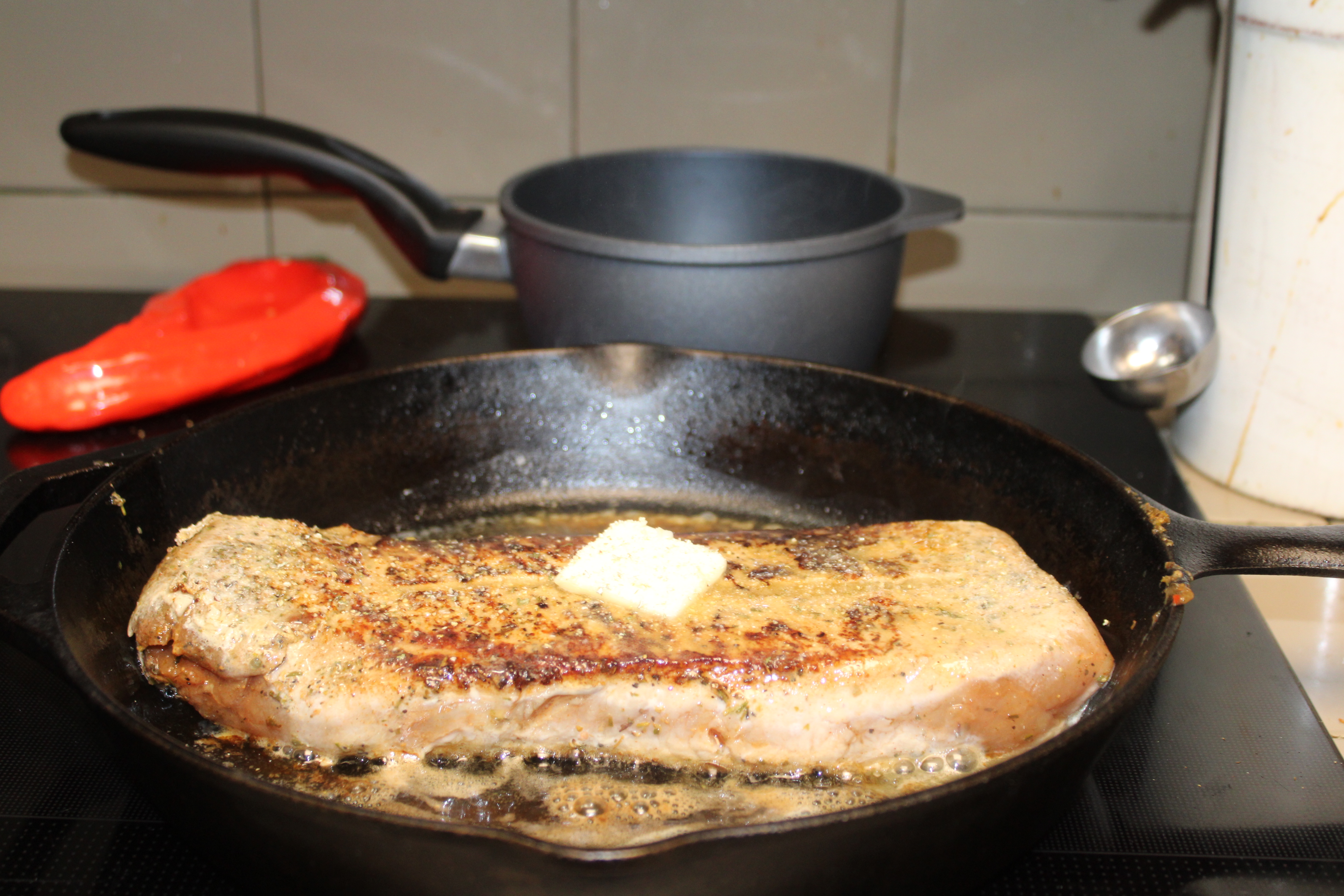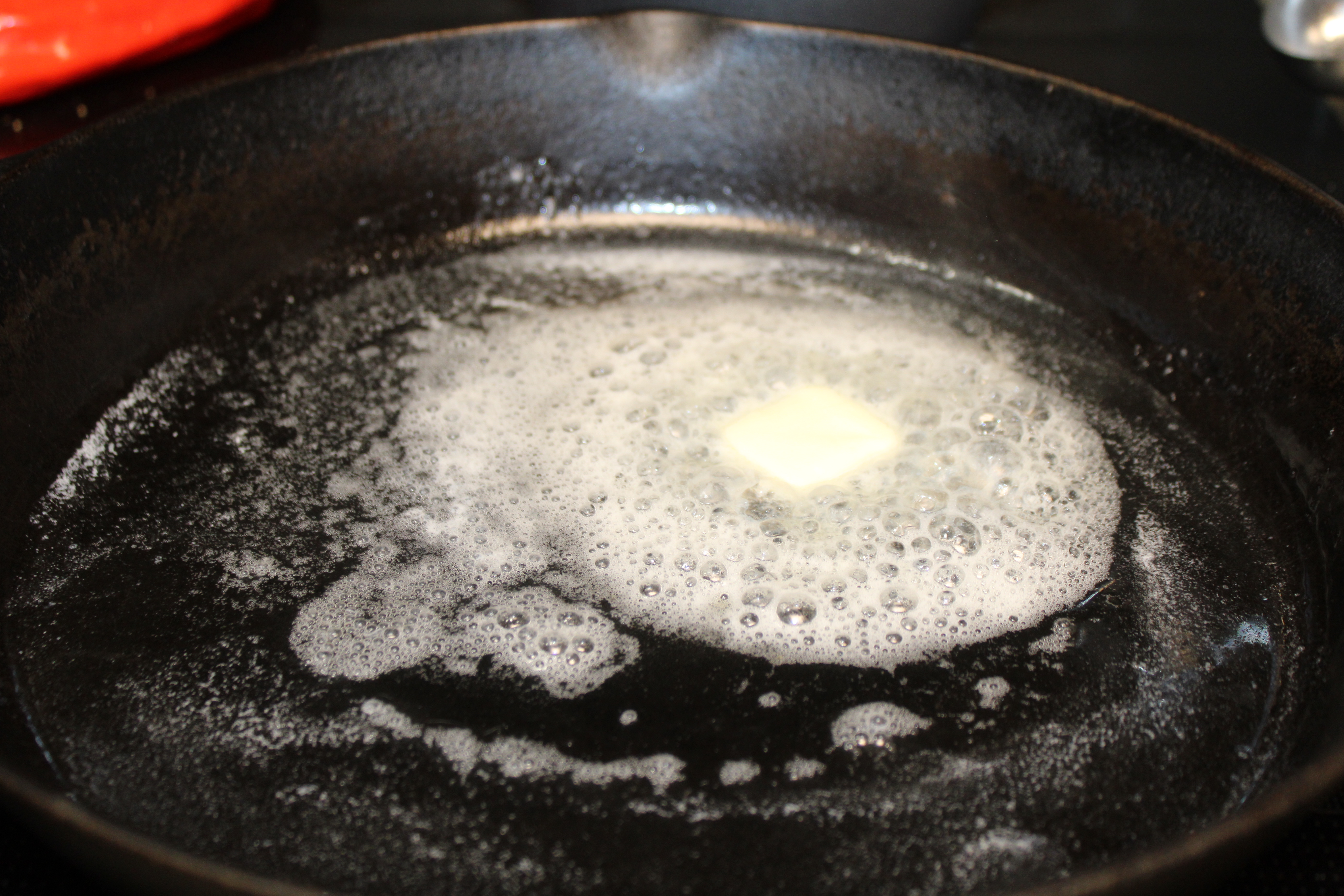 Heat oven to 400-degrees. Place a cast iron skillet on the stove over medium-high heat. Melt 1 tablespoon butter and oil into the skillet, swirl to coat the bottom of the pan.