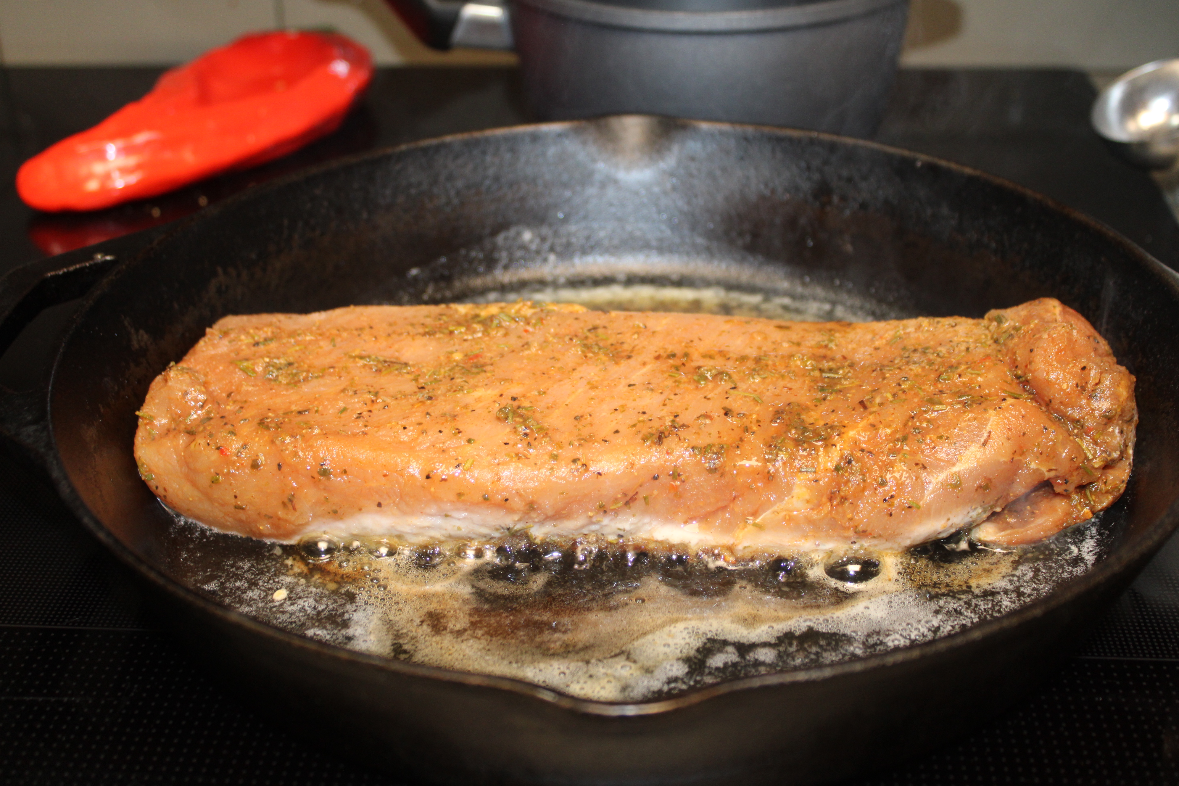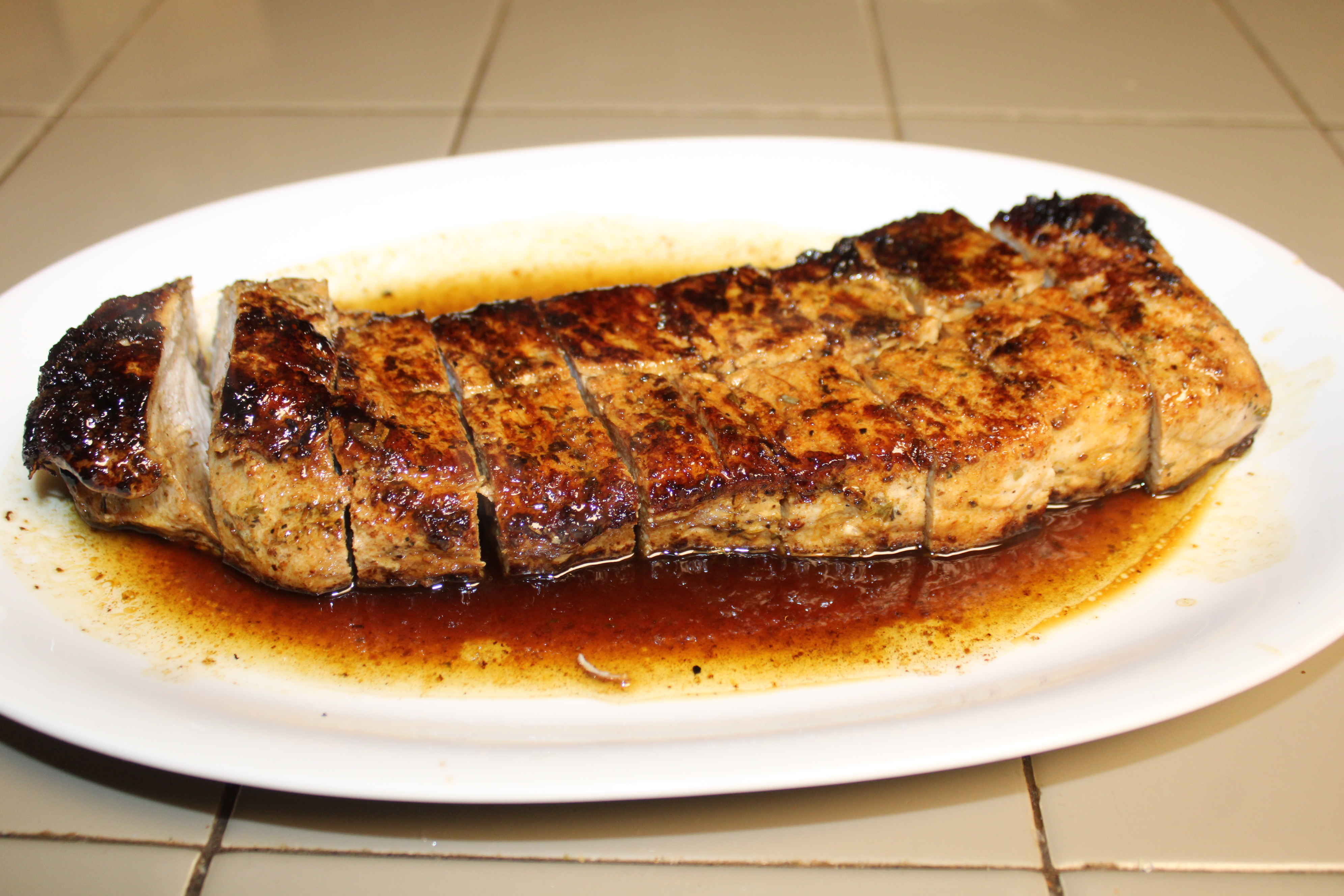 Remove from oven, tent and let rest in the skillet for 5 minutes. Transfer to a serving platter, slice into about 8 to 10 half-inch slices. Deglaze the skillet with chicken stock, pour pan drippings over the sliced pork.
