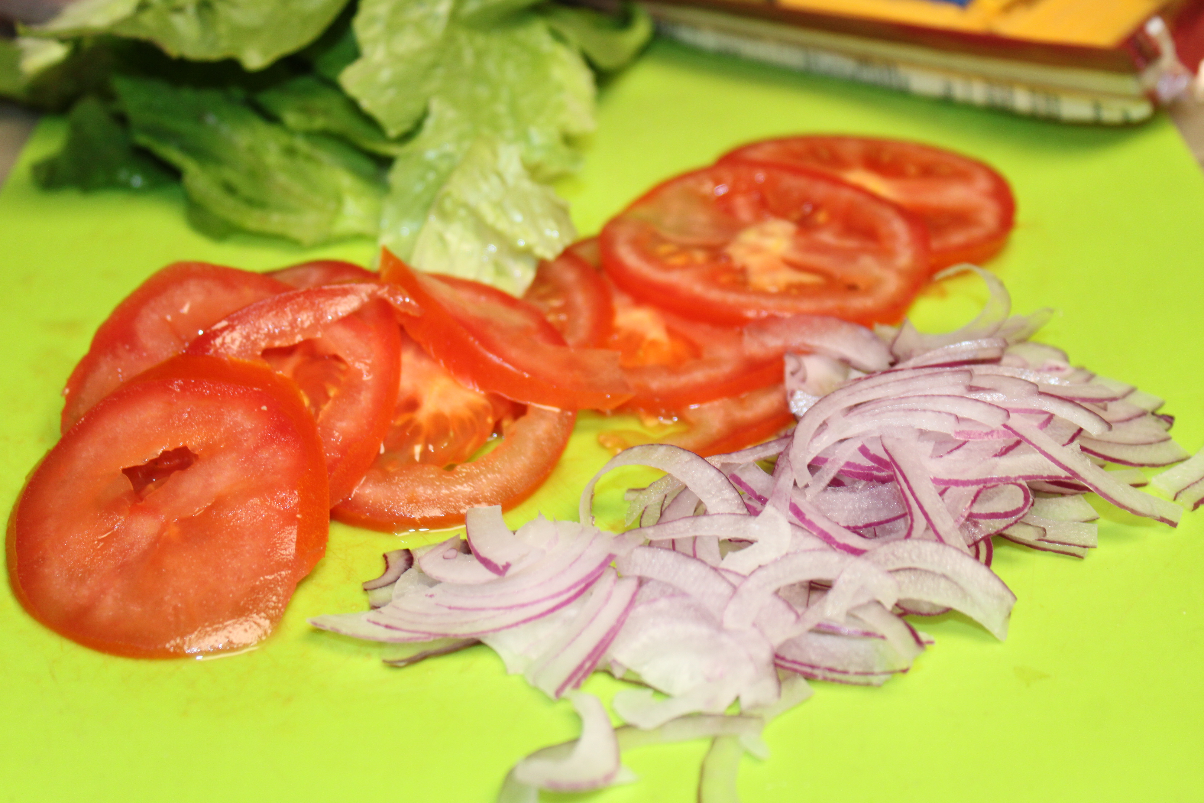 Split sub rolls open. Brush inside of each roll with salad dressing, set aside. Tear lettuce leaves from thicker rib. Thinly slice tomato and red onion, set aside.