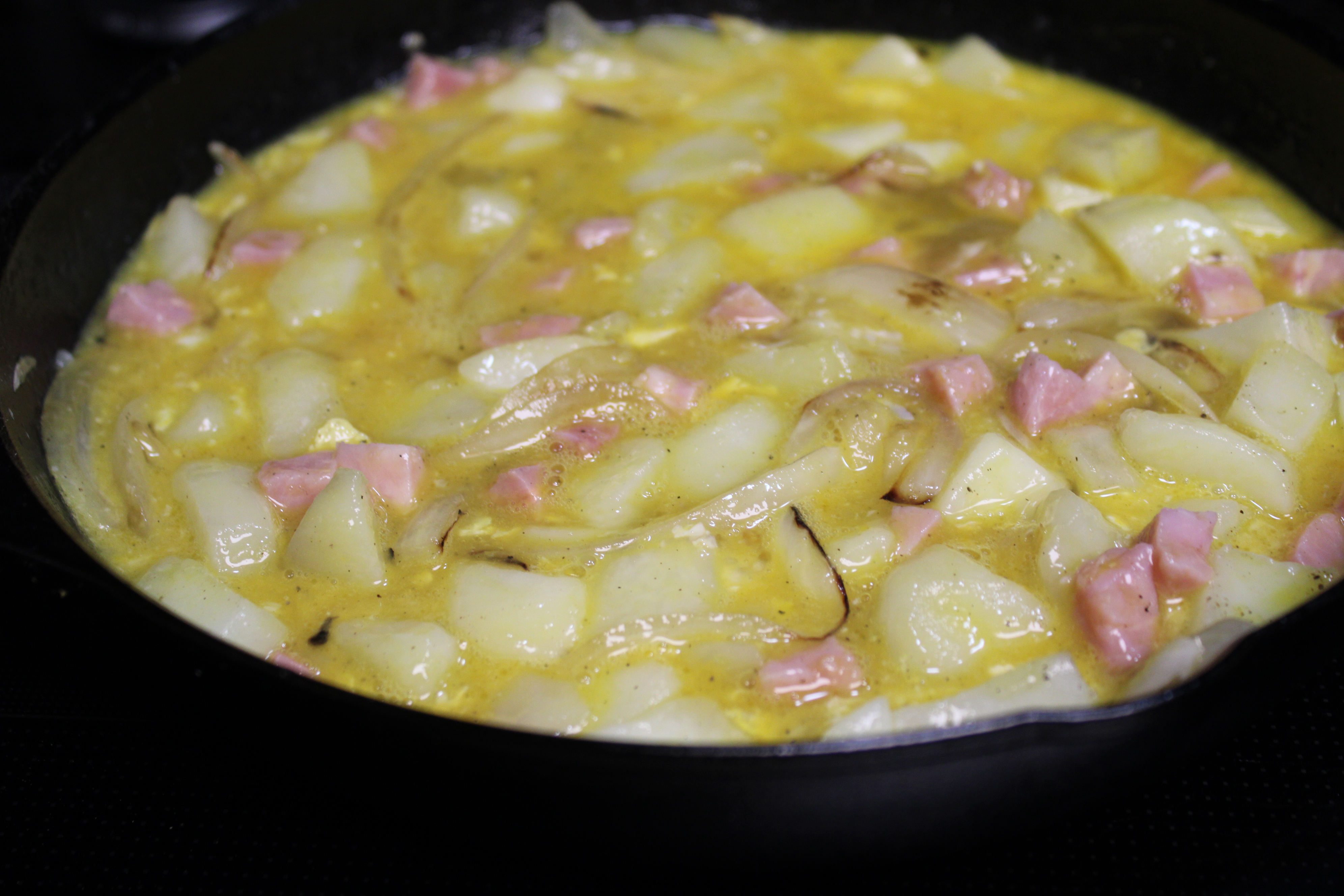 Stir in eggs, potatoes, and diced ham. Season with salt and pepper. Cook on the stovetop until the eggs are firm on the bottom, about 5 minutes. Sprinkle the top of the Frittata with shredded cheese. Place in the heated oven until the cheese has melted and the eggs are completely firm, about 8 minutes or so.