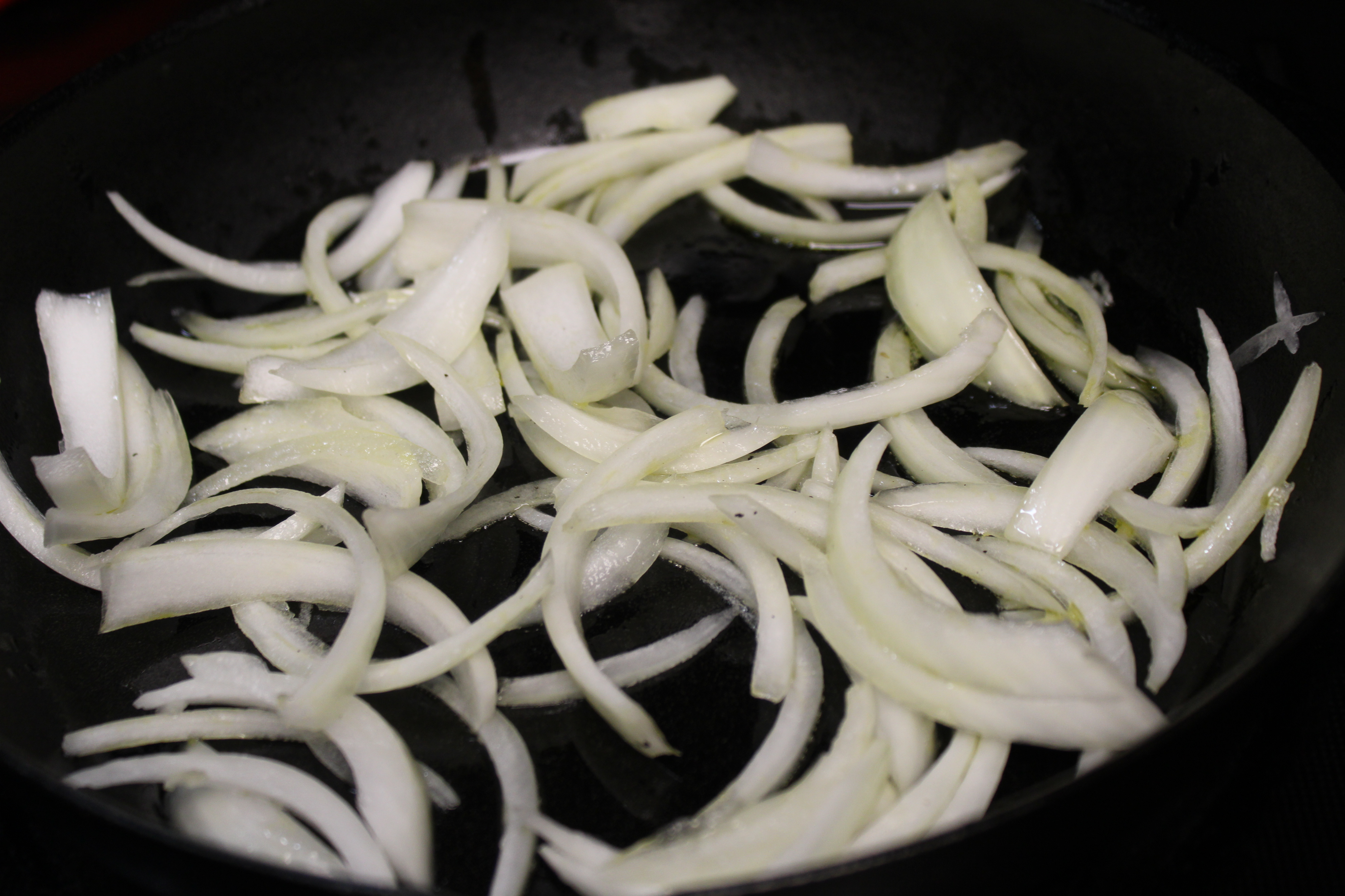 In a cast iron skillet over medium heat, warm oil. Add onion slivers, cook slowly, stirring occasionally, until onions are soft but not yet browned, about 10 minutes or so.