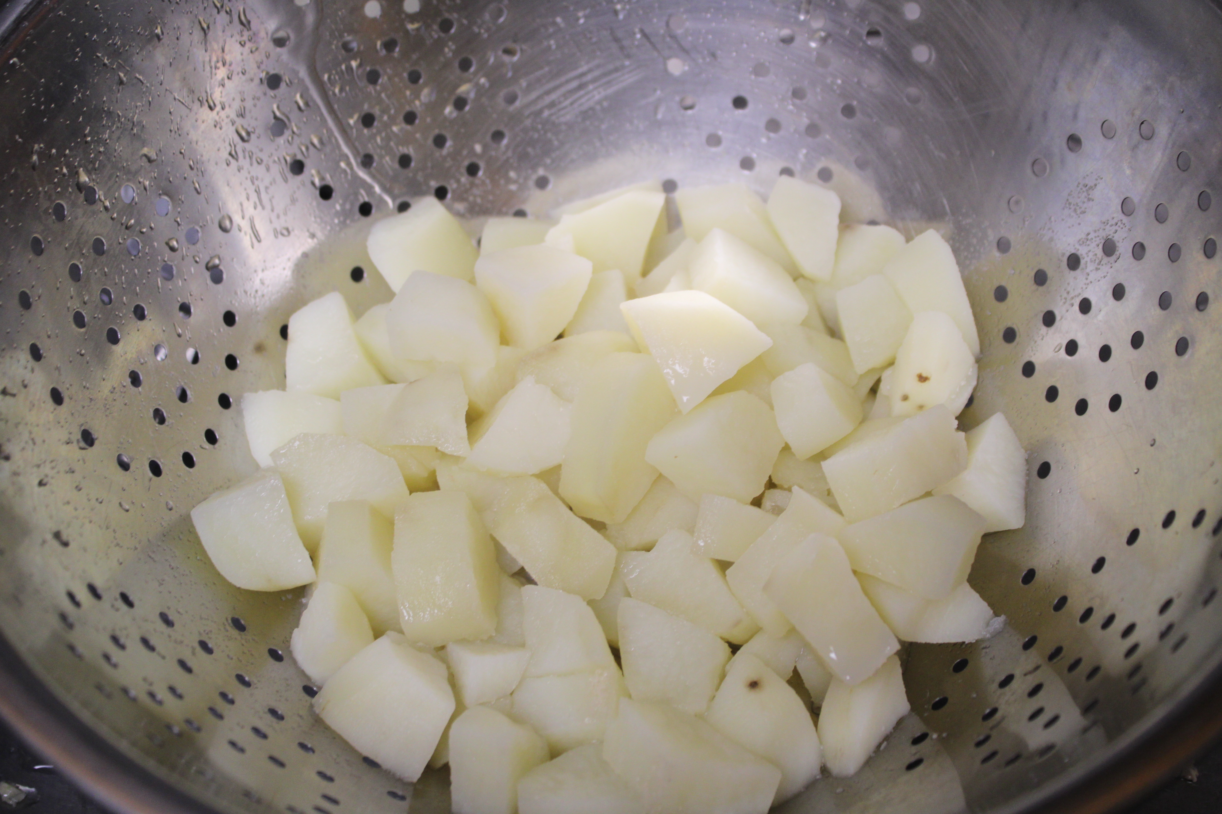 Bring a large pot of salted water to a boil. Add potatoes, cook until tender but still firm, abut 6 minutes or so. Drain and set aside to cool. While the potatoes cook.