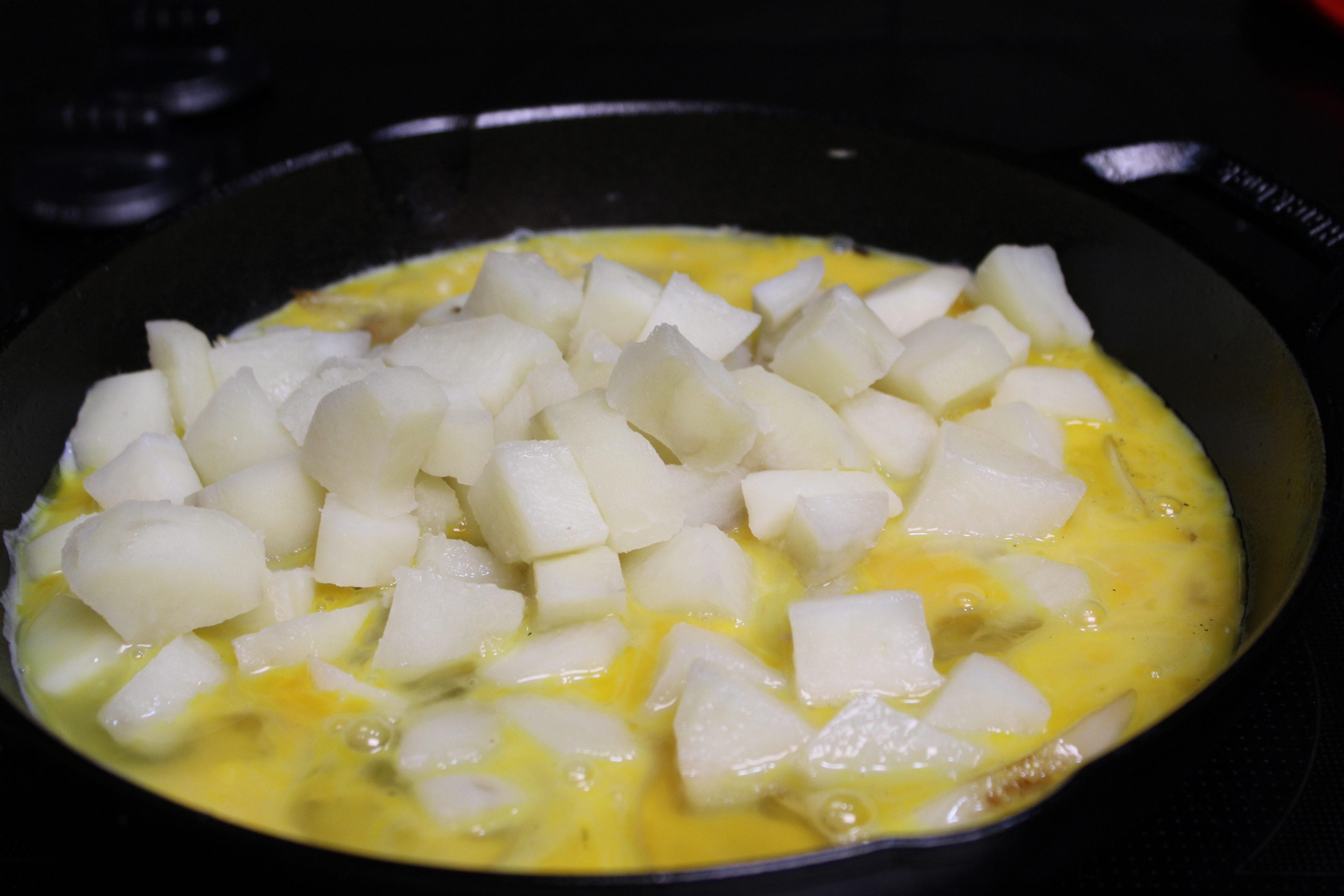 Peel and cube potatoes, set aside. Cut onion in half from root to tip. Save half for another purpose. Peel remaining half, slice into thin slivers. In a bowl, lightly beat eggs.