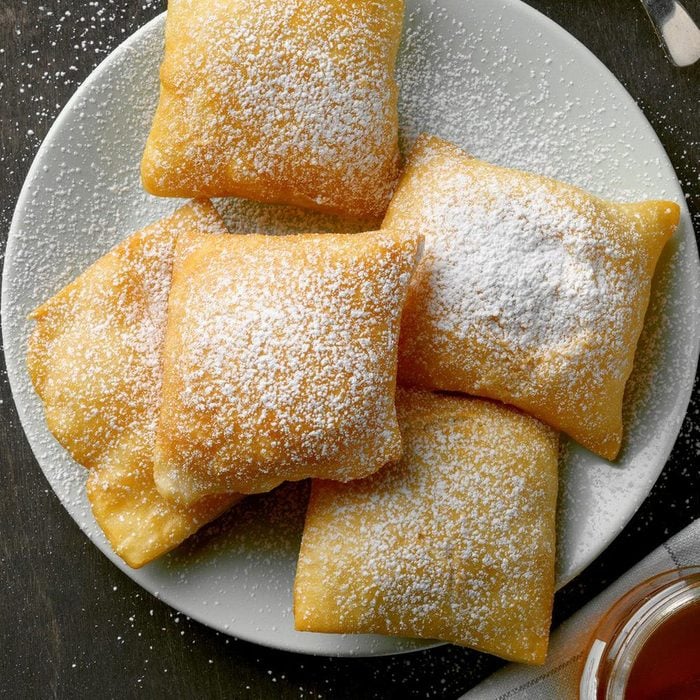 Just before serving, dust with powdered sugar. Serve honey at the table to fill the pastries once opened.