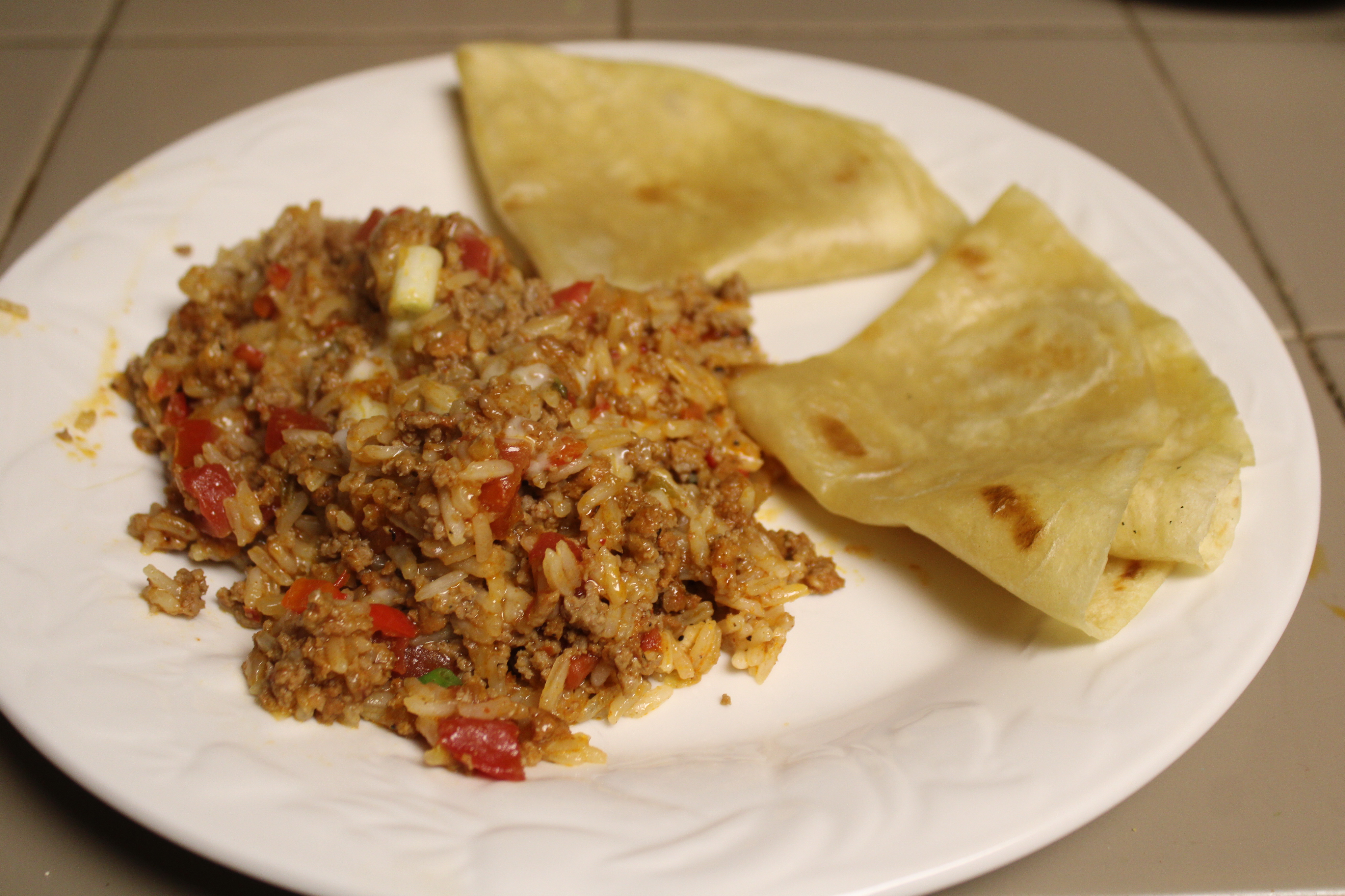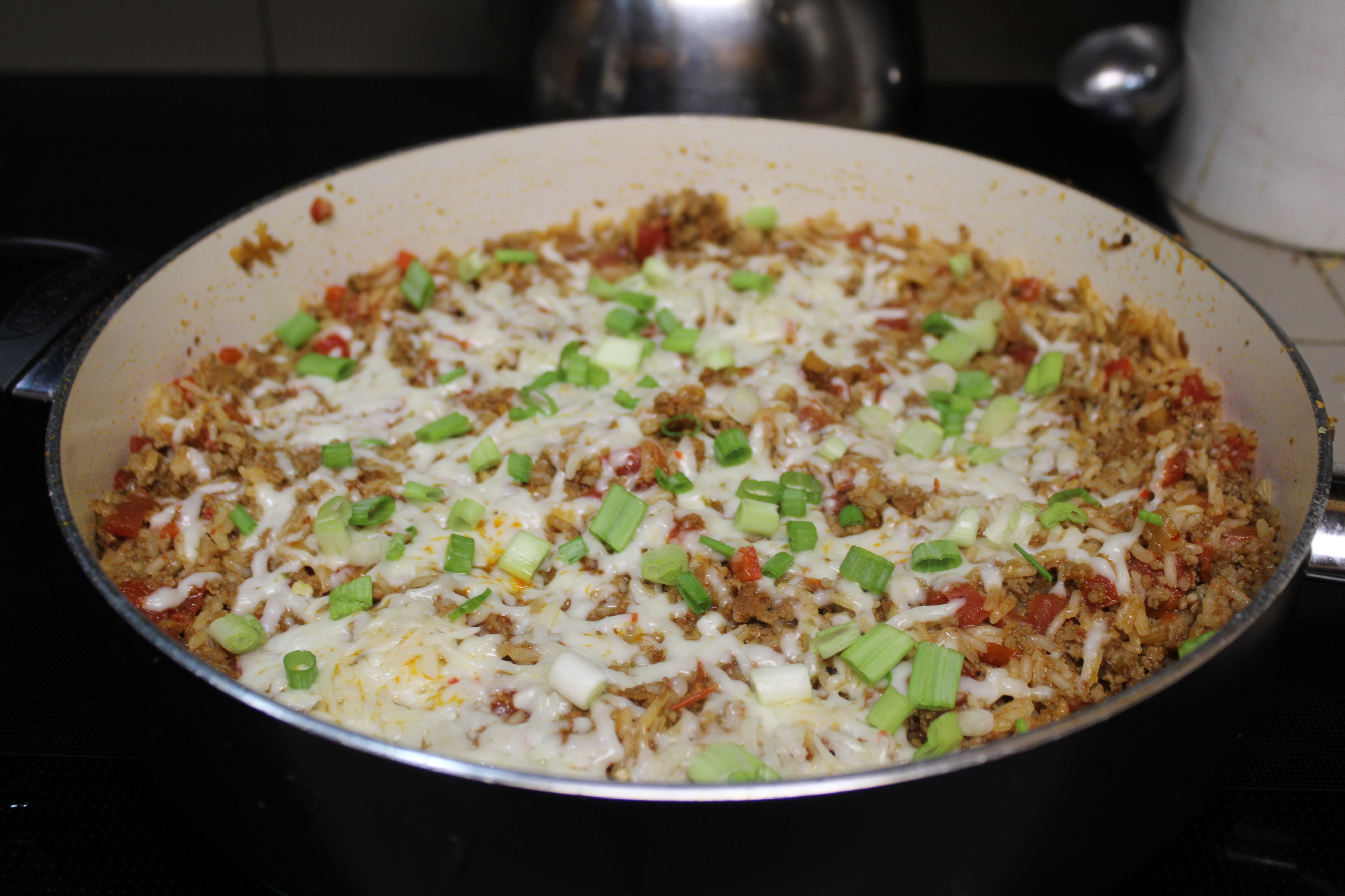 When ready to serve, sprinkle with green onions. Serve warm tortillas on the side to use as a spoon (as I do by tearing off pieces too tortilla to use as a scoop) or create a burrito of the Taco-Rice Skillet Supper.