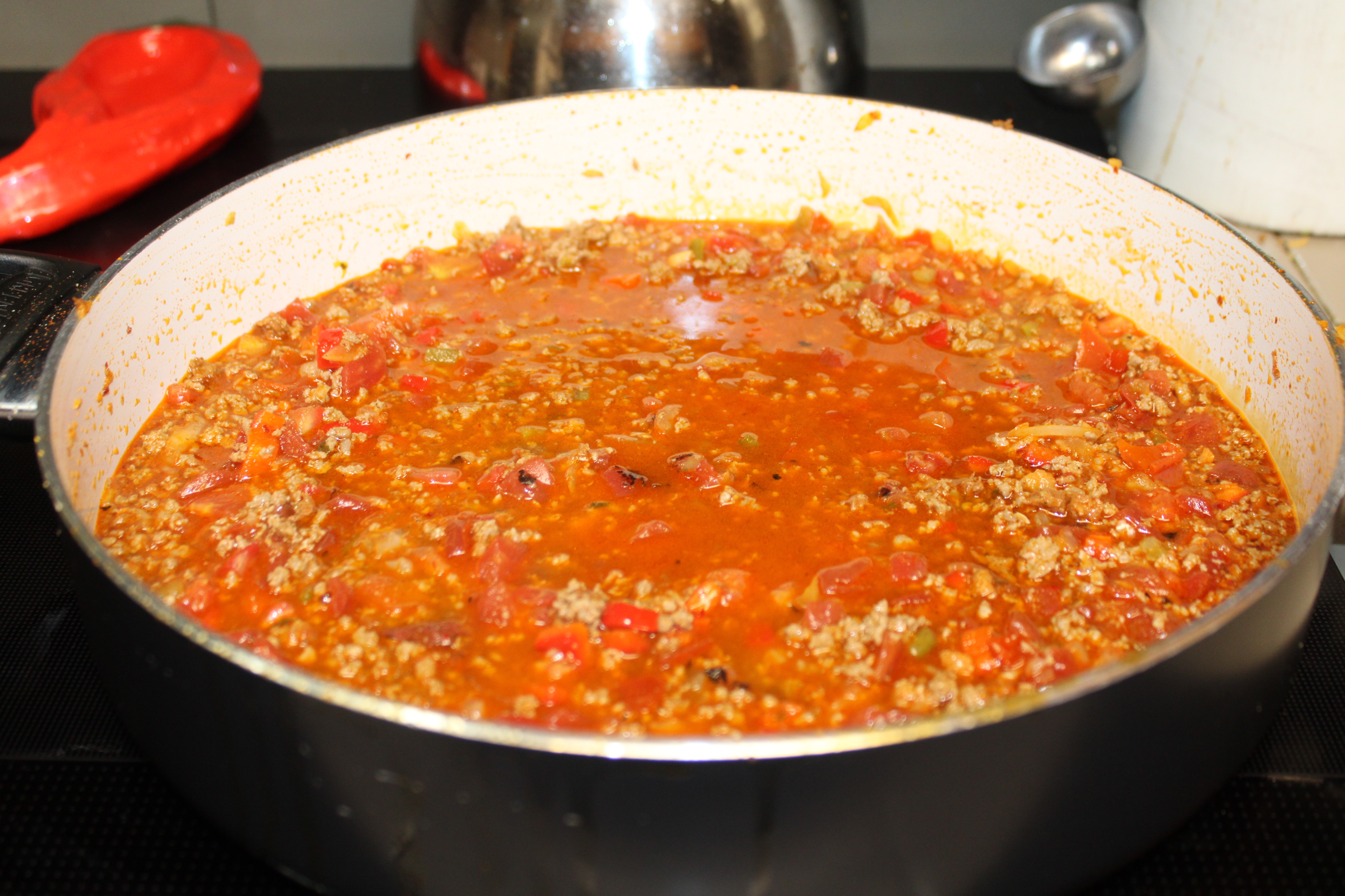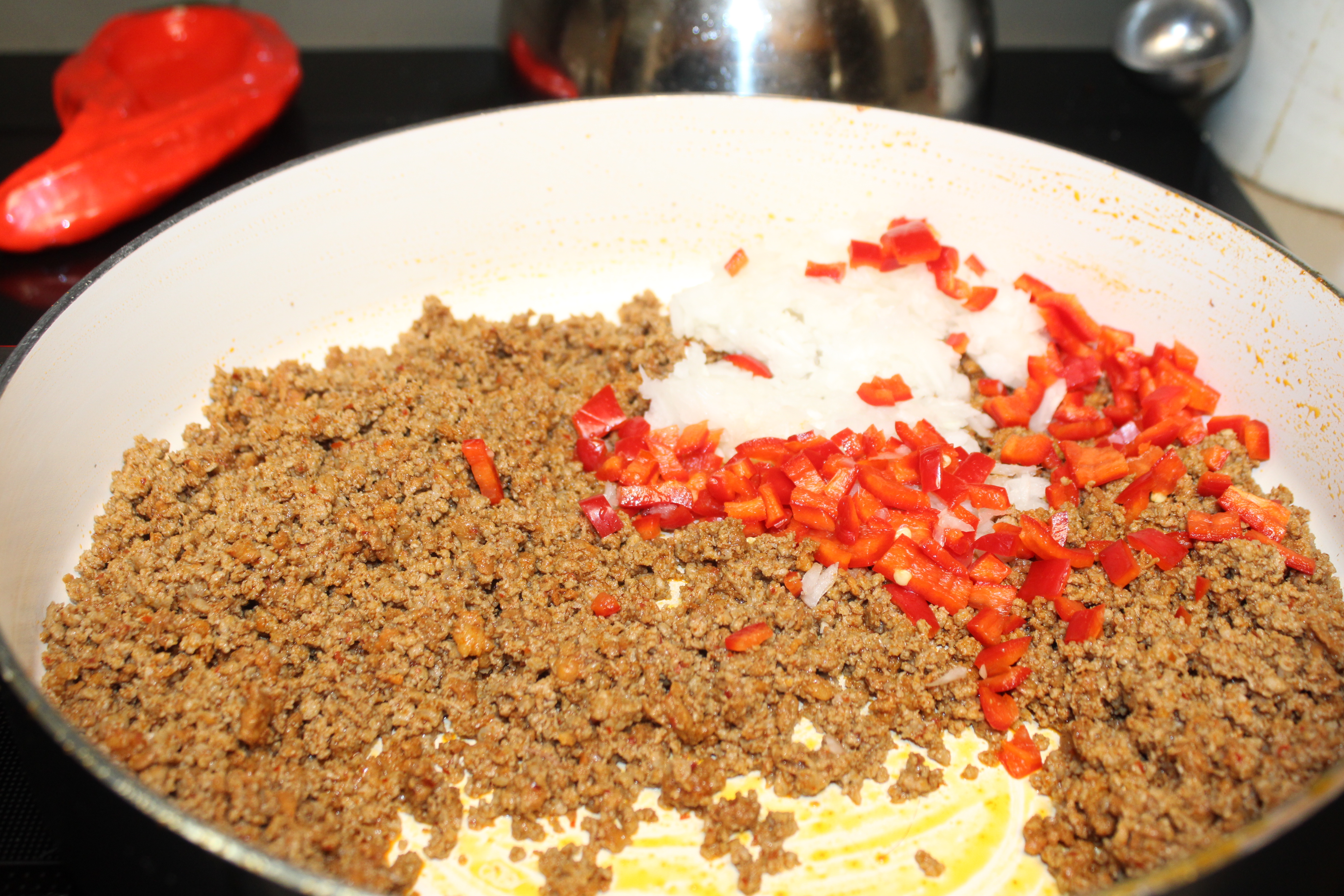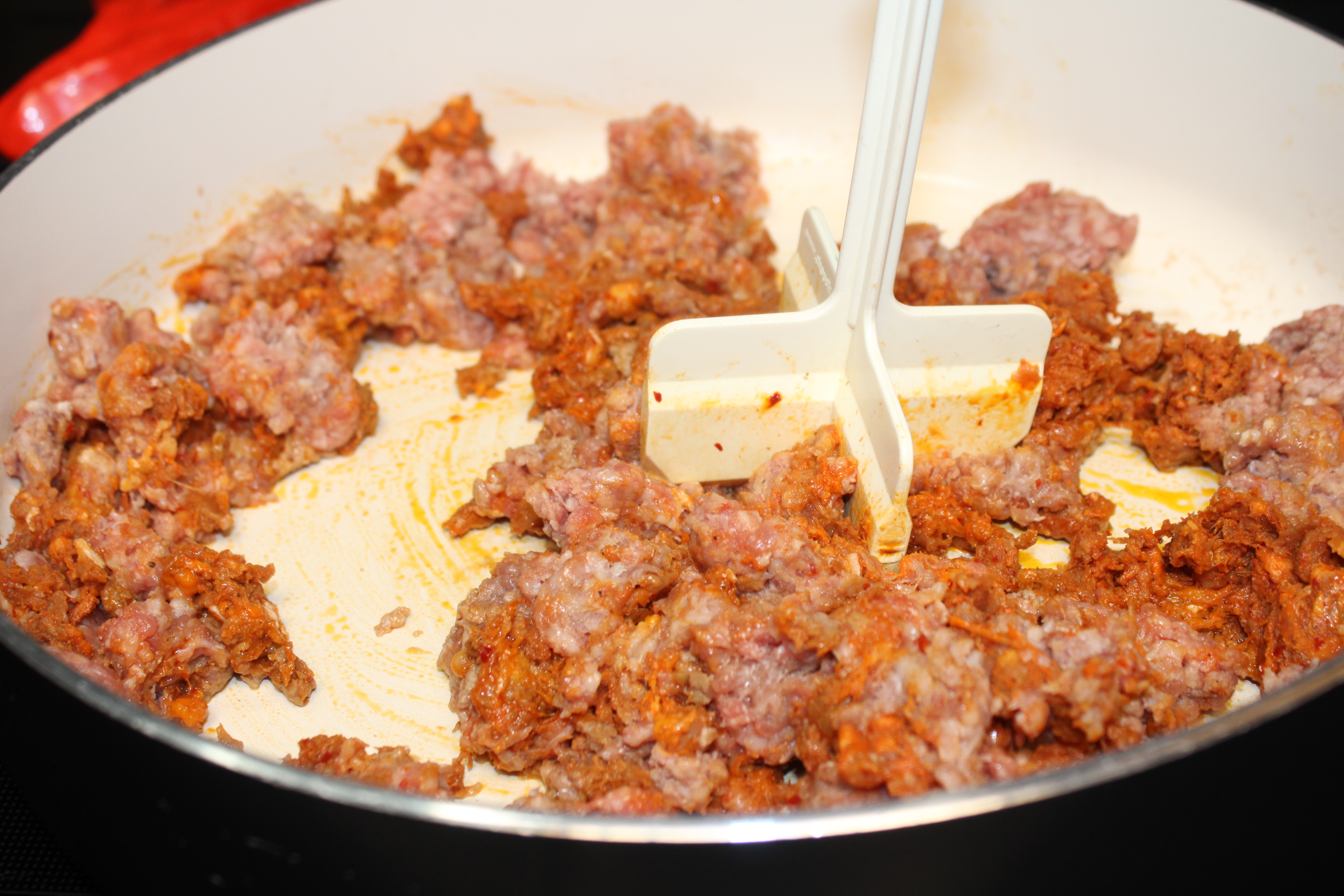 In a large, deep skillet, brown the meats together. When the meat is lightly browned, add the spice mixture. Continue to brown until the meats are cooked through. Drain well, return to skillet. Add the onions and peppers. Cook for 5 minutes or so, until the vegetables begin to soften.