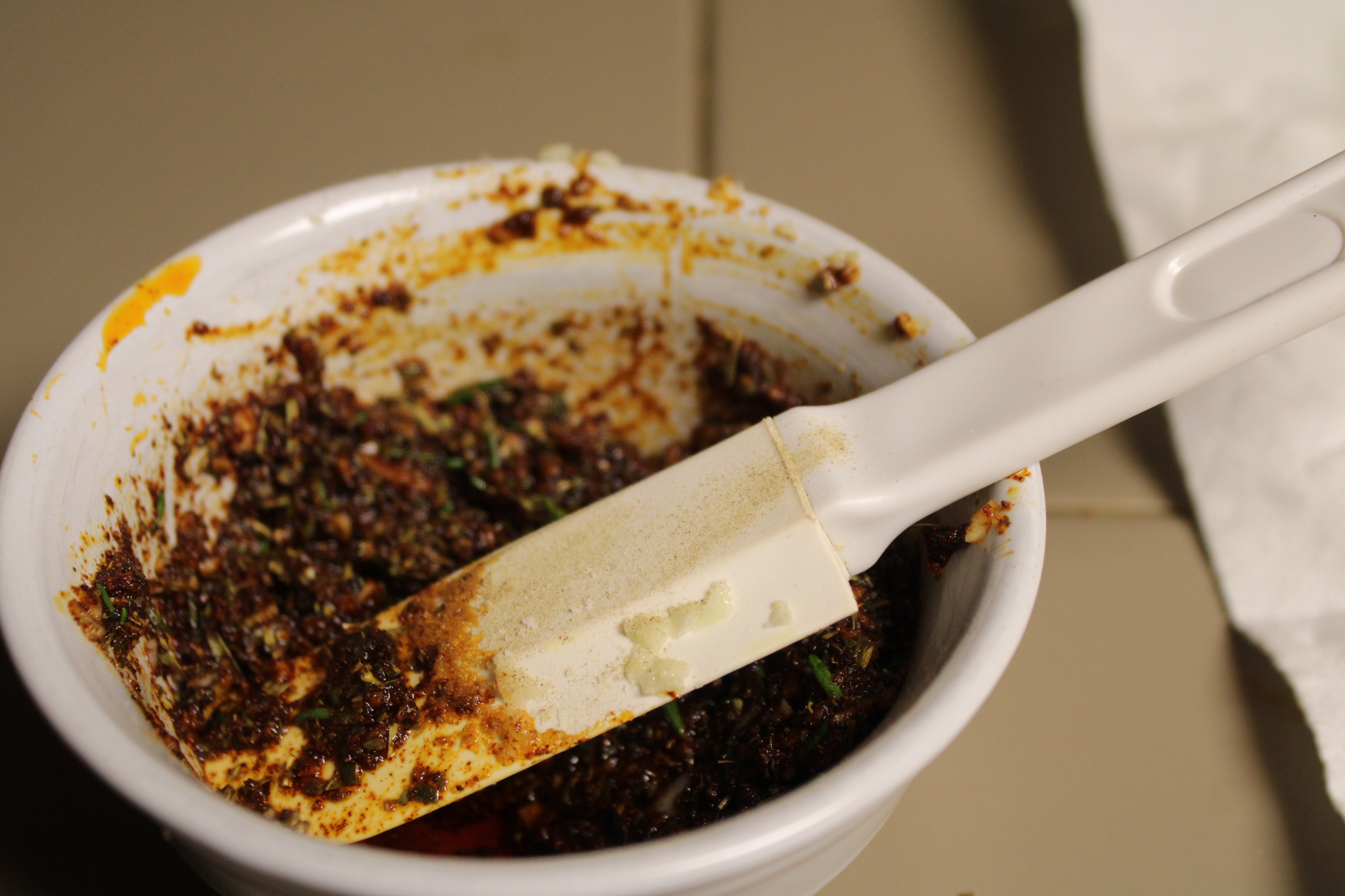 In a small bowl, combine minced garlic with paprika, marjoram, basil, tarragon, parsley and sage rub. Strip fresh Rosemary from sprigs, dice and add to the garlic herb mixture. Add olive oil a little at a time to form a paste. Season with salt and pepper to taste. Set the herb paste aside.