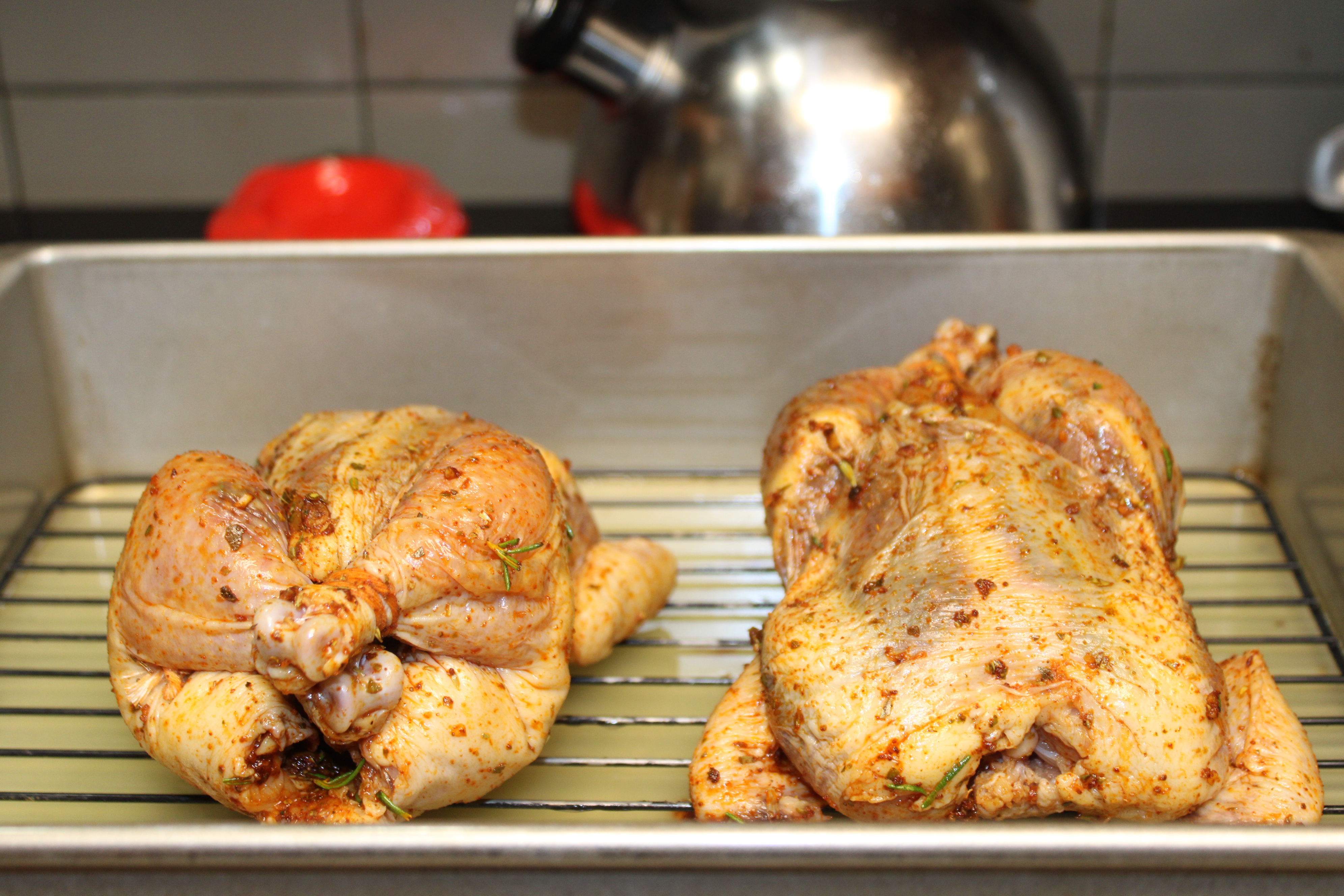 Gently loosen the skin of the breasts, thighs and legs beginning at the neck, taking care not to tear the skin. Rub about 3/4 of the past under the skin over the breast, thigh and leg meat Gently pat skin into place. Rub remaining paste on the skin over the entire birds. Tie legs together, tuck wing tips under the body. Place hens breast side up on a rack in a roasting pan.