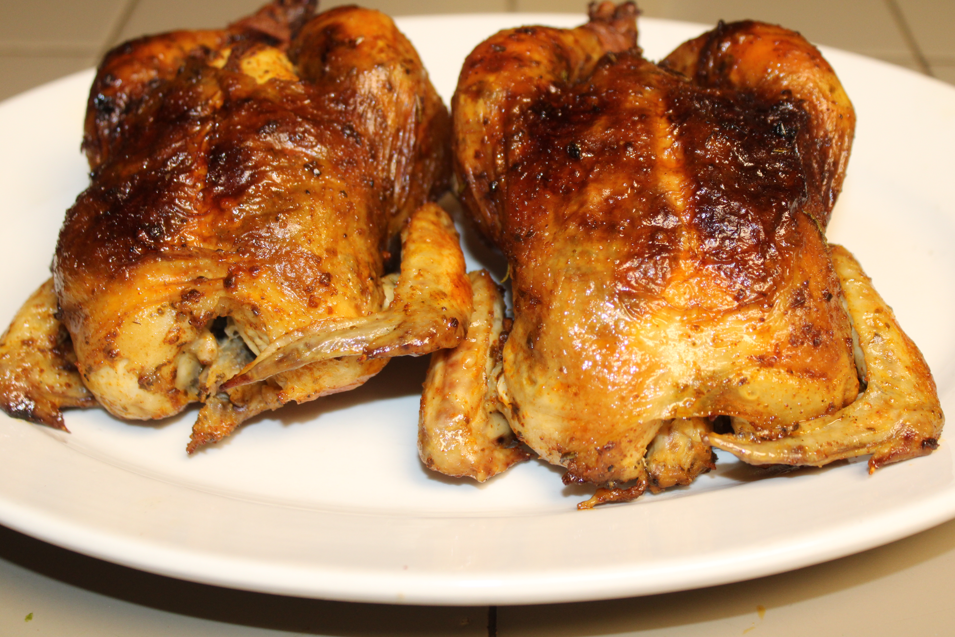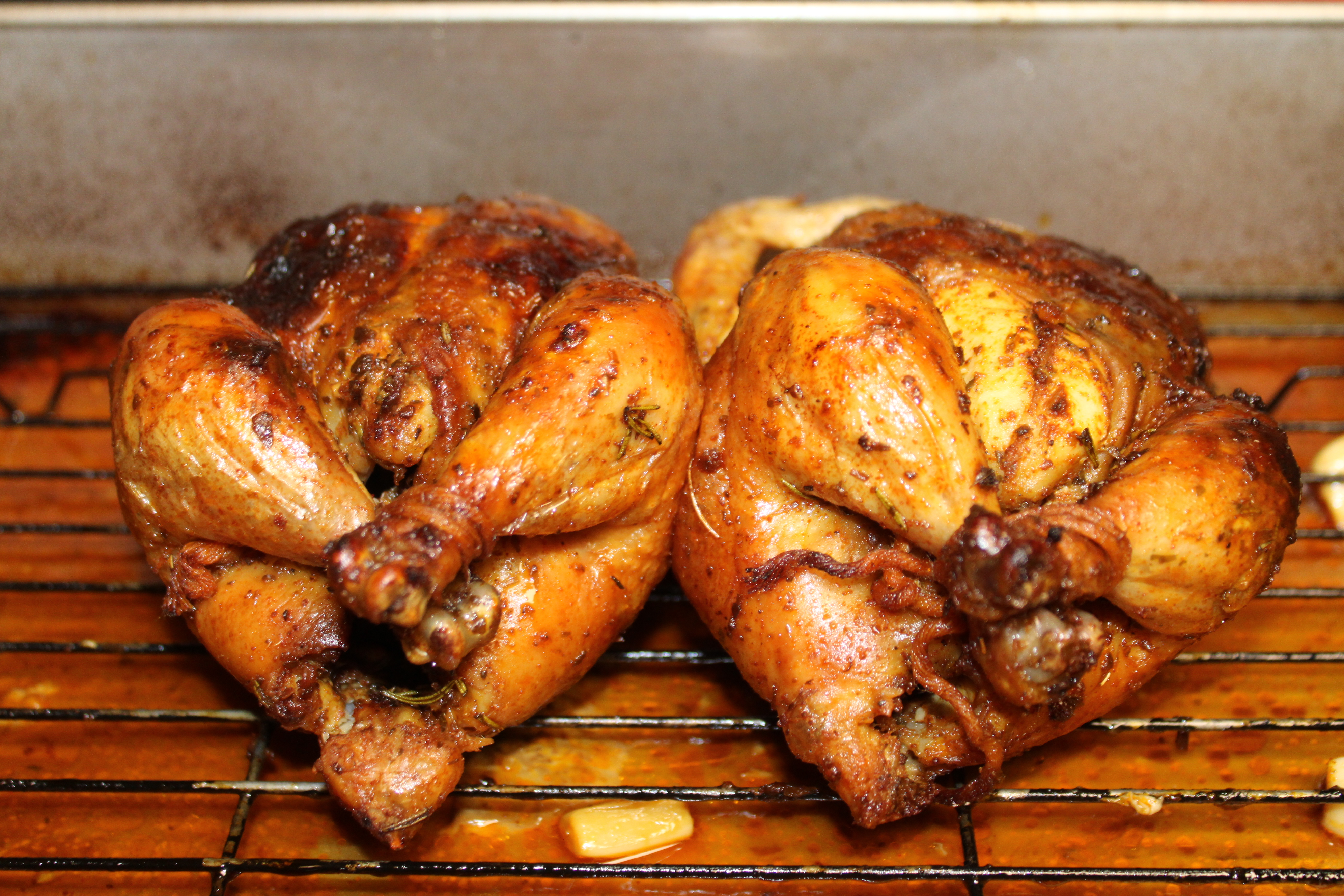 Uncover again, increase oven temperature to 425-degrees. Roast hens until tender and golden, about 12 minutes longer.