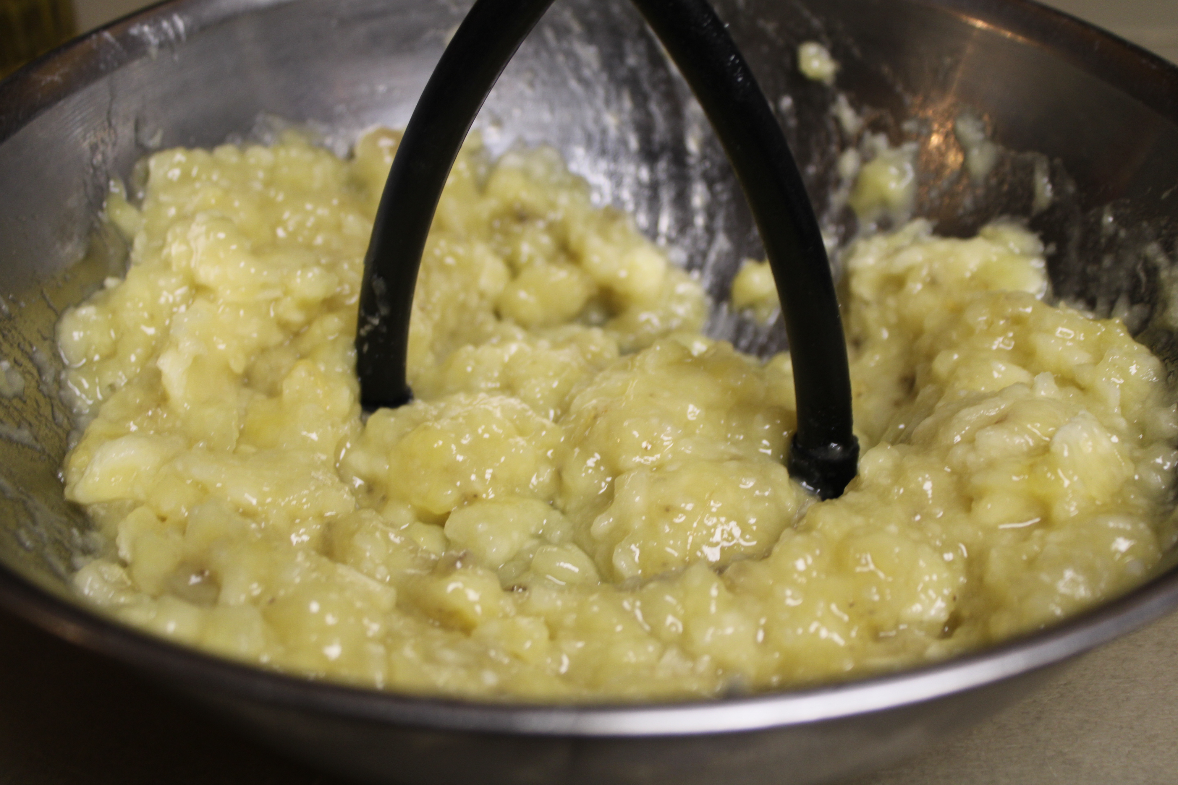 Peel and mash bananas, place in the bowl of a stand mixer. Add sugar, eggs, vanilla and oil to the mixer. Beat on medium speed until smooth, about a minute.
