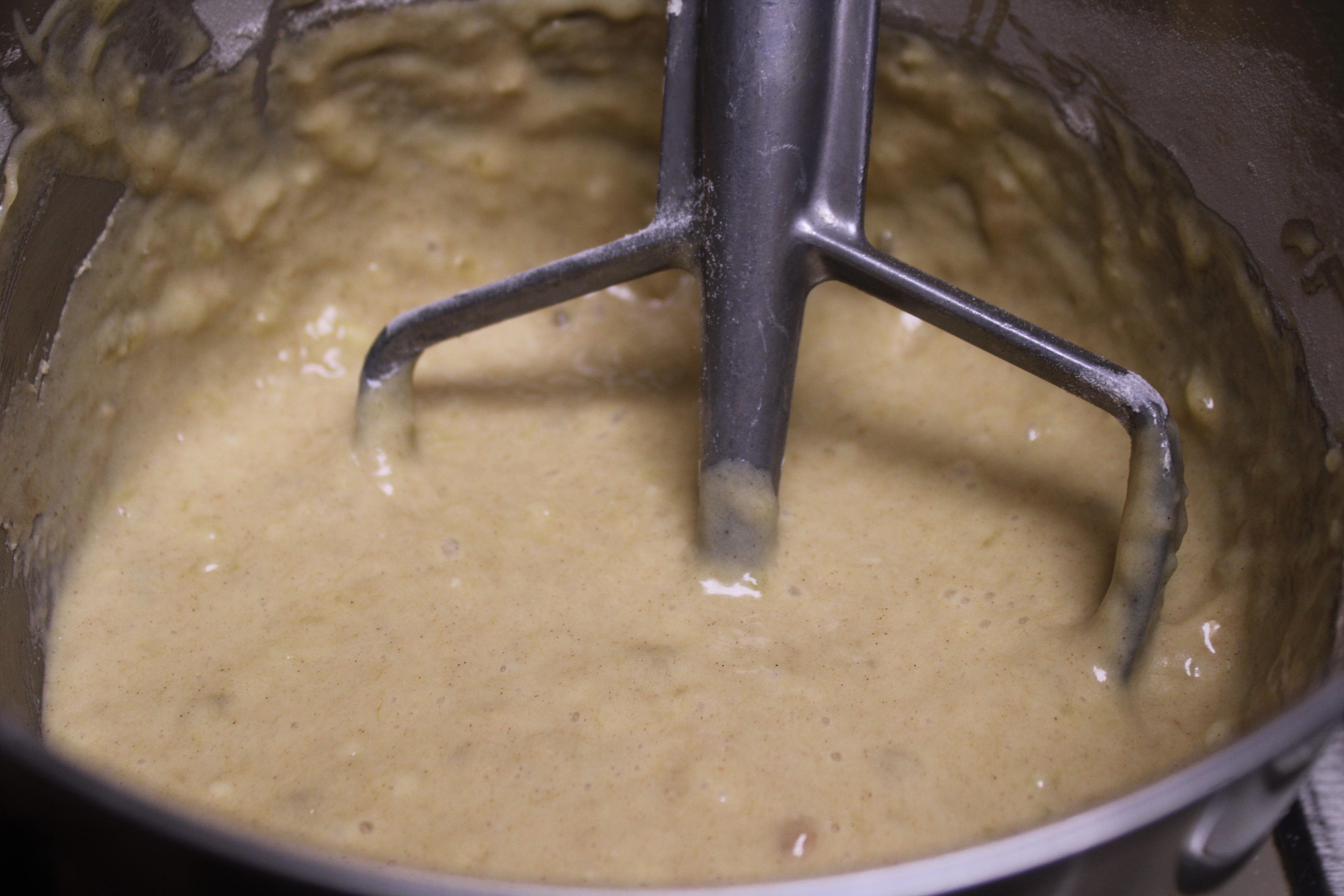 Sift together the flour, baking powder, baking soda, salt and cinnamon in a large bowl. Add flour mixture to the banana mixture. Mix on low speed until just combined, about 30 seconds.