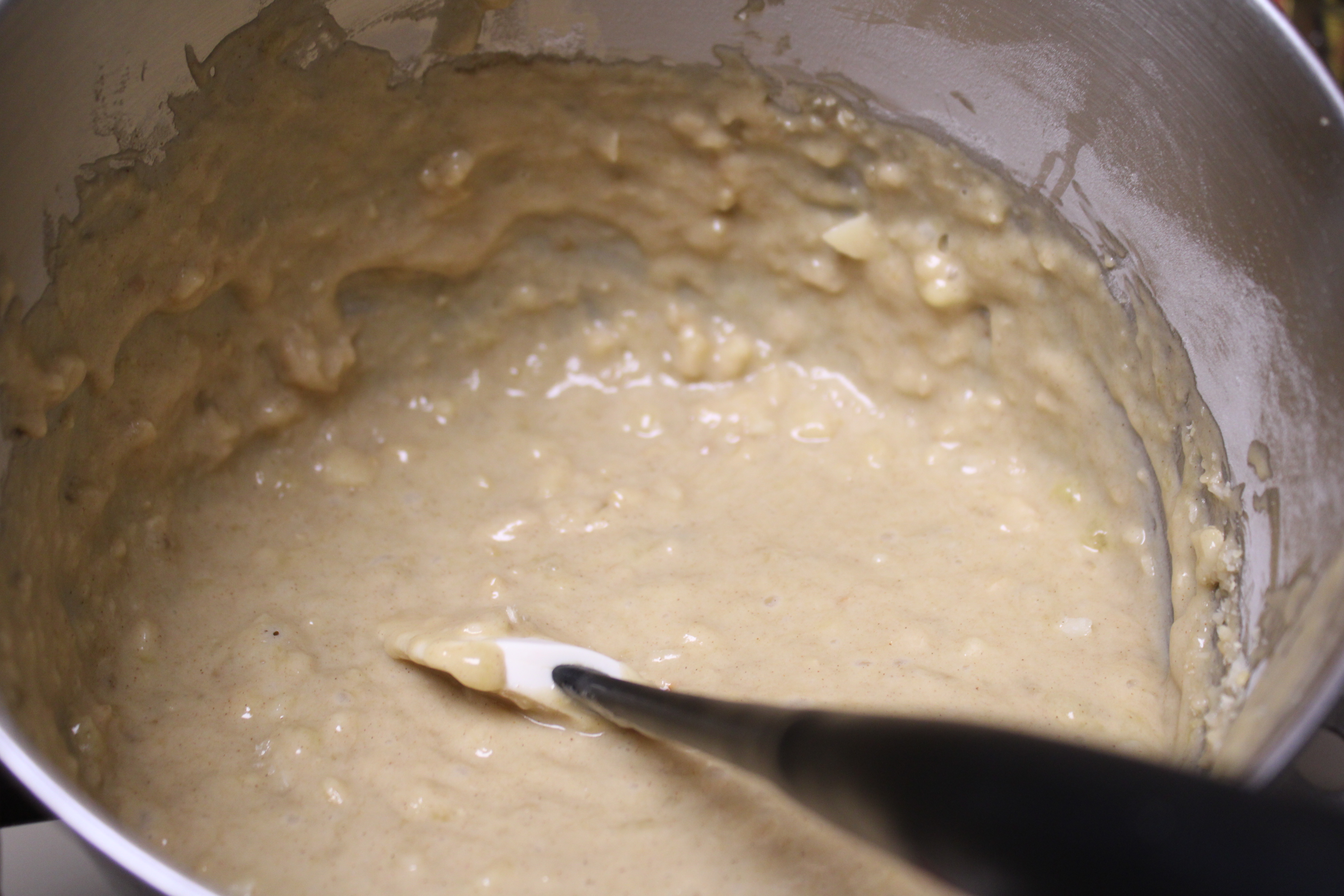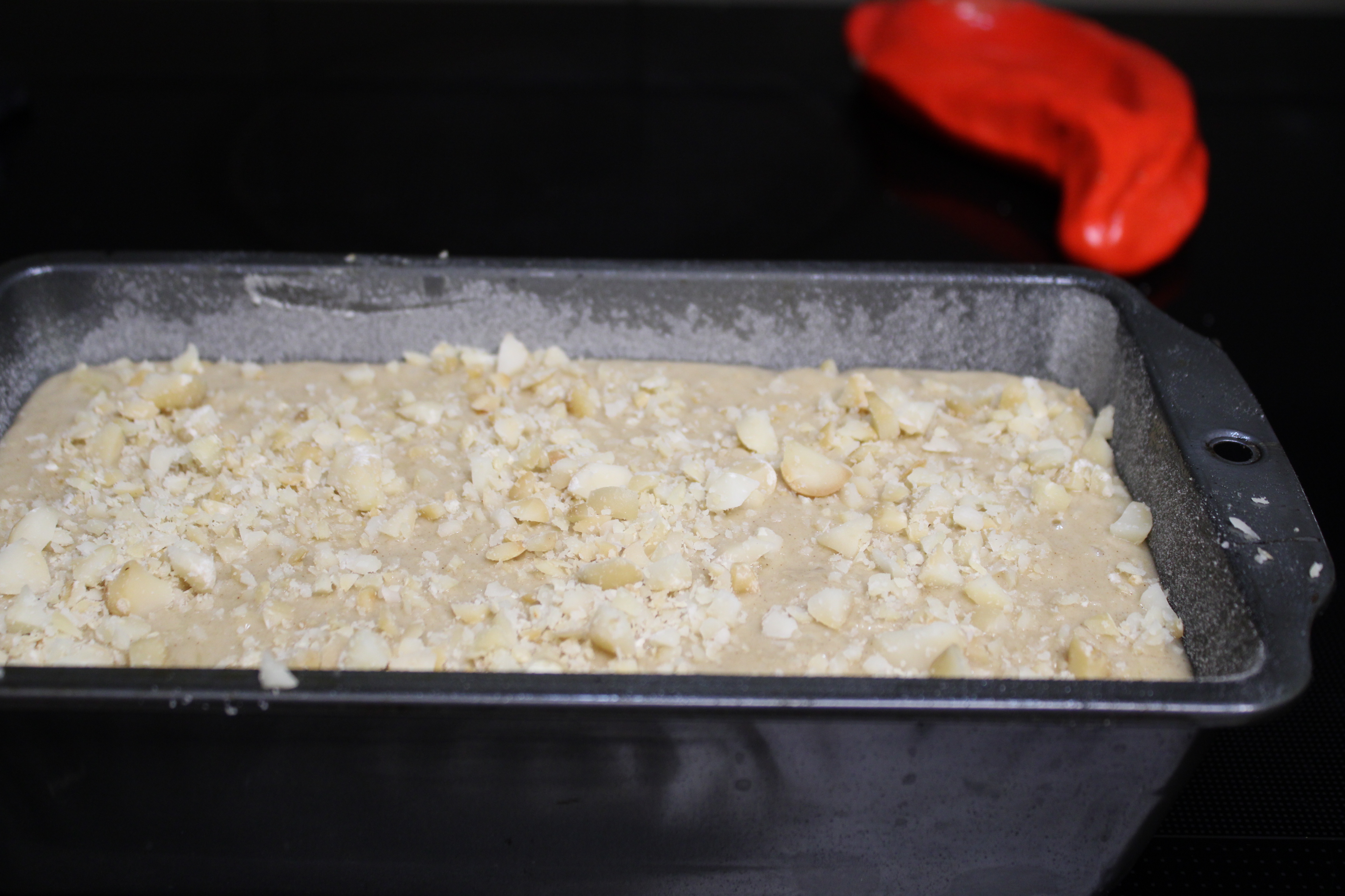 Chop macadamia nuts. With a rubber spatula, fold 3/4 cup chopped nuts into the banana bread mixture. Pour mixture into the prepared loaf pan.