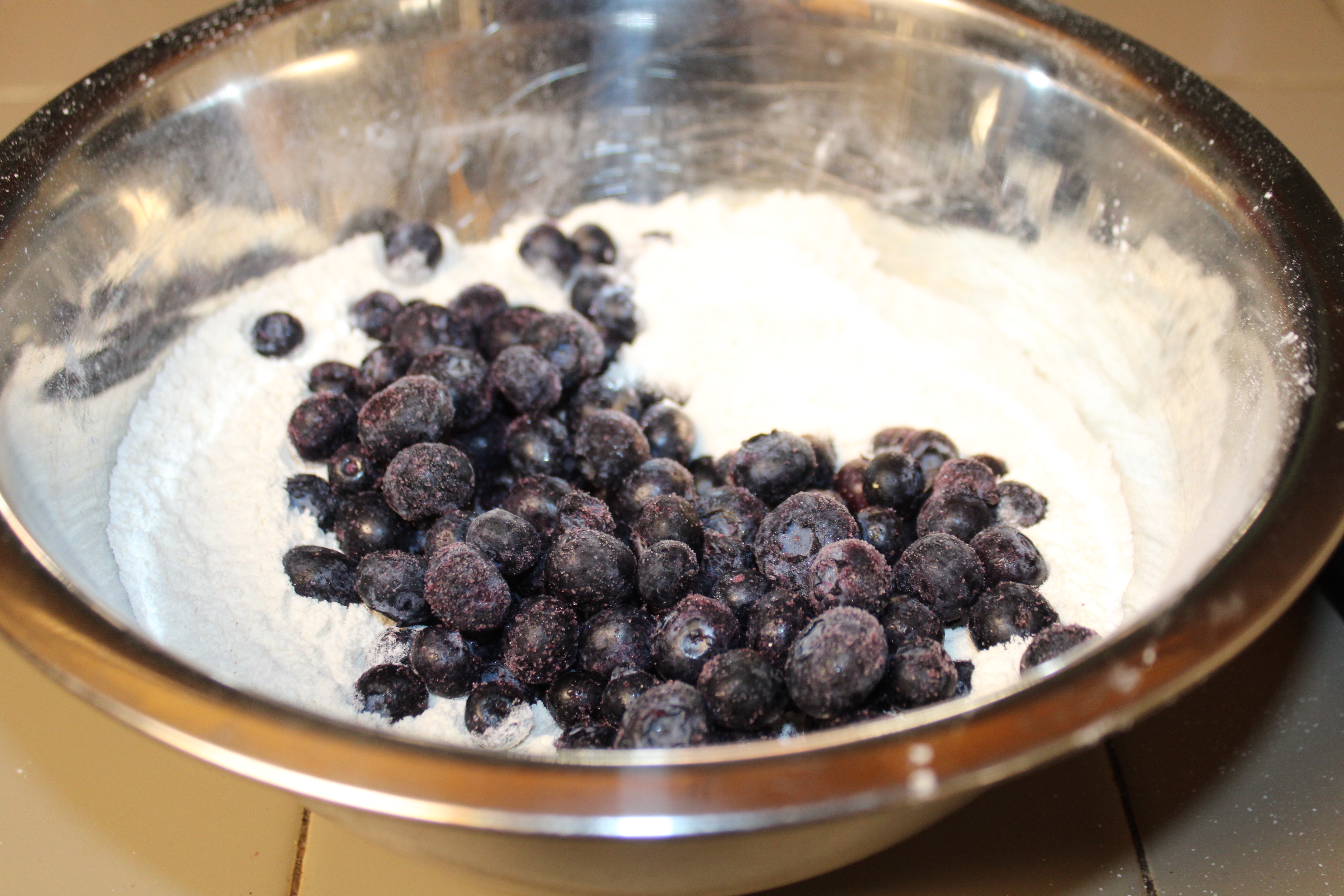 Melt butter; allow to cool. Whisk the flour, baking powder and salt together in a medium bowl until combined. Add the berries to the flour mixture; gently toss just to combine. Set aside.
