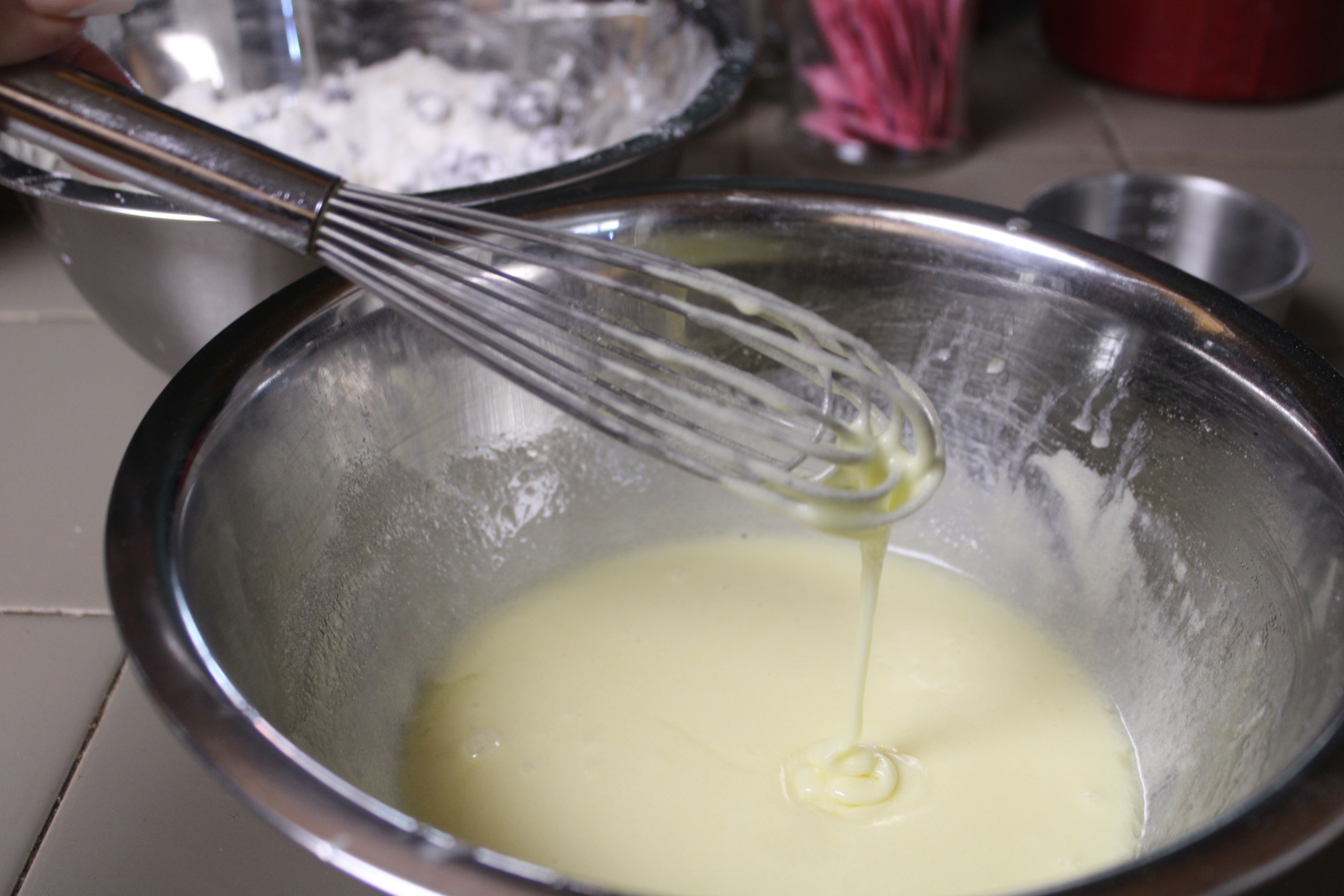 In a separate bowl, whisk egg until light in color; about 20 seconds. Add the sugar to the egg, whisk vigorously until thick, another 20 seconds or so. Add melted butter into the egg mixture in 2 additions, whisking to combine after each addition. Add sour cream in 2 additions, whisk until just combined.