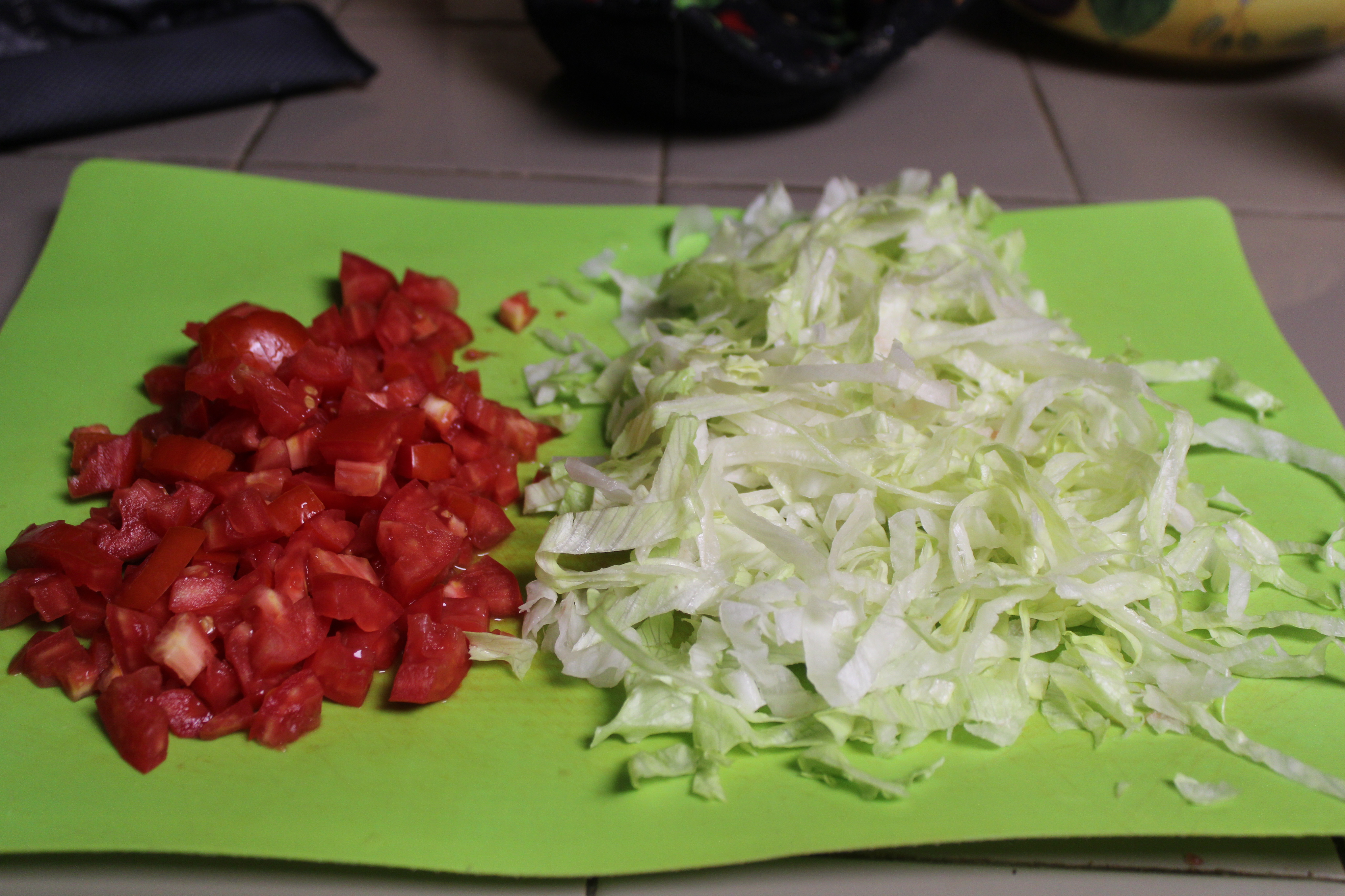 While the chicken cooks, stack lettuce leaves, roll tight and shred. Seed and dice tomatoes, set aside.