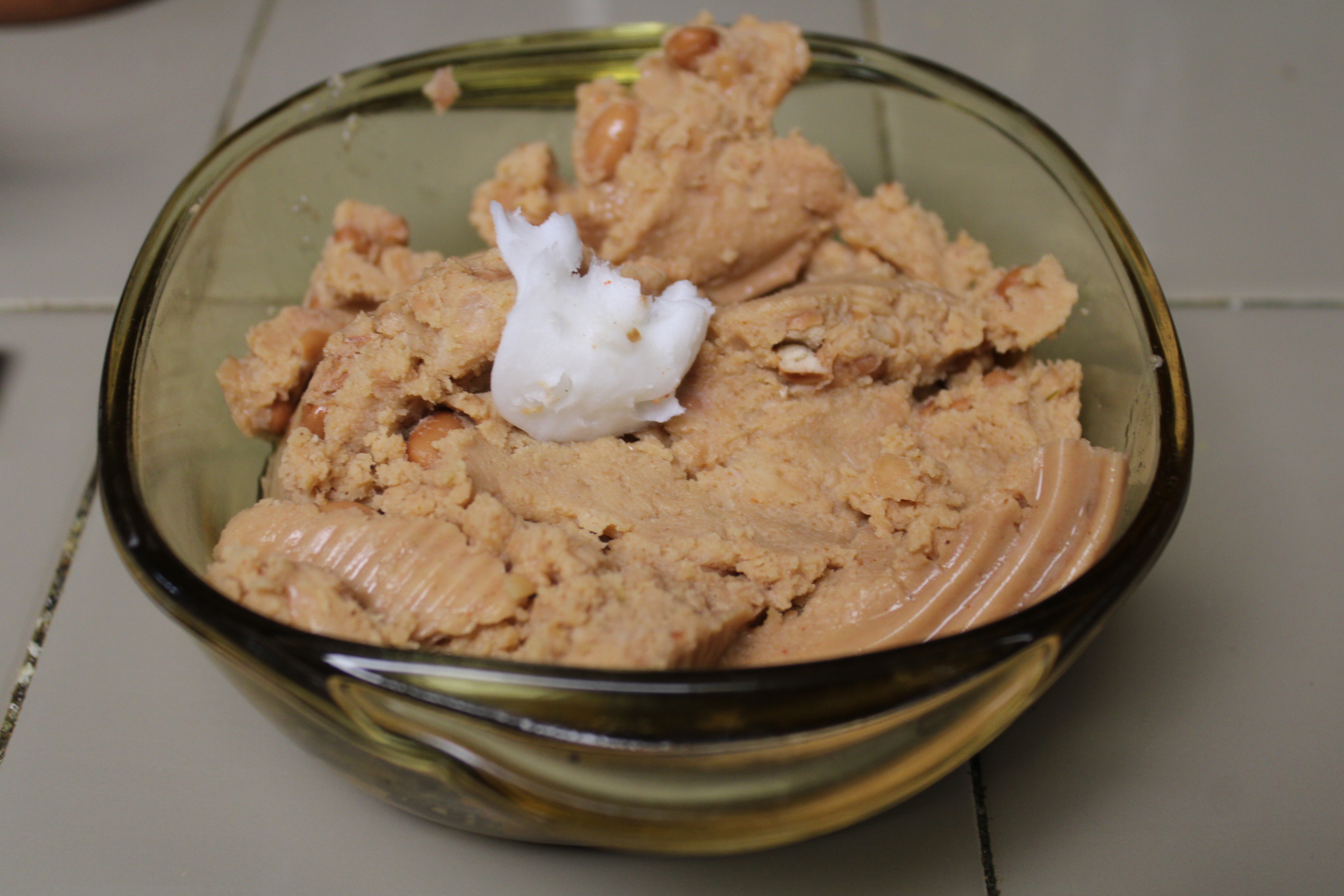 In a microwave safe bowl, top refried beans with lard. Cover and heat for 4 minutes, stirring half way through. The lard will thin the beans, making them more spreadable.