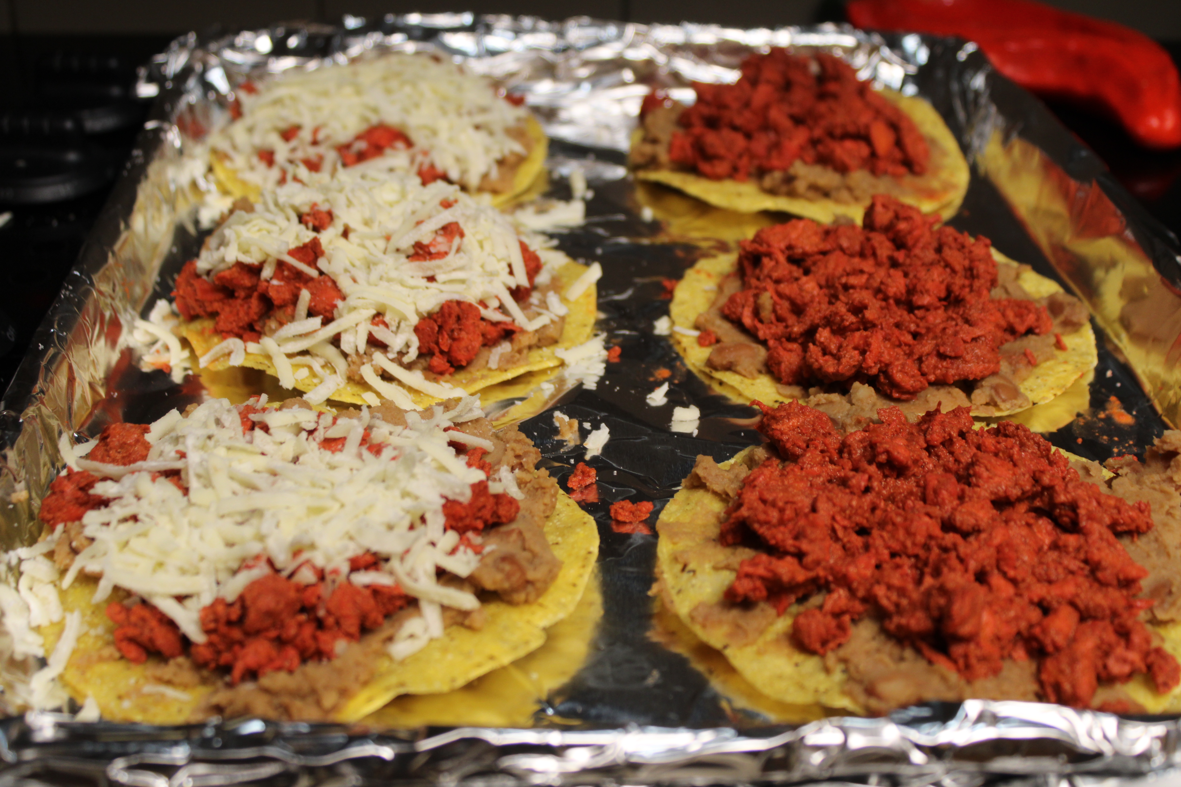 Place in the oven to bake for about 6 minutes or until nicely warmed. Remove from oven, top with shredded lettuce, diced tomatoes, minced Jalapeño and a scattering of Cotija Cheese.