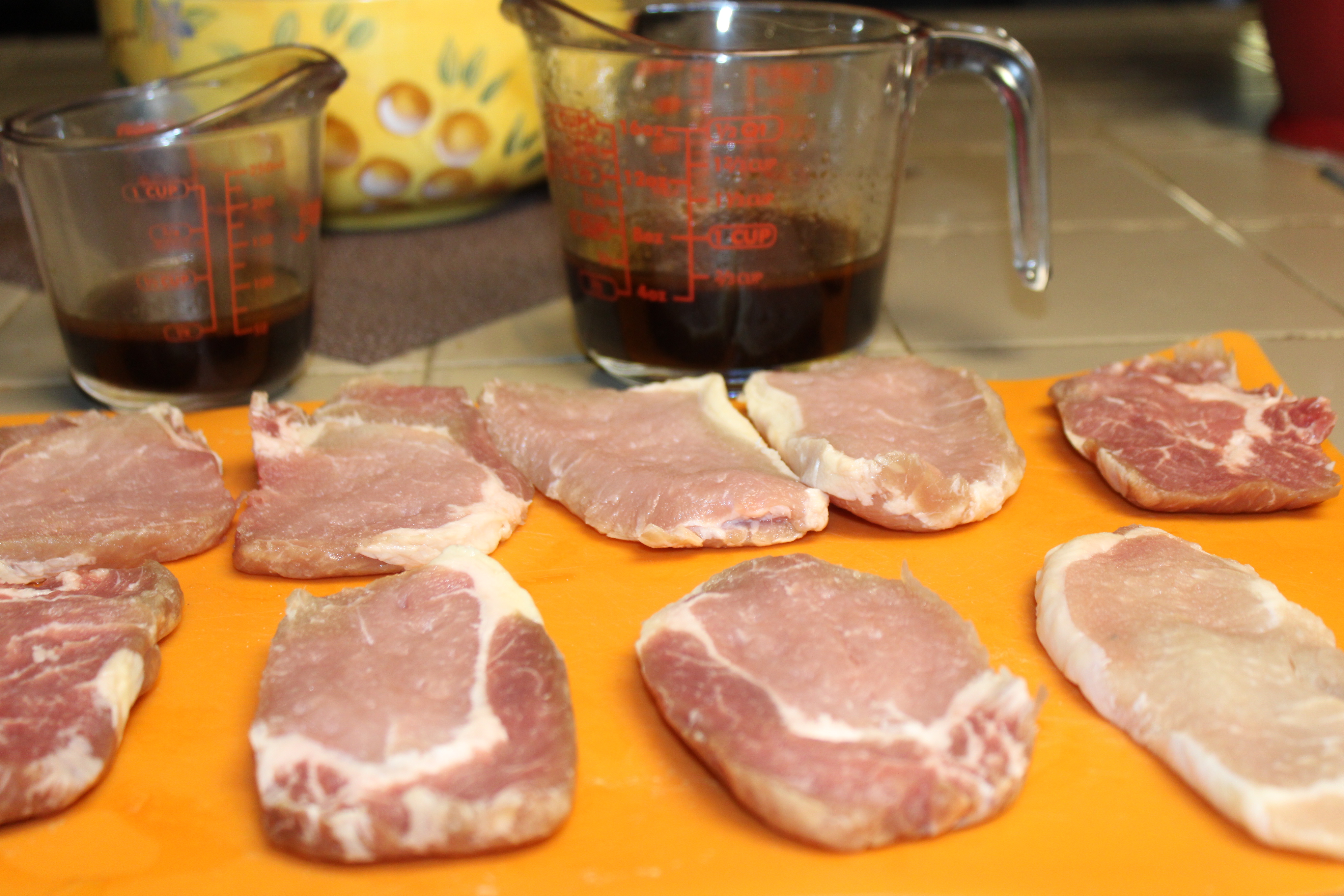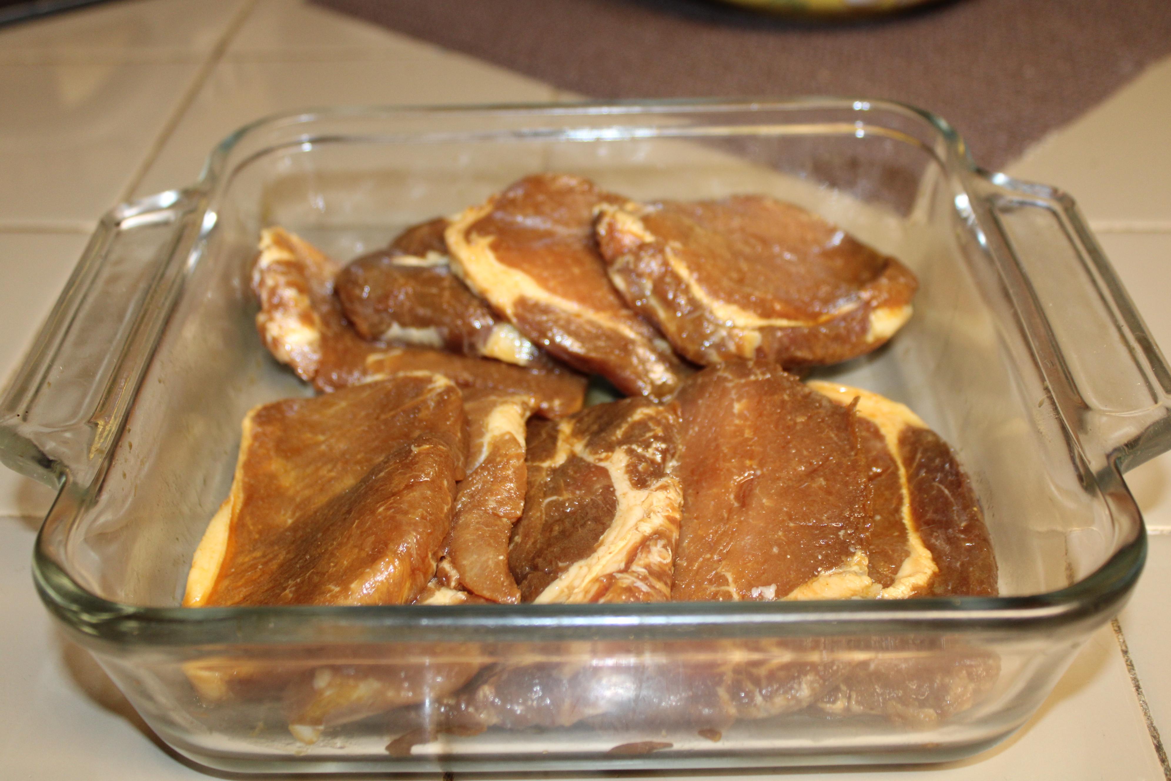 Pierce pork chops on both sided with a fork, set aside. In 2-cup glass measuring cup, combine Soy Sauce, Brown Sugar, Lemon Juice, Oil, Ginger and Garlic Powder. Whisk to fully combine. Reserve a quarter cup of the marinade for basting, pour remaining marinade into a gallon-size ziplock bag. Place bag into a casserole dish to prevent leaking.