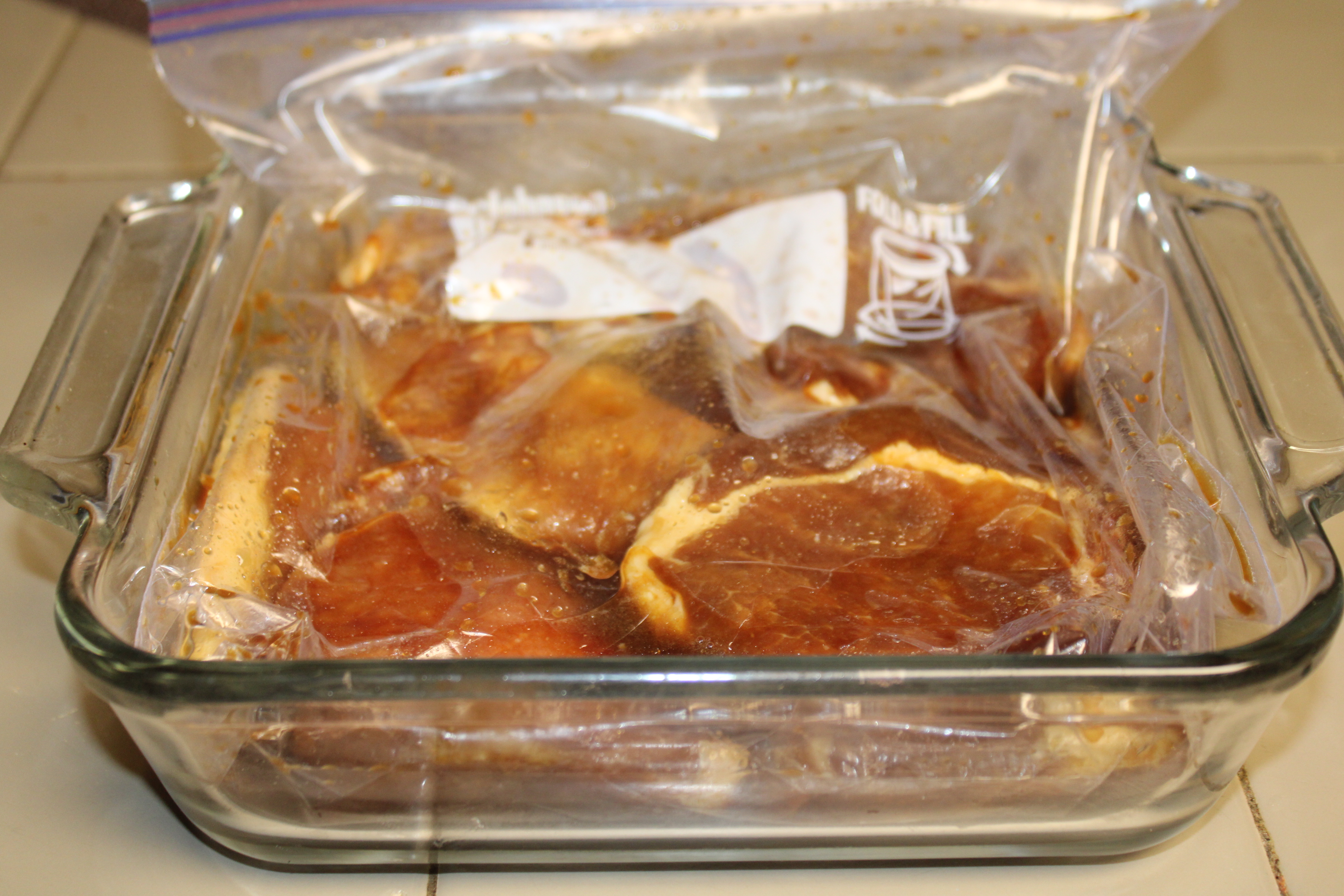 Add pork chops to the bag, coat in marinade. Squeeze out excess air, seal bag. Place in the refrigerator to marinate for 6 hours or over night.