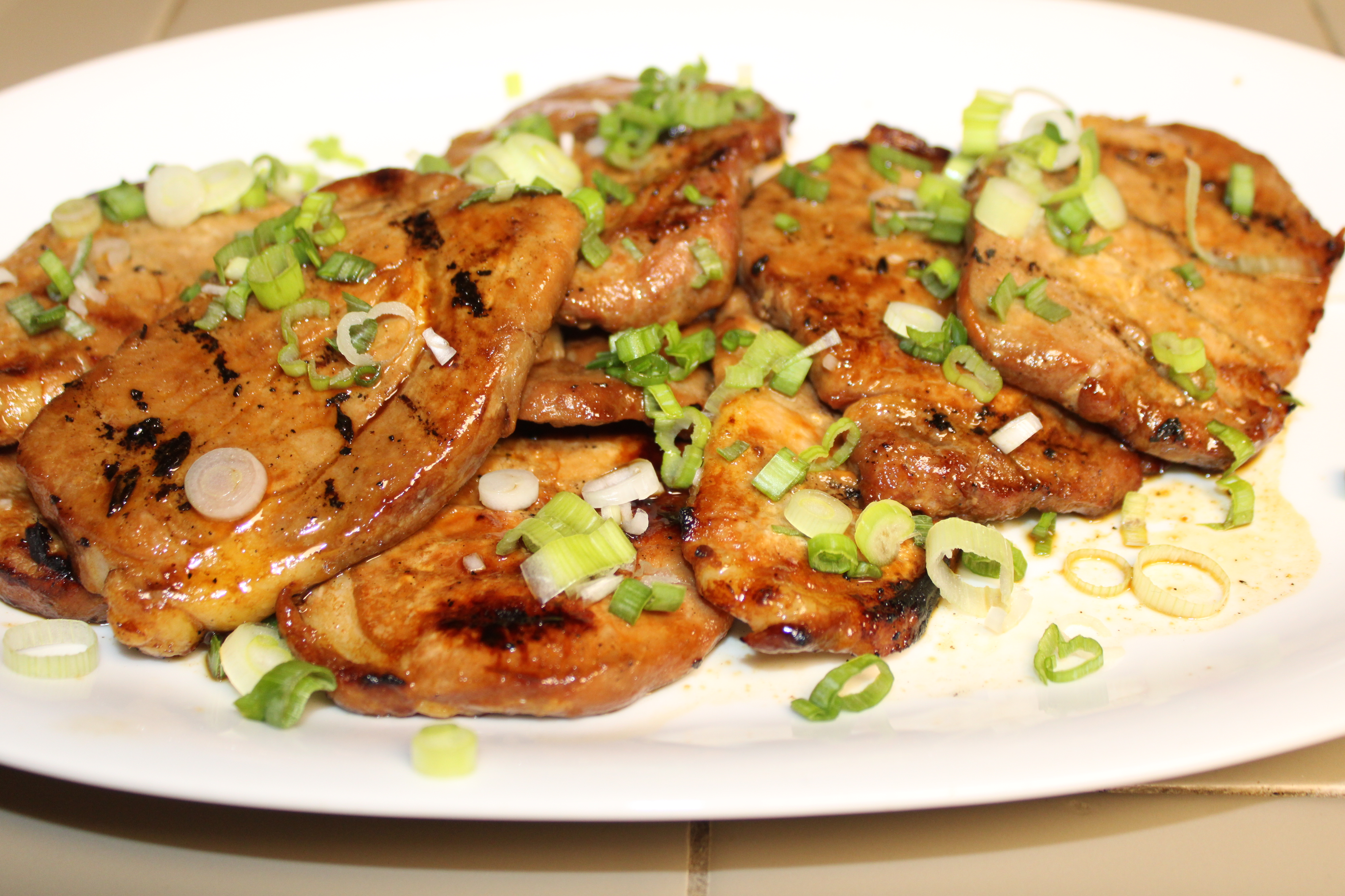 Grill pork chops, basting often with the reserved marinade mixture, until cooked through and no longer pink, about 5 minutes per side. Arrange pork chops on a serving platter. Snip green onions, scatter over chops just before serving.