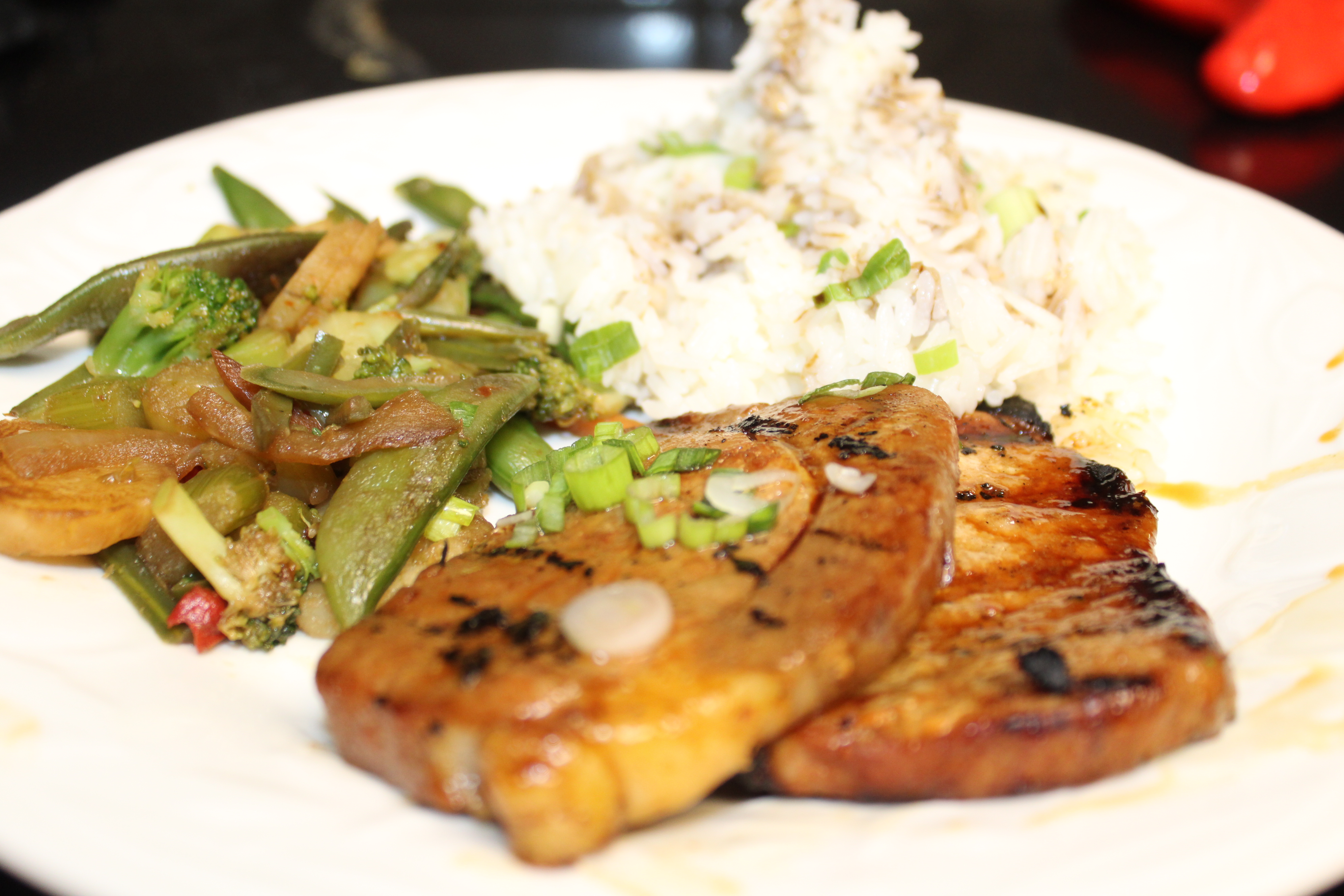 Serve chops with Stir Fry Vegetables of choice and sticky rice.