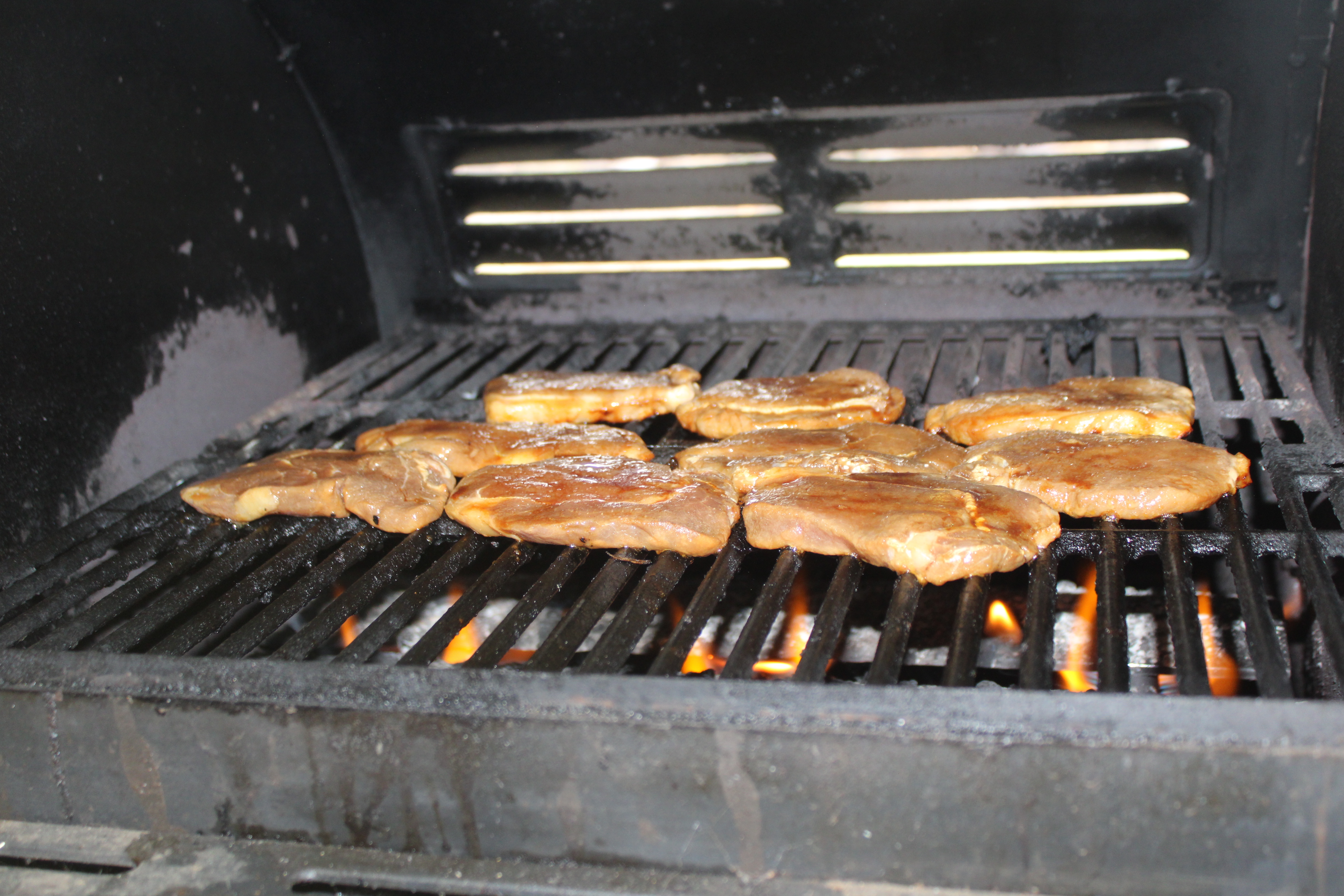 When ready, heat an outdoor grill for high-heat direct cooking. Lightly oil grate to prevent sticking. Remove pork chops from the marinade, allowing excess marinade to drip back into the bag. Place pork chops on the prepared grill, discarding marinade in the bag.